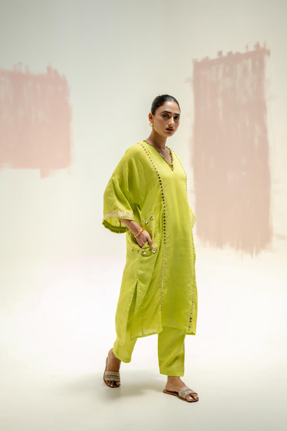 The Sublime Neon Choga Kurta Set offers the perfect blend of style and sophistication. With hand-embroidered pockets and a distinctive Choga silhouette, the kurta is paired with slim linen pants, making it an ideal choice for all-day festivities