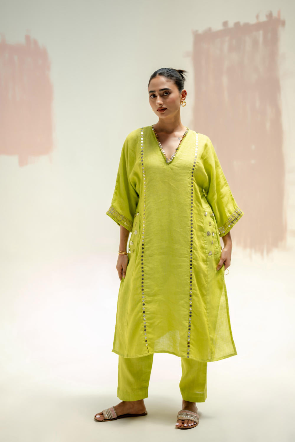 Embroidery Details: Hand-embroidered cuffs, adorned with sequins and threadwork