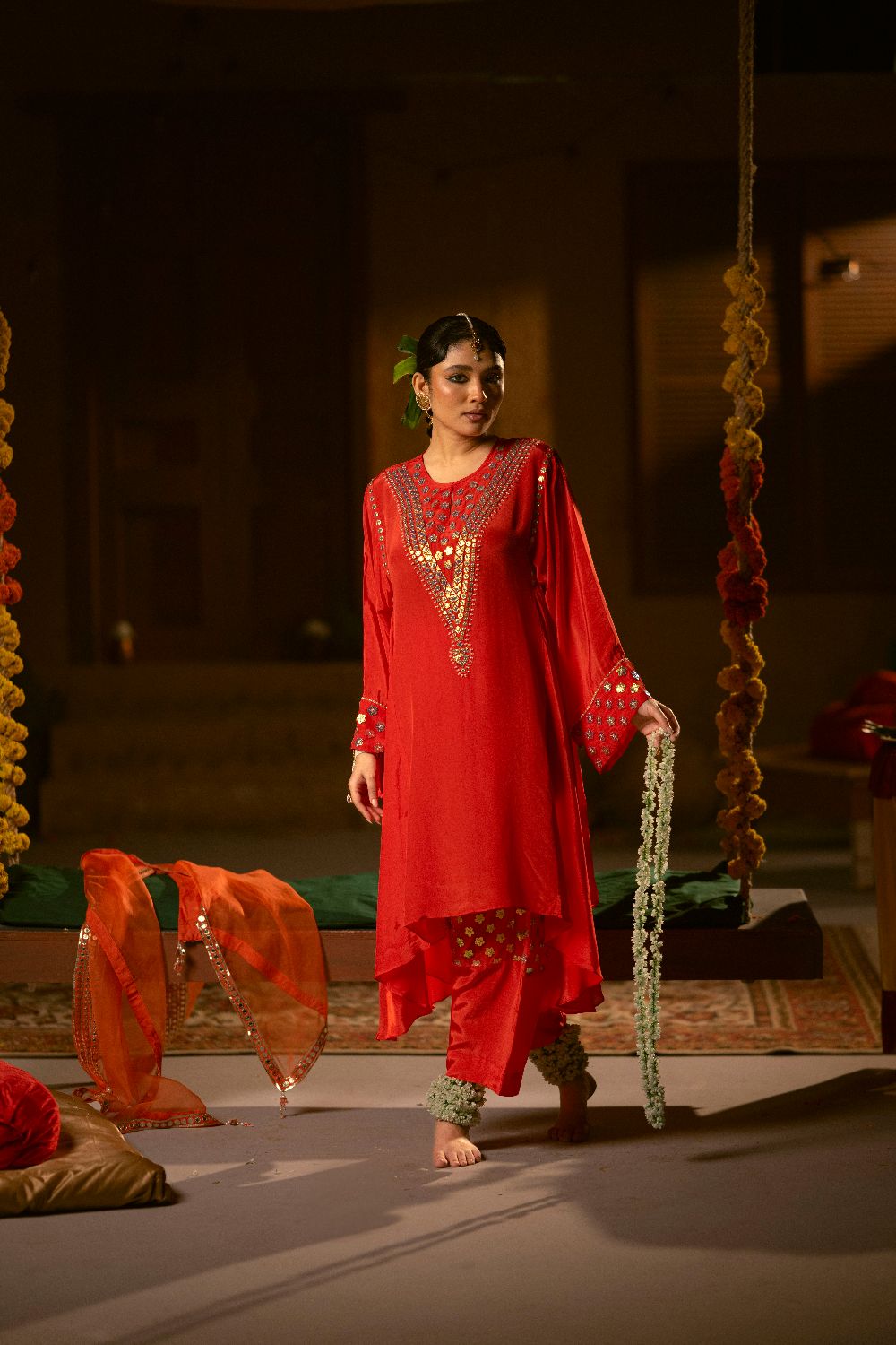 Make a statement with our flowy choga featuring an asymmetrical hemline, paired with a comfortable appliquéd salwar a perfect blend of tradition and modern elegance. Model wears size S