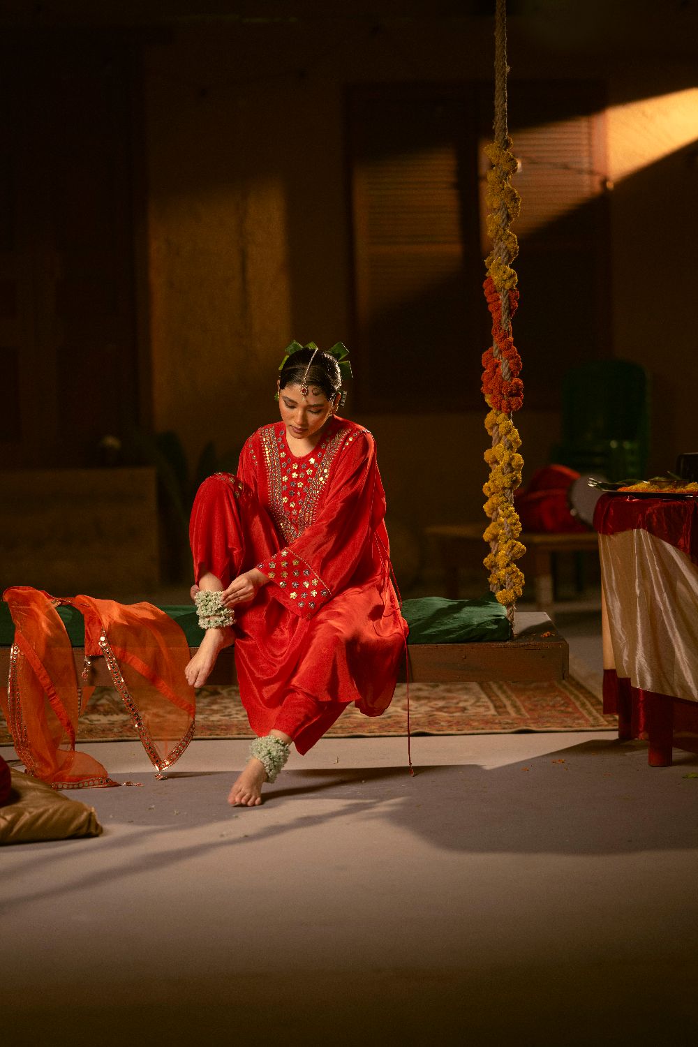 Embroidery Type: Gota Inspired Vegan Leather applique.Crafted using original in-house design patterns.This light weight leather applique evokes the look of gota work and is further hand embellished with pearls in varying sizes.