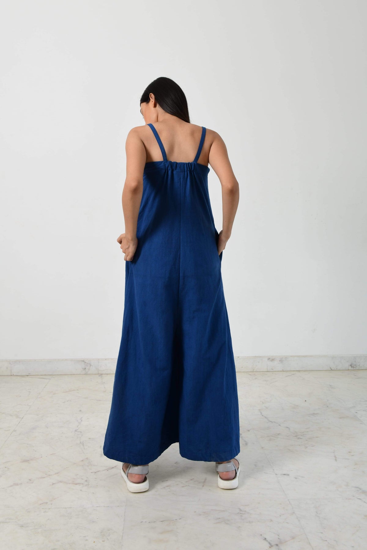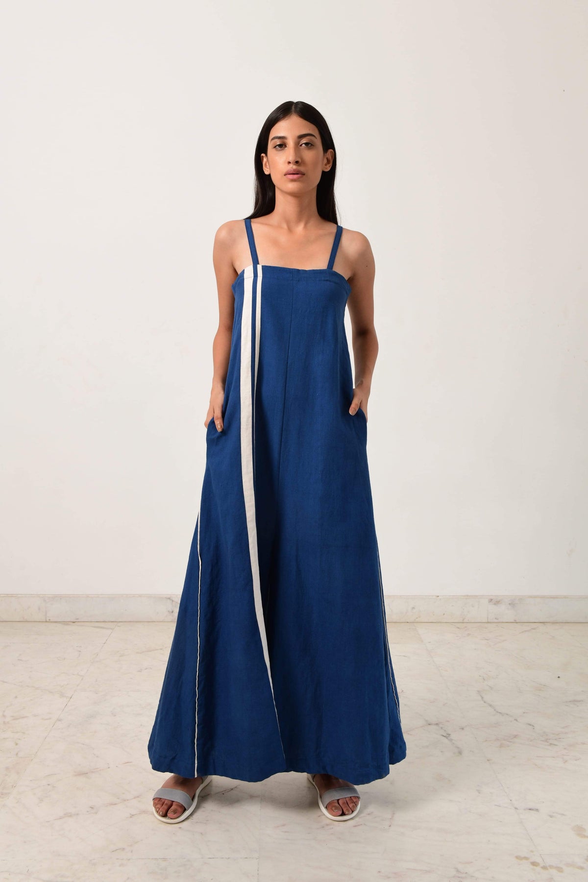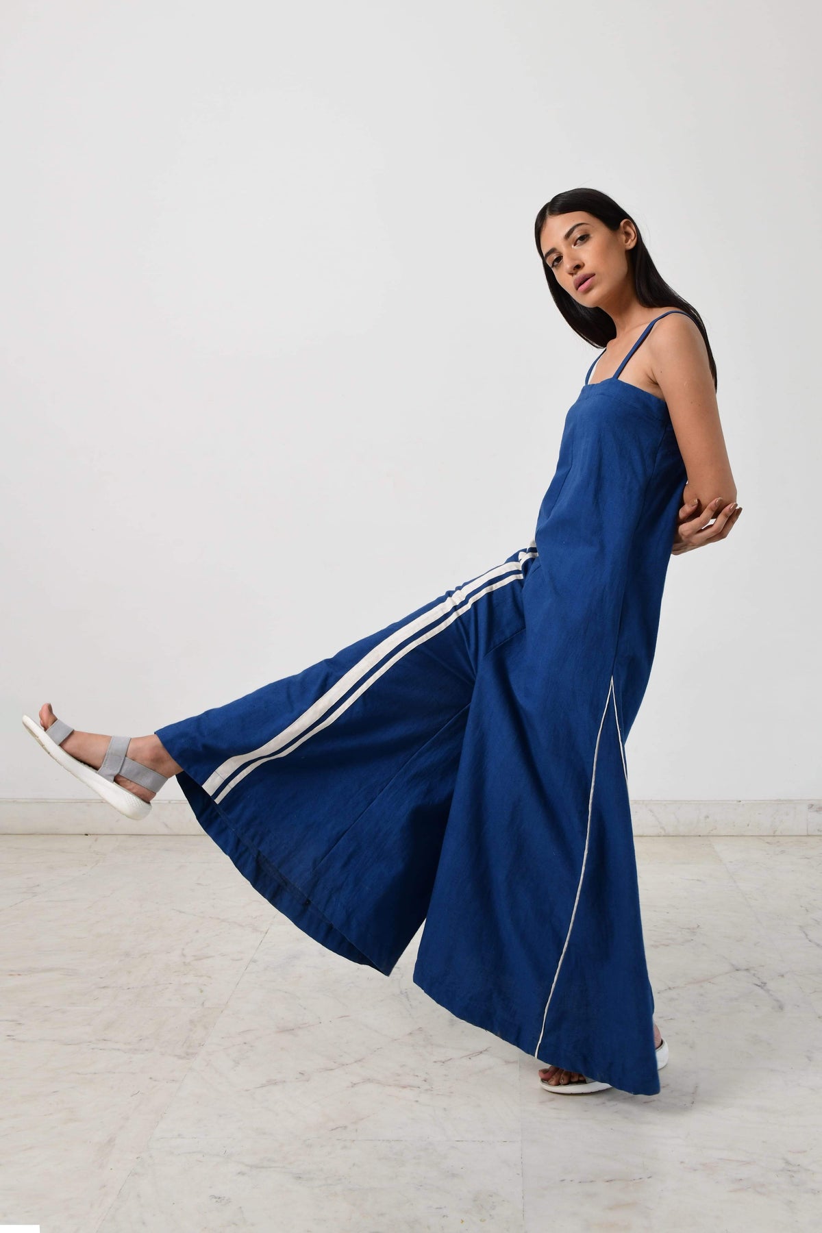 HANDSPUN KHADI/HAND BLOCKED blue khadi divder jumpsuit dress with fire strap pipeings.