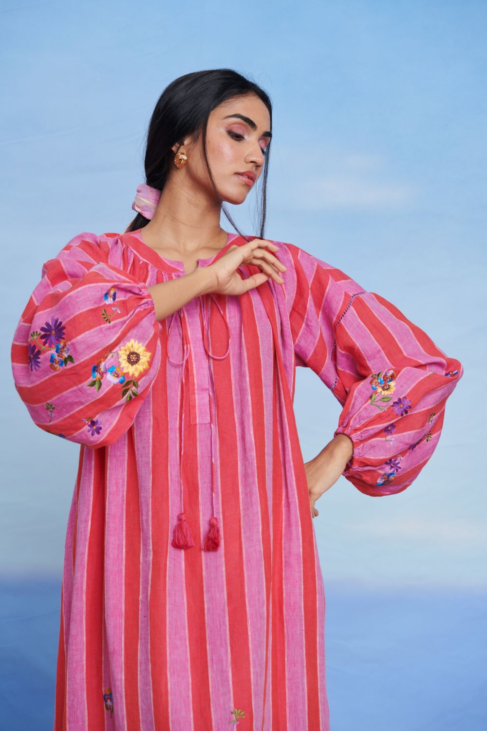 An ode to ease and embroidery, this puff-sleeve dress is cut from 100% pure linen and finished with vibrant floral threadwork across the chest and sleeves. The silhouette is relaxed yet intentional — with gathered cuffs, a soft keyhole neckline, and tassel ties for added movement. Designed for sun-drenched mornings and late summer evenings, it brings together craftsmanship, colour, and comfort in one effortless piece.