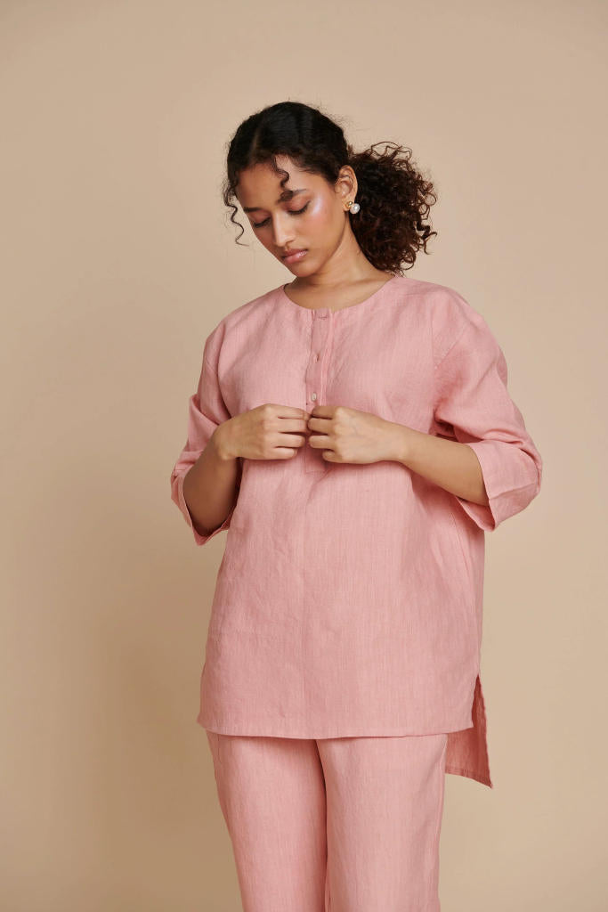Short Kurta High-low Hemline Round Neck with Half-placket Shell Buttons Heart Embroidery at the Back