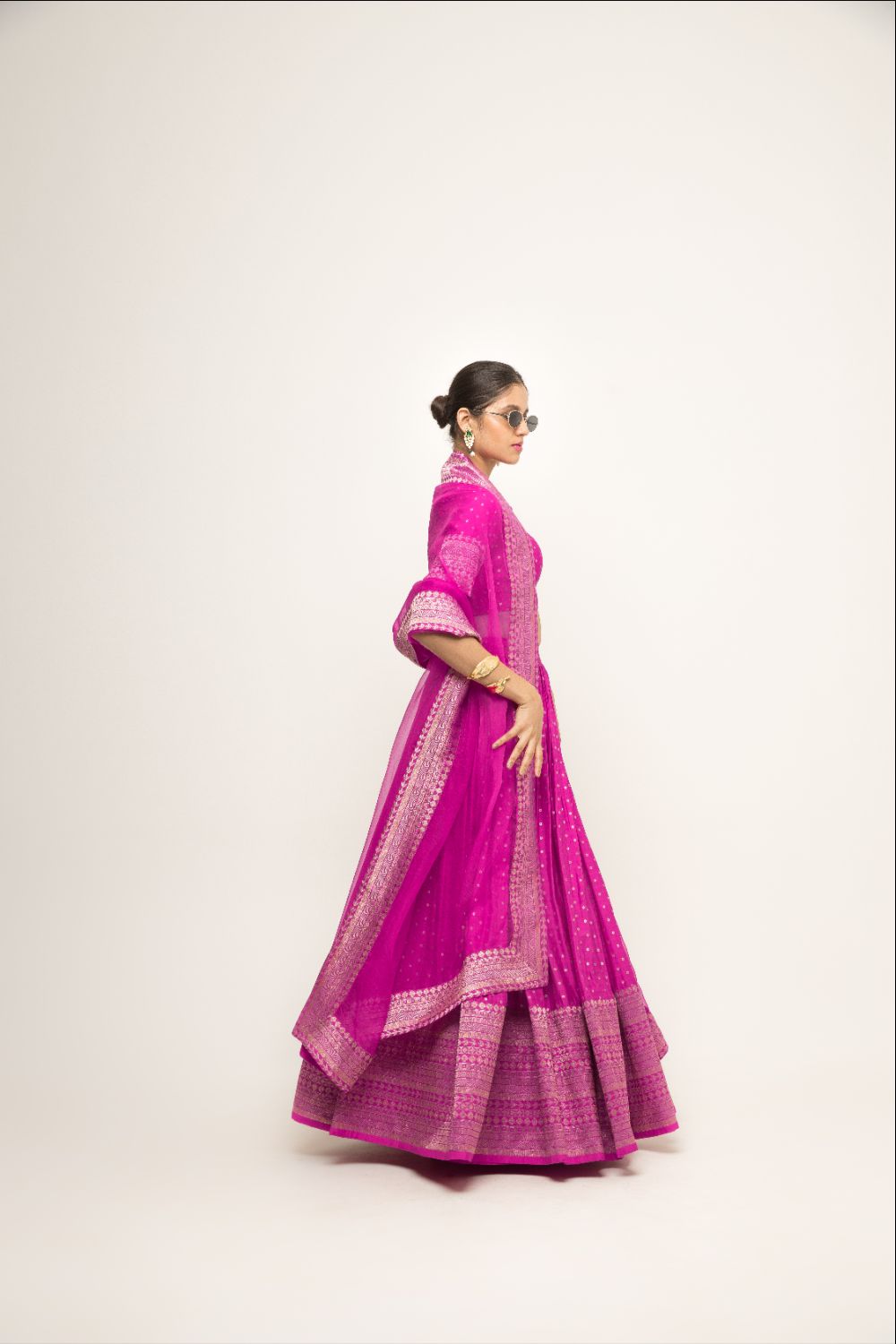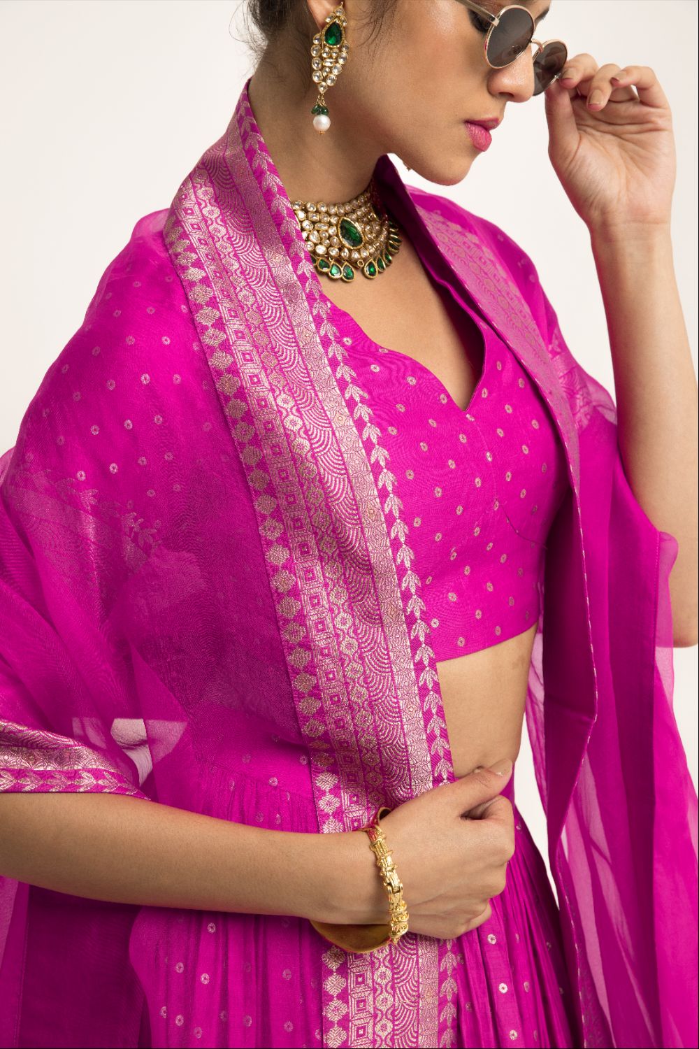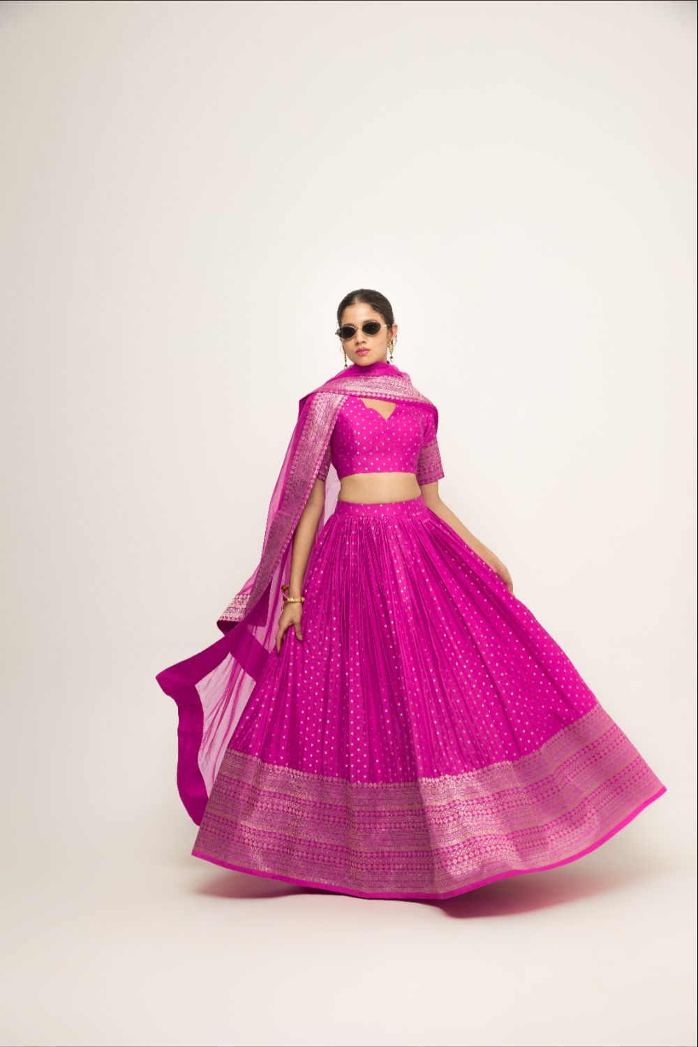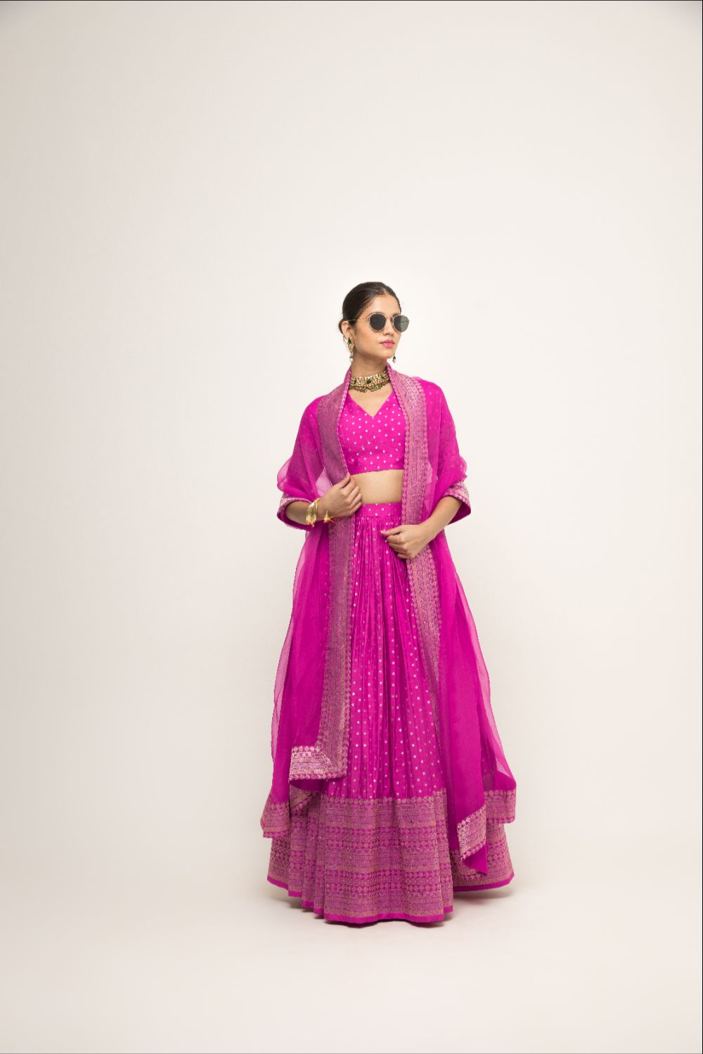 Fuchsia Pink Pure silk banarasi dotted lehenga with brocade details and matching organza dupatta.