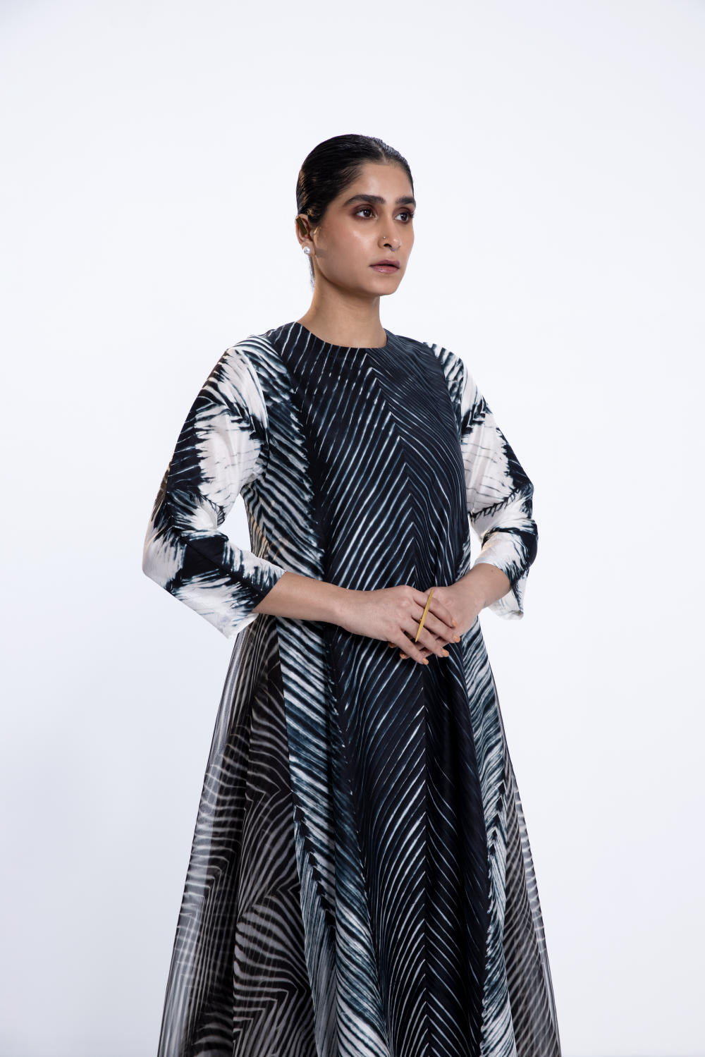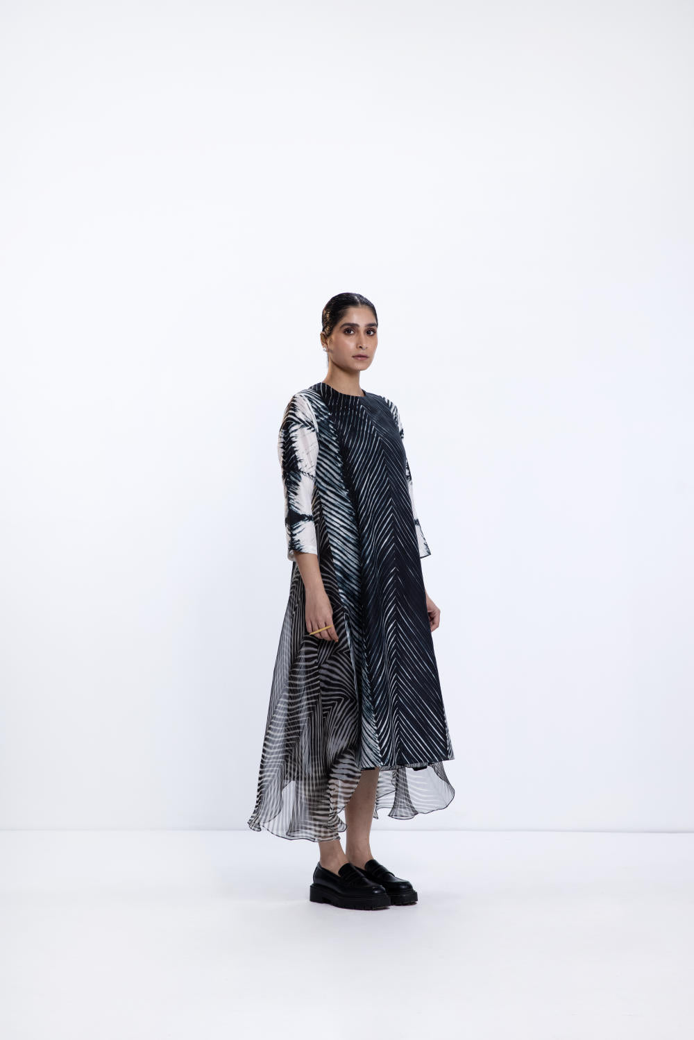 Black asymmetric shibori dress in silk and organza. It comes with a black silk slip