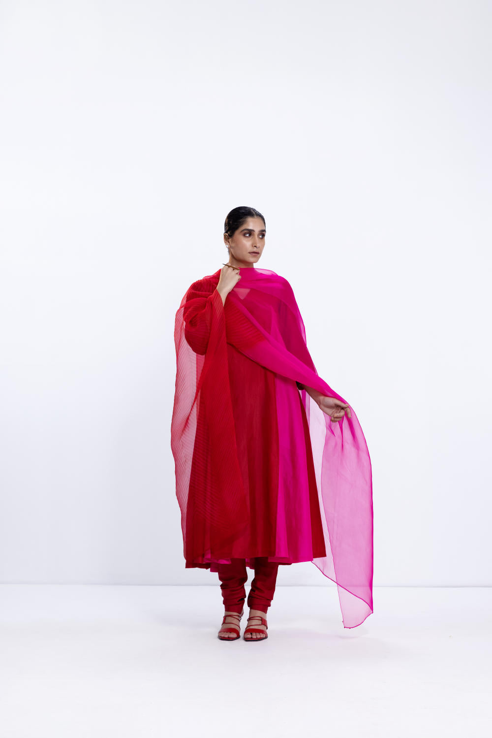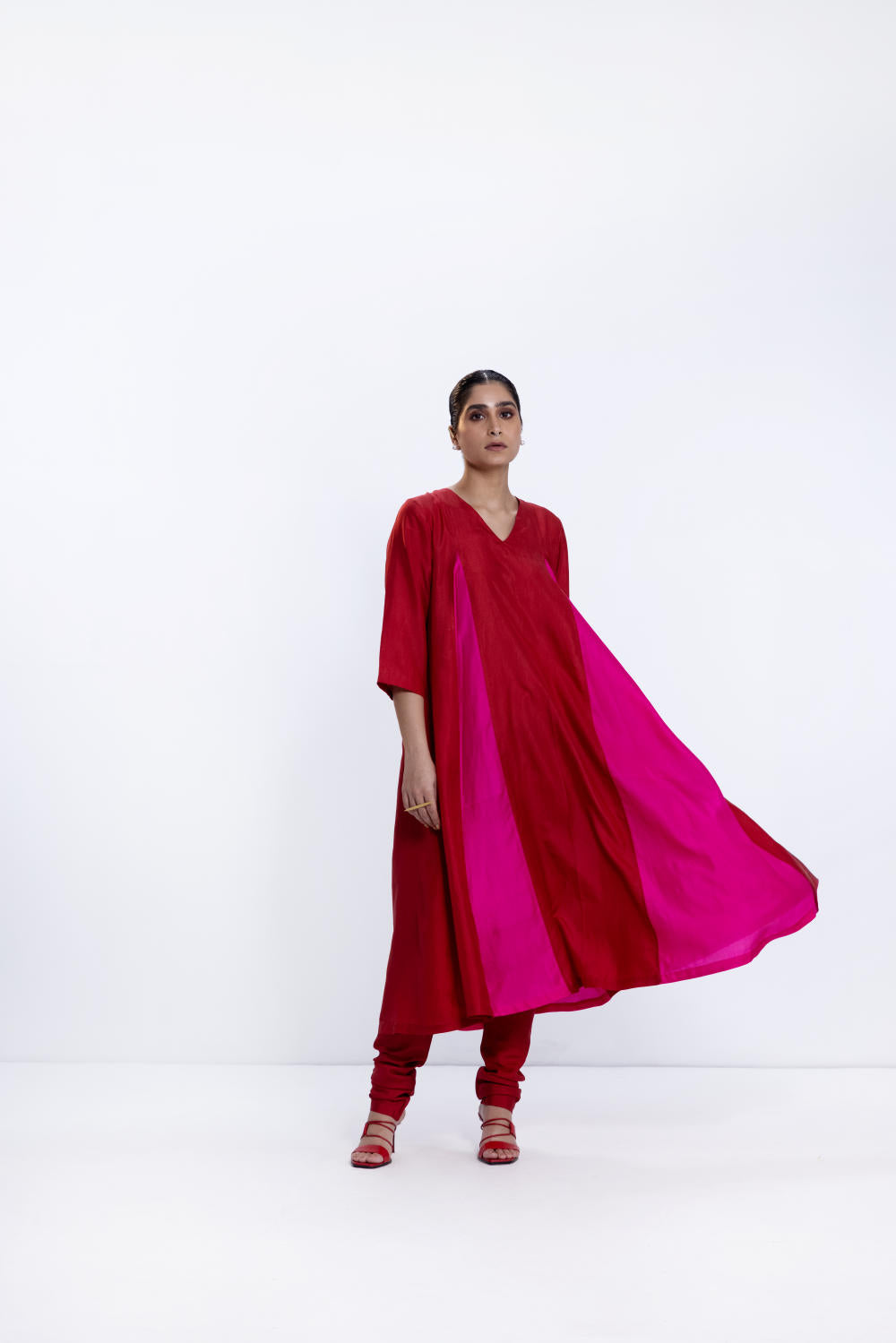 Silk kalidaar kurta dyed in rani/red. It is paired with a red silk churidaar.