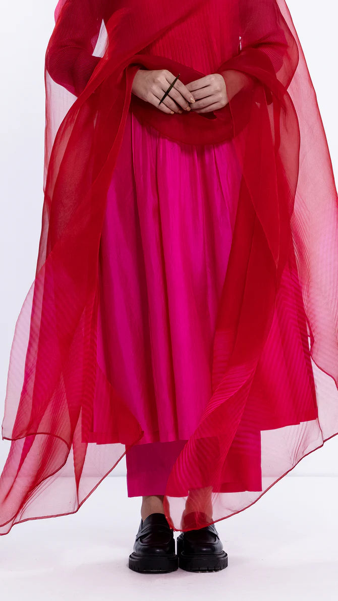 Rani silk pintuck kurta with high slit and a contrast red facing. It is paired with wide silk pants in rani.