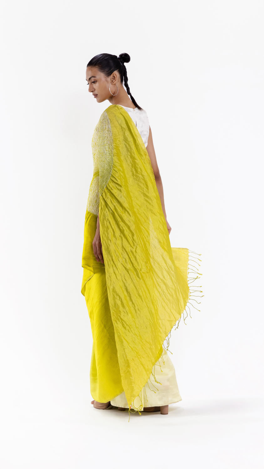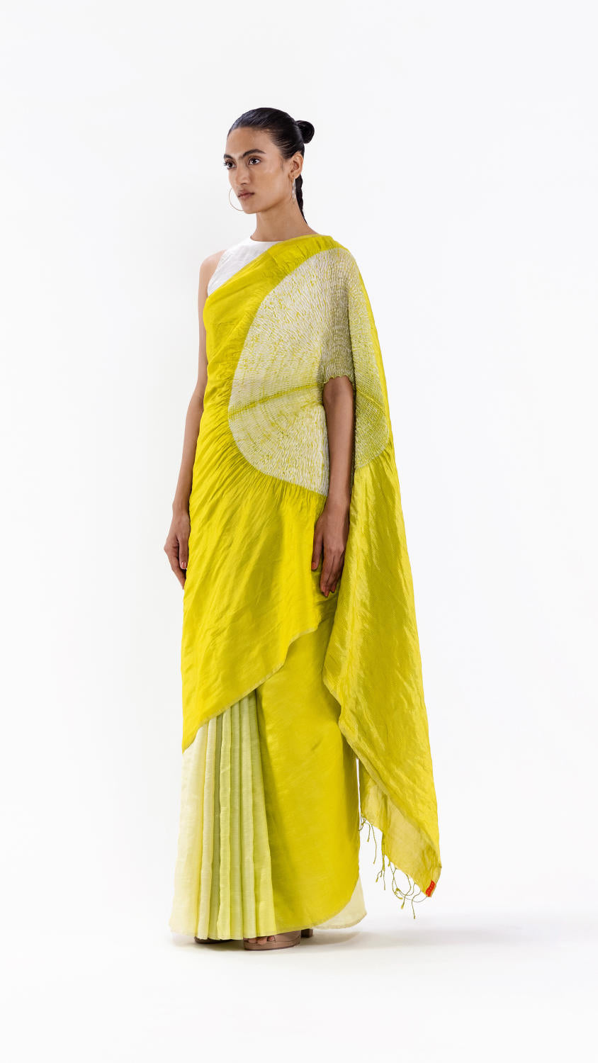 Handwoven silk saree with our signature shibori sleeve detail and a striped metallic pallav, dyed in a lime ombre. It comes with an unstitched lime silk blouse piece.