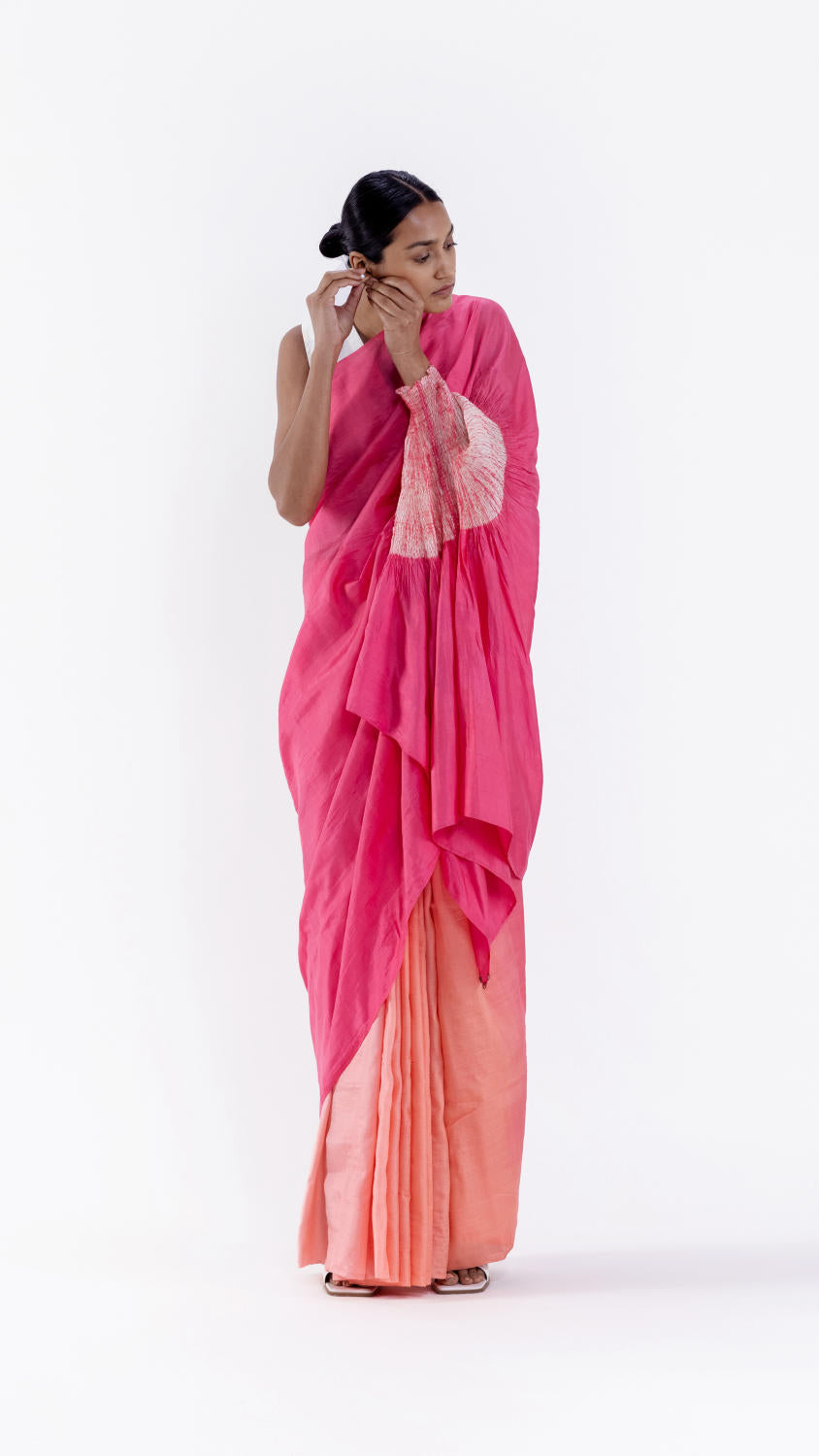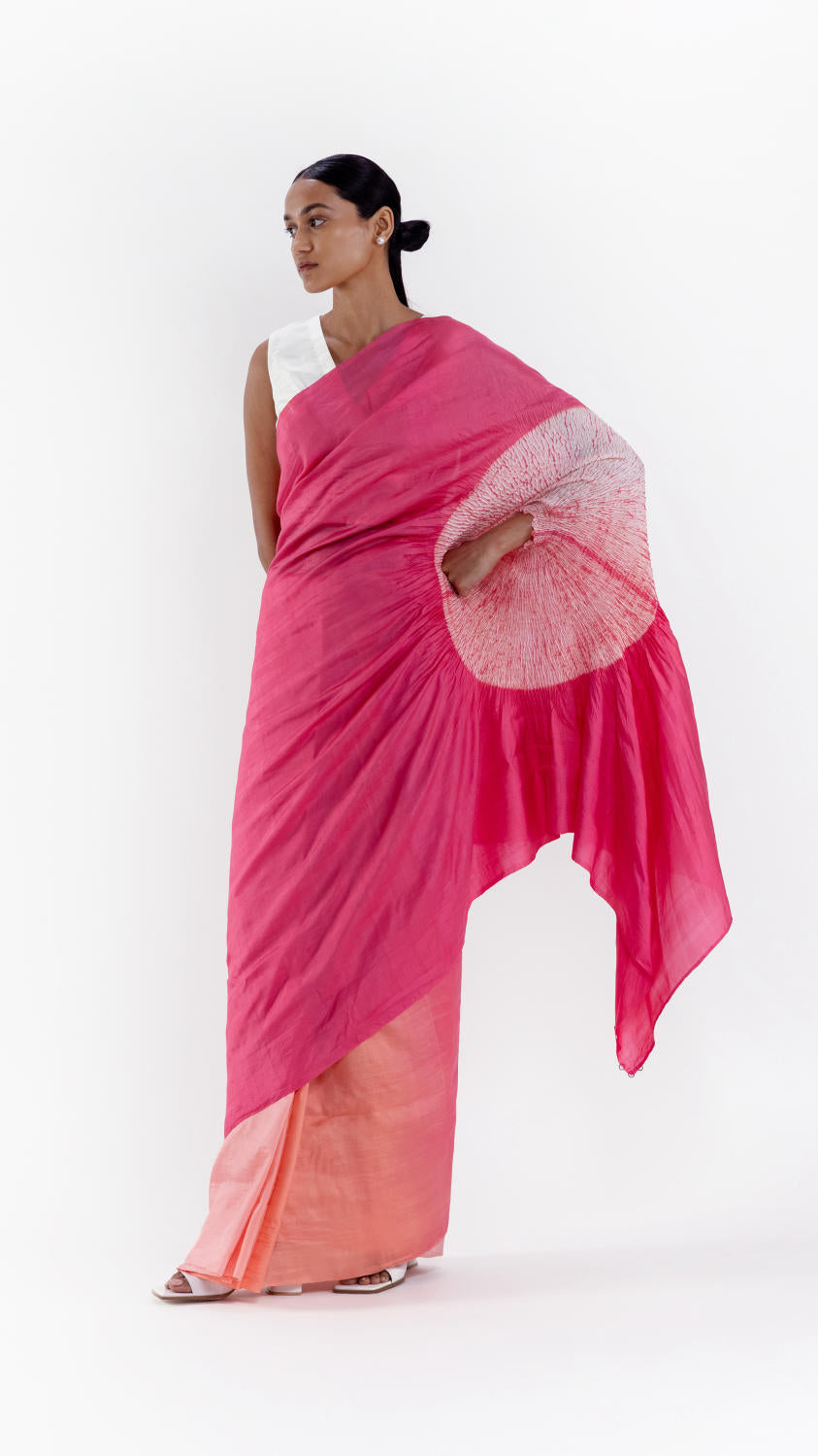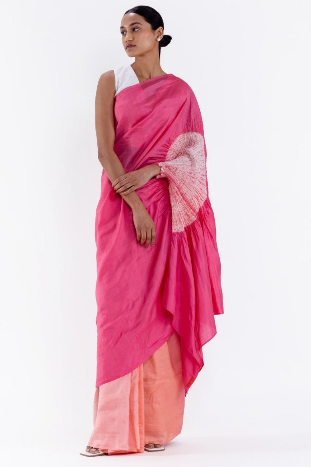 Handwoven handsfree silk saree dyed in a pink ombre with our signature shibori sleeve detail on the pallav. It comes with an unstitched pink silk blouse piece.