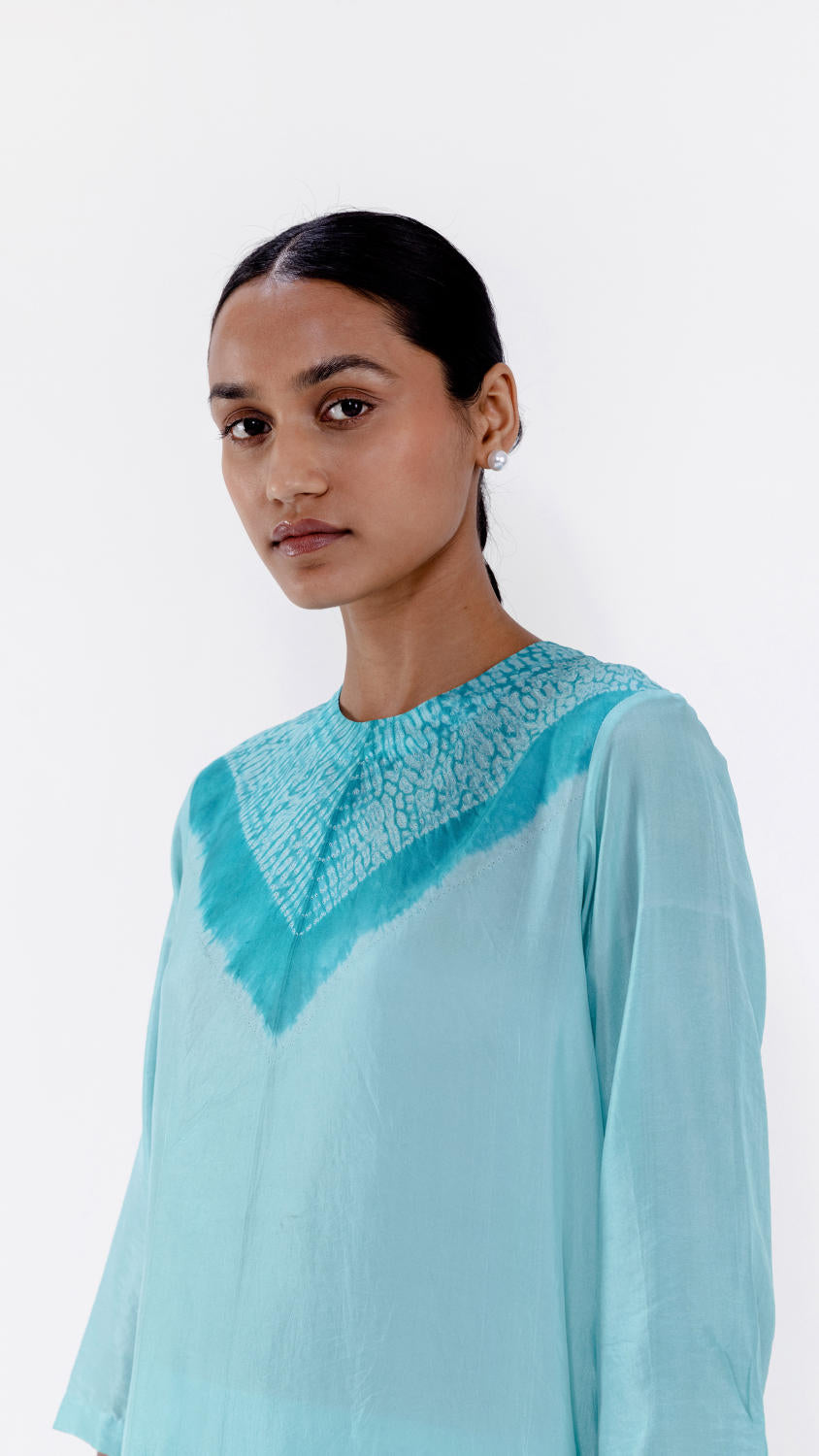 Handwoven silk shibori kurta hand-dyed in shades of blue, with a shibori detail on the neckline coordinated silk pants.