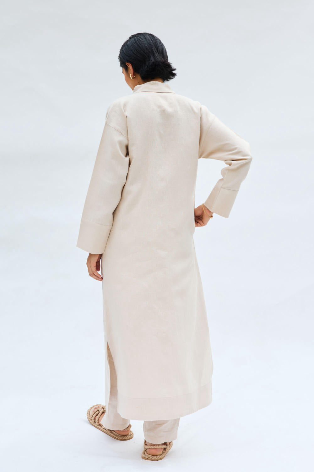 Relaxed fit, full sleeve, v-neck, full length kurta top crafted in linen fabric, machine embroidered with ocean-inspired motifs.