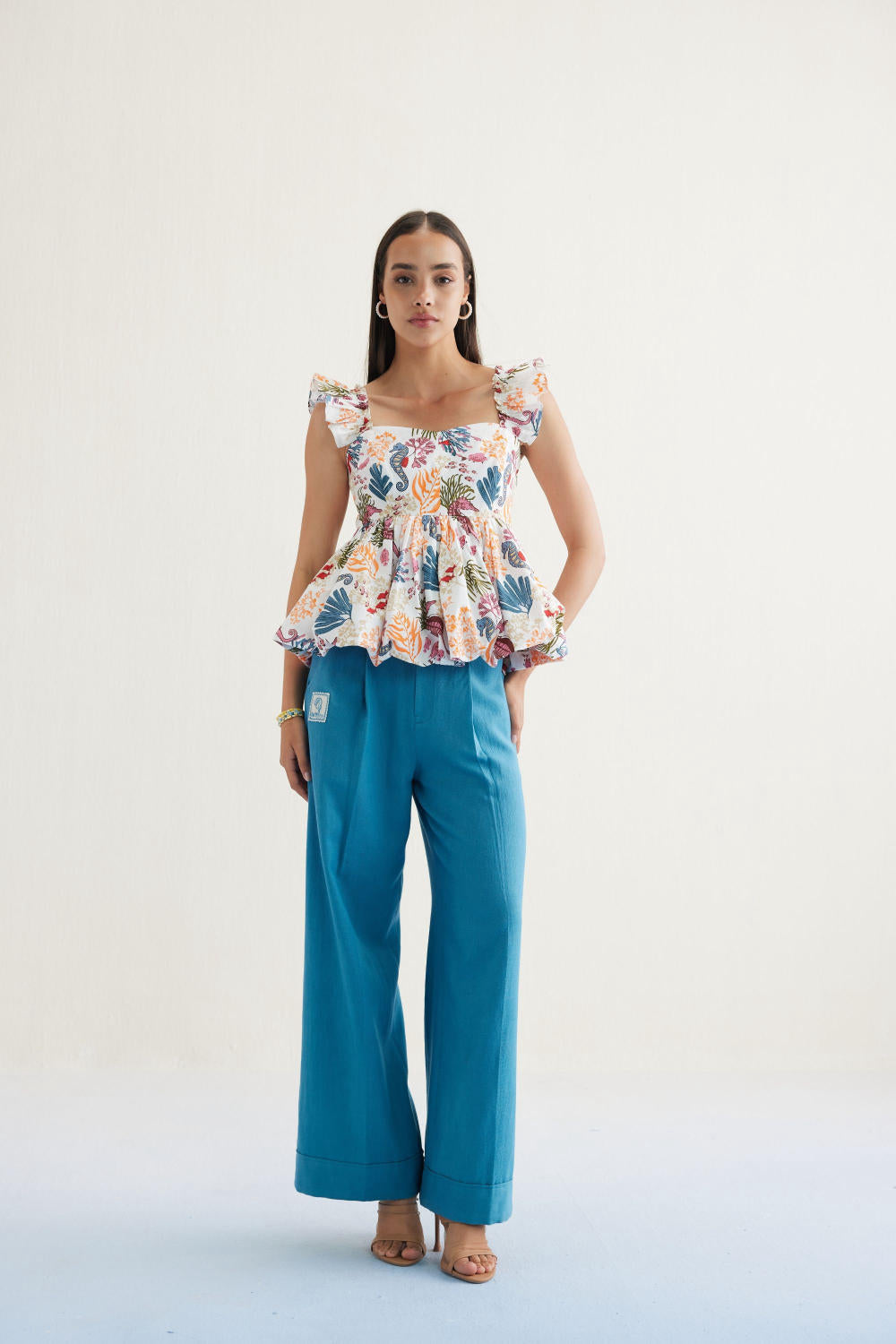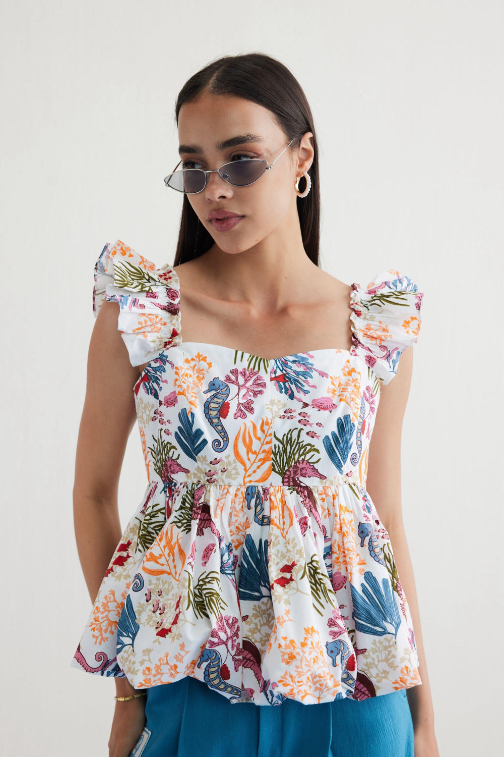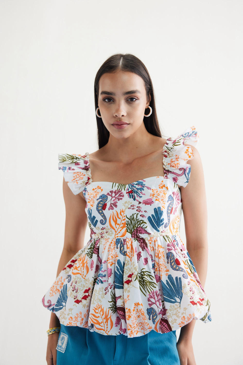 Fitted, short frill sleeve, peplum top with a sweetheart neckline, crafted in organic cotton poplin fabric, screen printed with our signature ocean life inspired motif using azo-free dyes.
