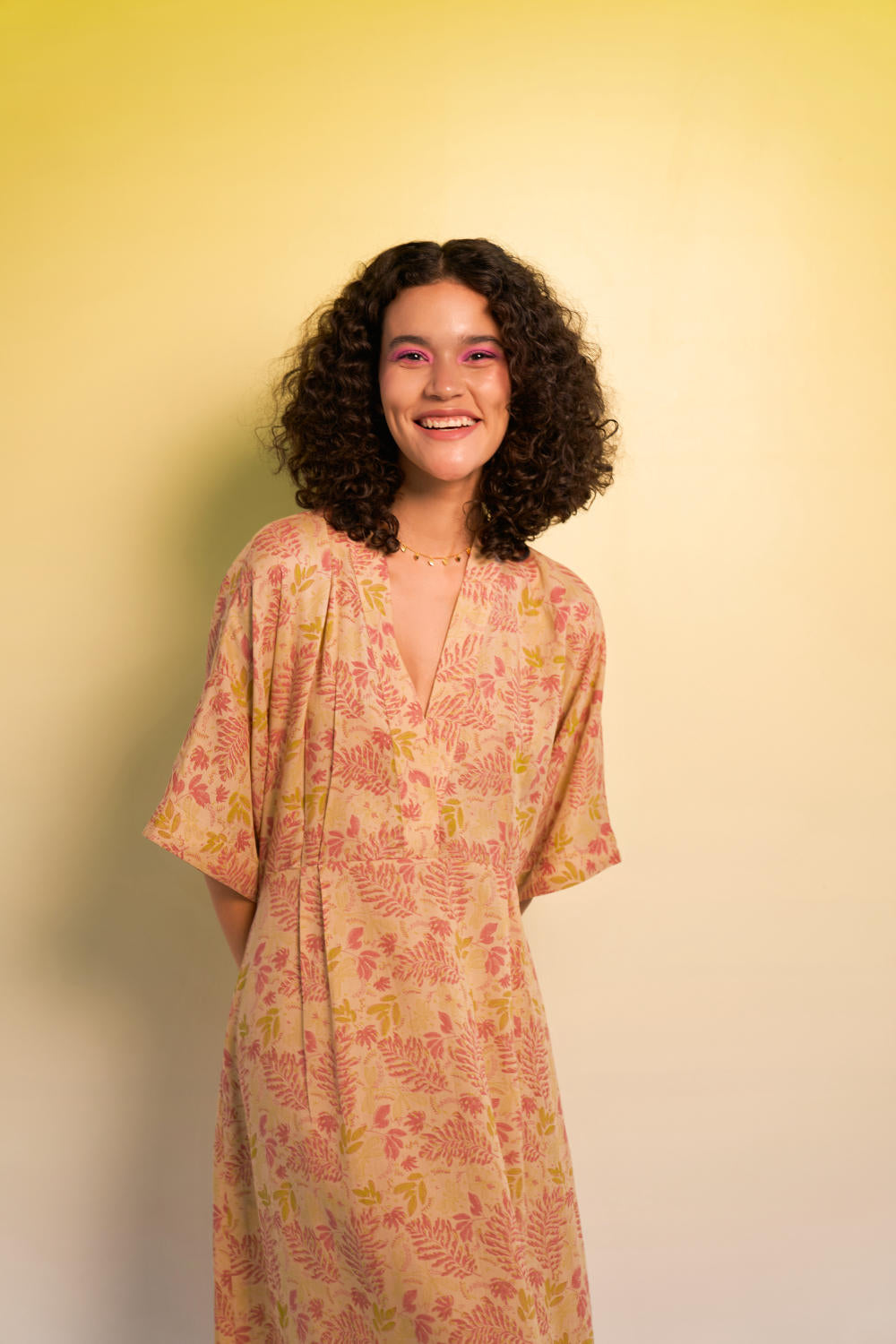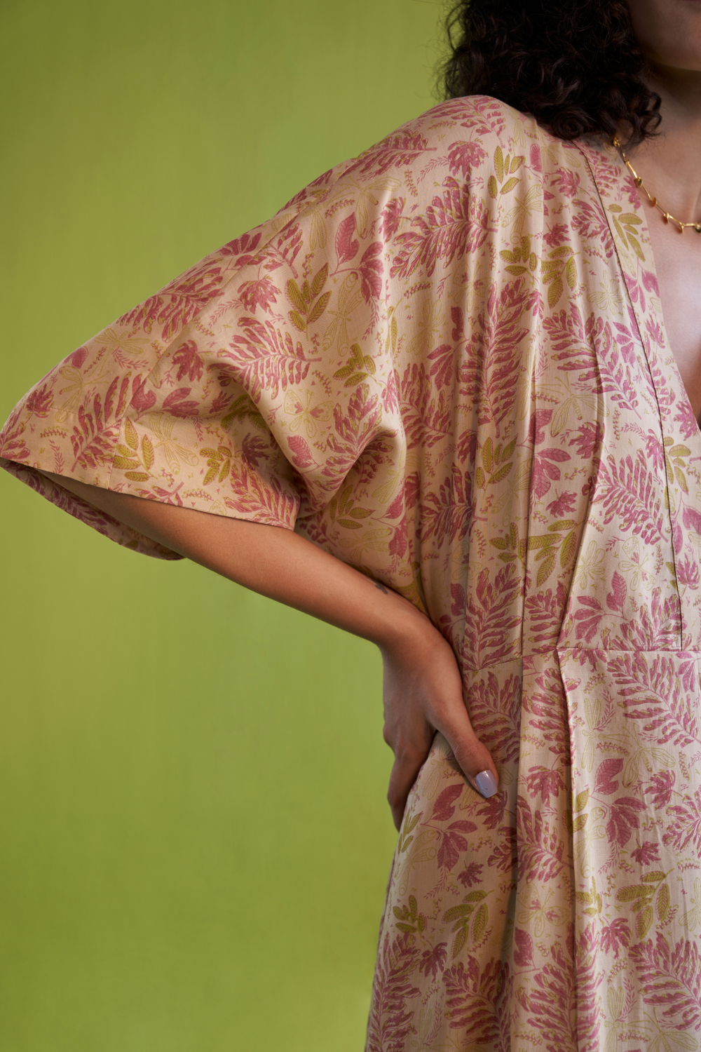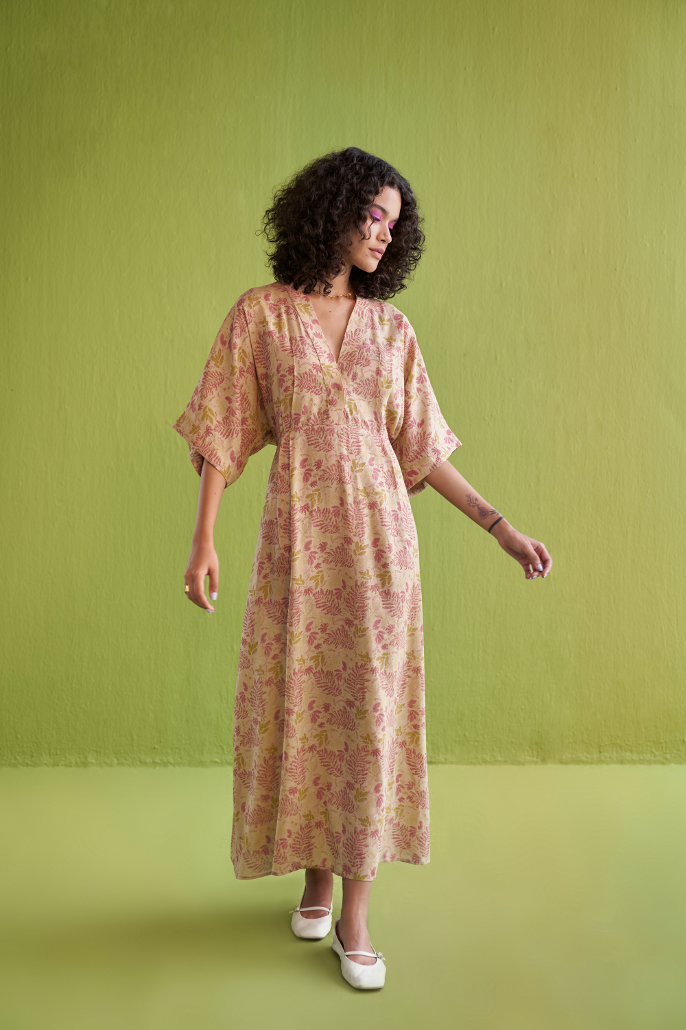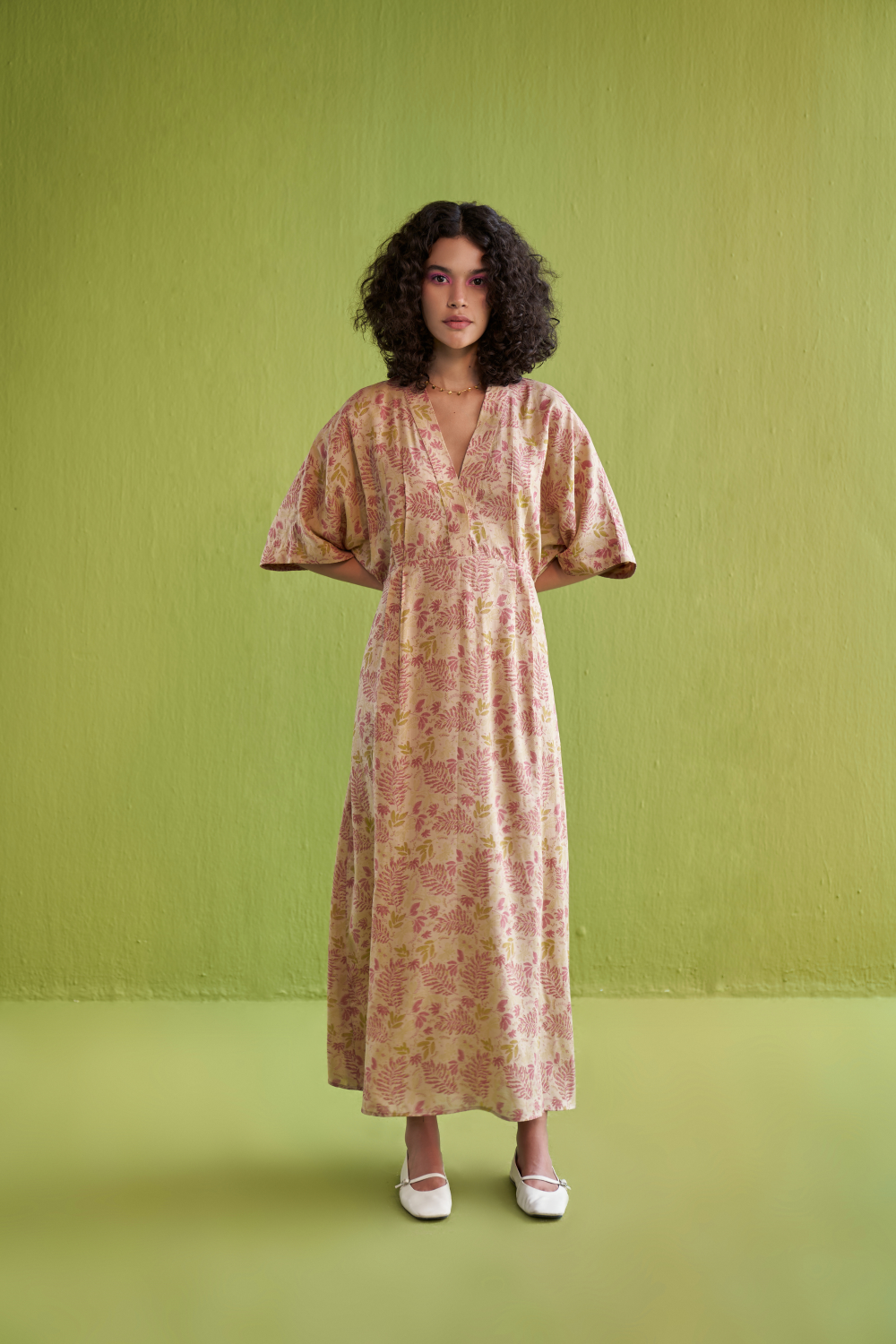 Regular fit, half-sleeve, v-neck, maxi dress with a tie at the waist crafted in Lyocell fabric, hand block printed with our fern-inspired motif using azo-free dyes. A staple summer dress is a must for any sustainable wardrobe. This piece is made in fabric that's created from wood cellulose fibres (natural and renewable).