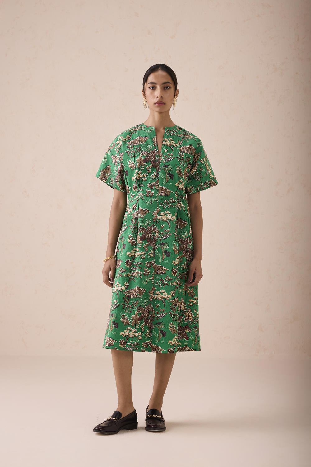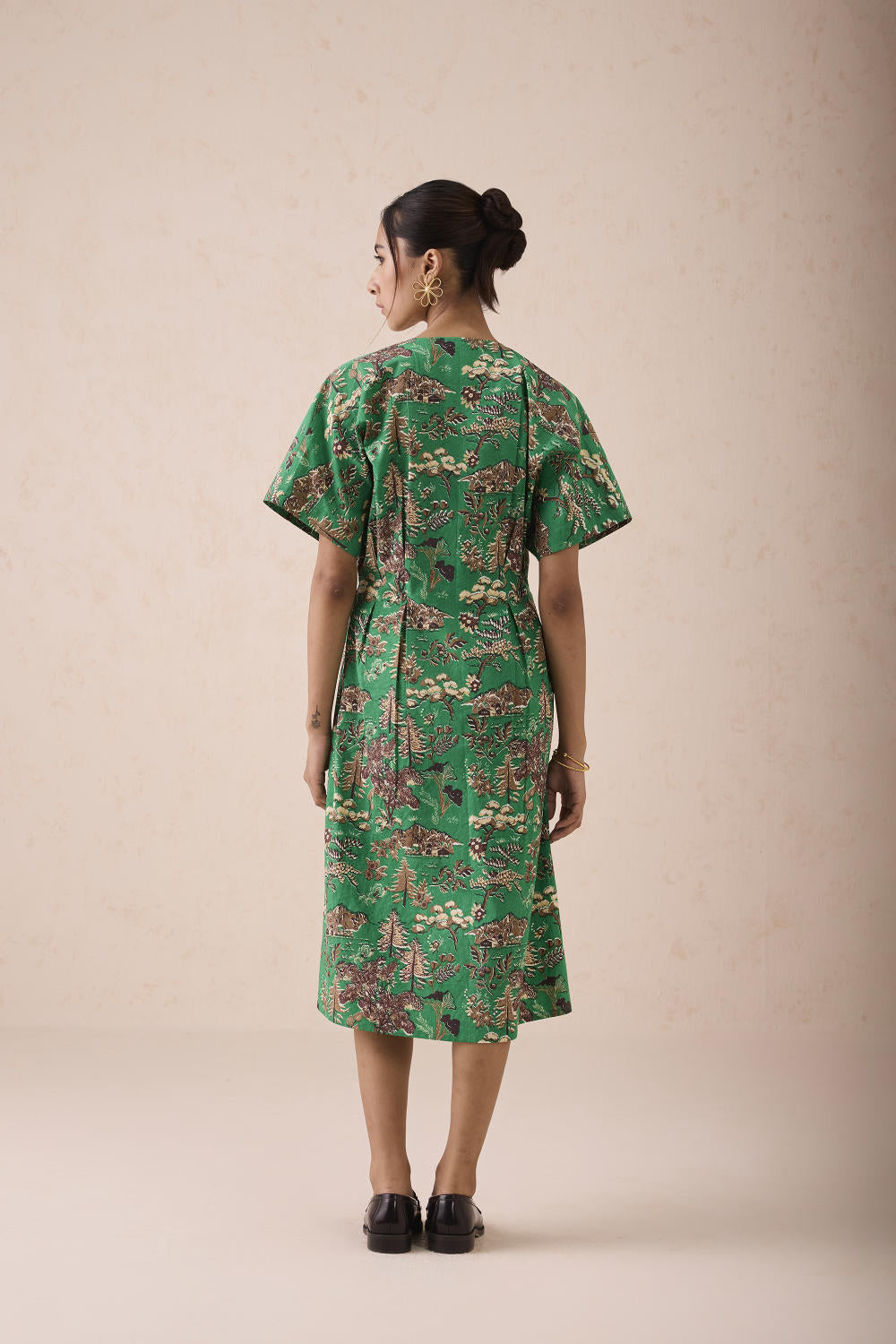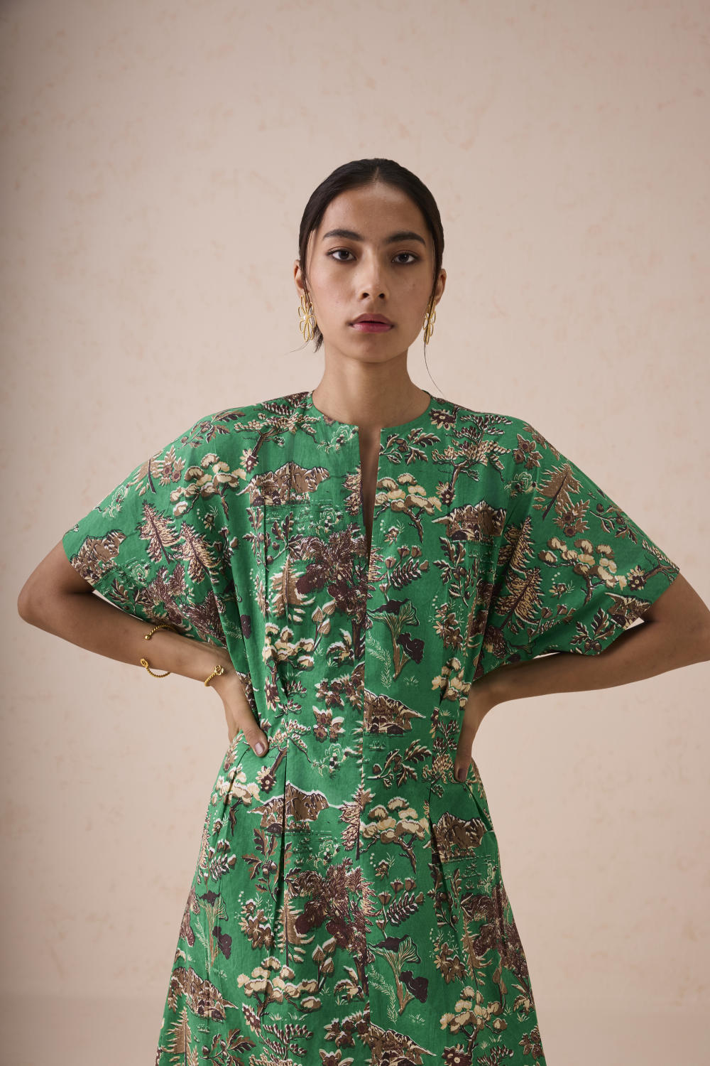 Relaxed fit, split crew neck, short-sleeve, a-line midi dress crafted in organic cotton poplin fabric, screen printed with our signature mountain-inspired motif using azo-free dyes. This dress is perfect to dress up or dress down. Elegant, vibrant and slow crafted, wear this piece with a green heart wherever you go.