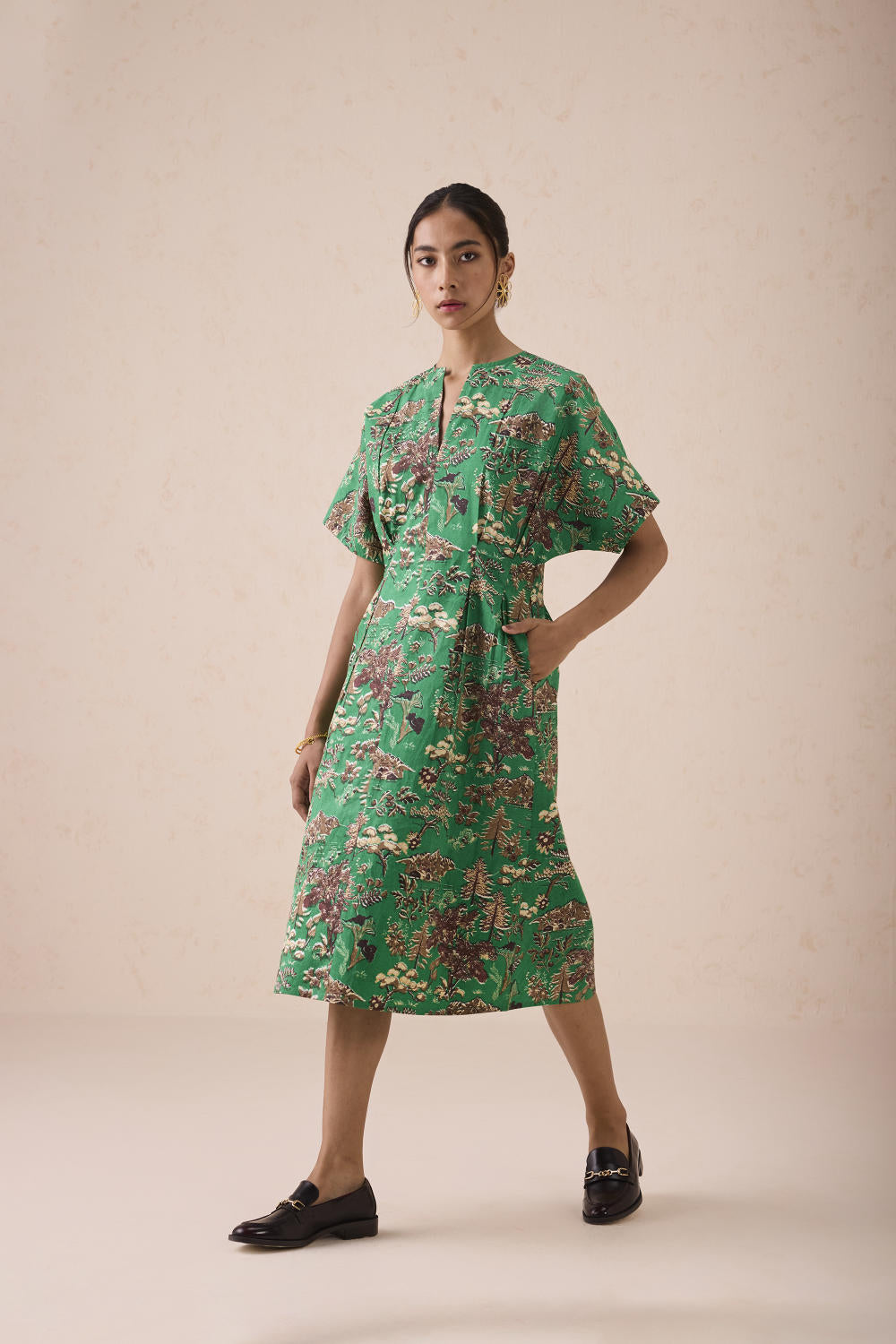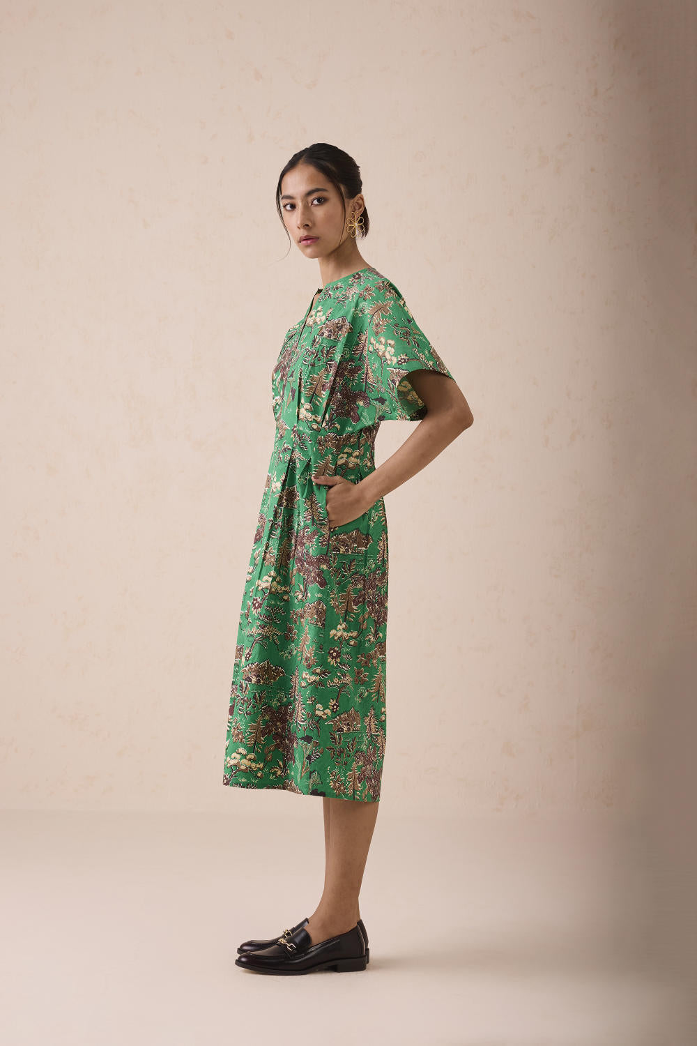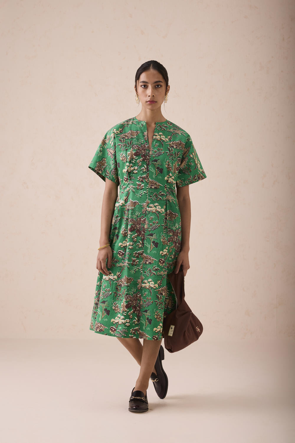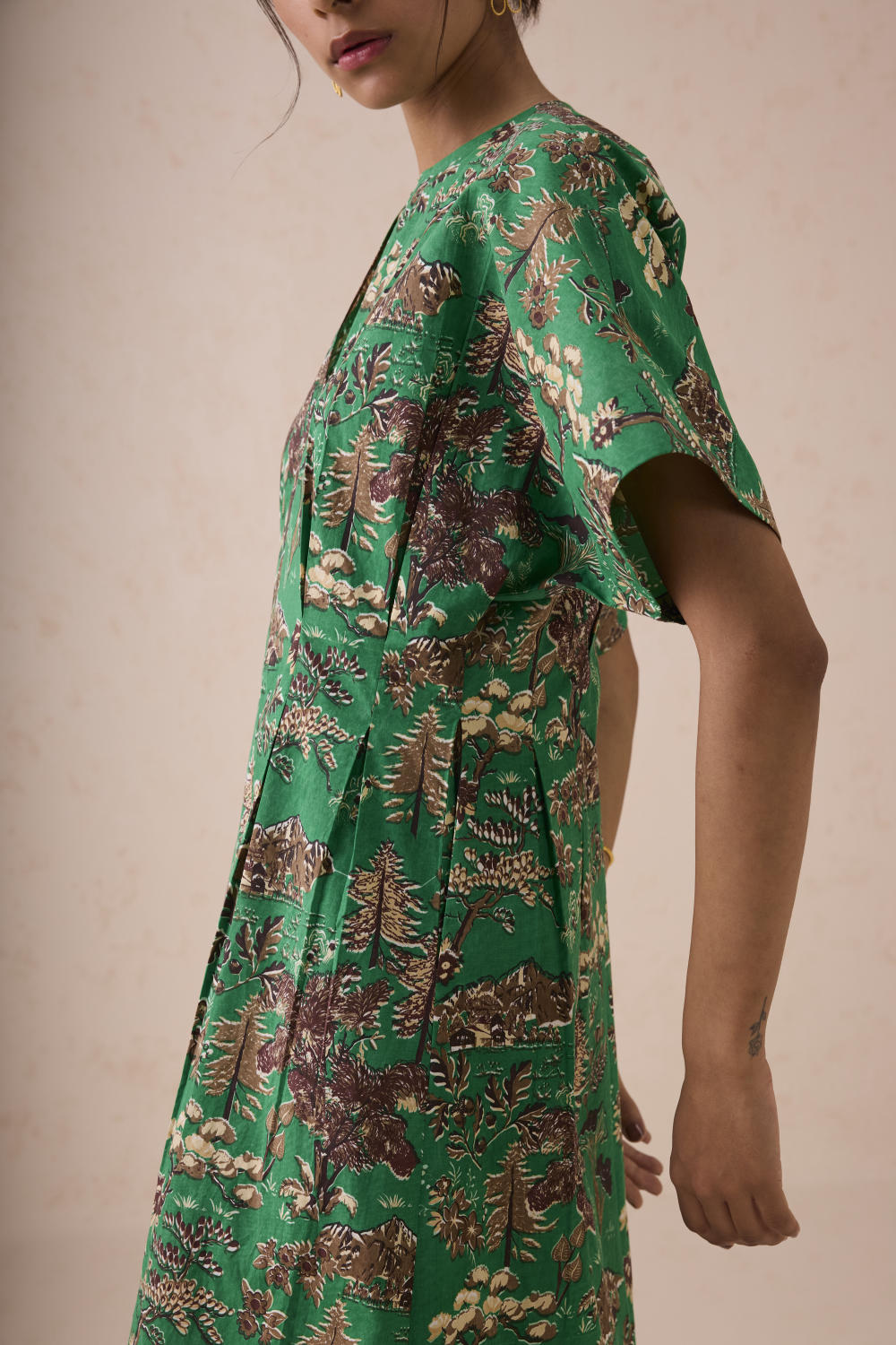 Relaxed fit, split crew neck, short-sleeve, a-line midi dress crafted in organic cotton poplin fabric, screen printed with our signature mountain-inspired motif using azo-free dyes. This dress is perfect to dress up or dress down. Elegant, vibrant and slow crafted, wear this piece with a green heart wherever you go.