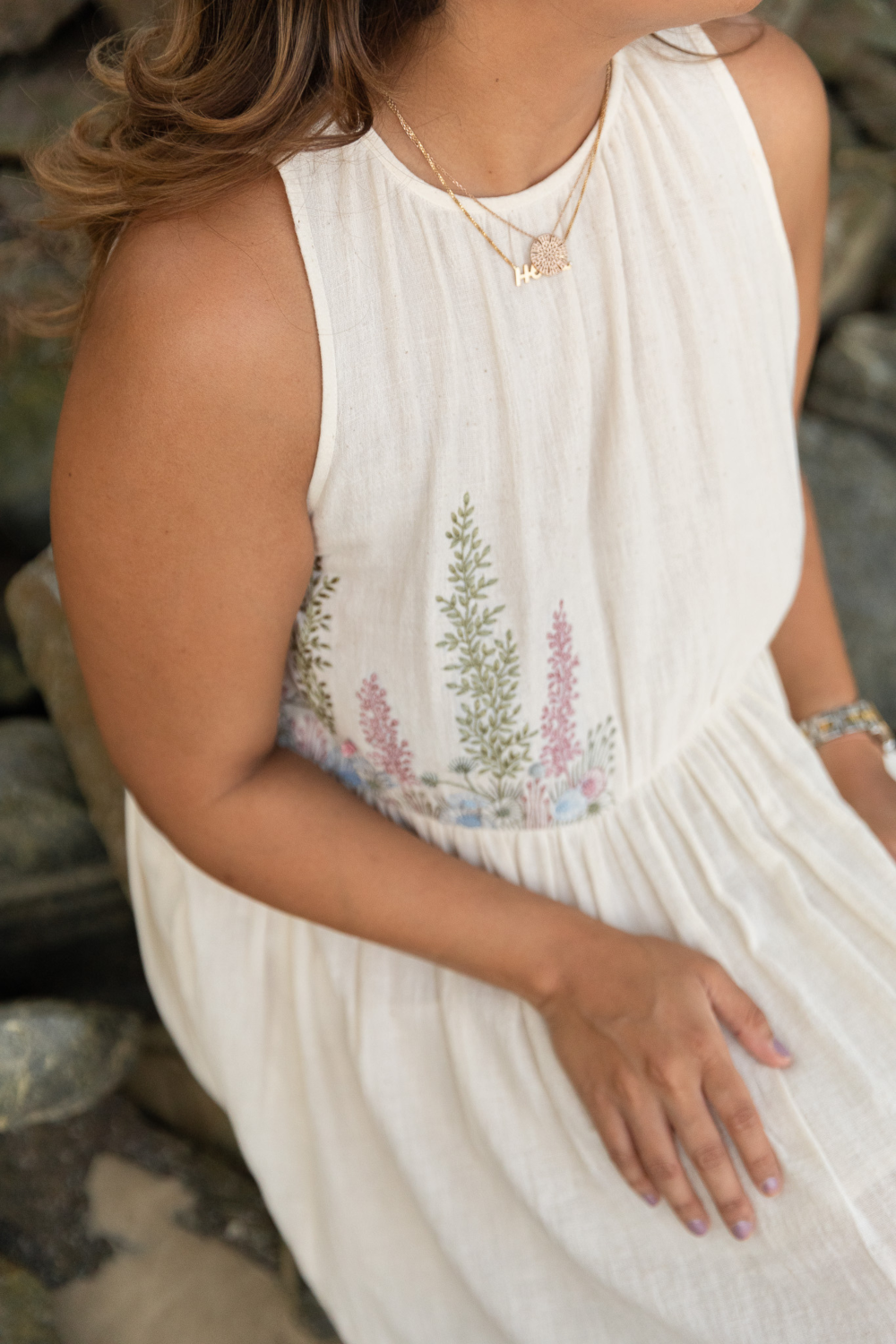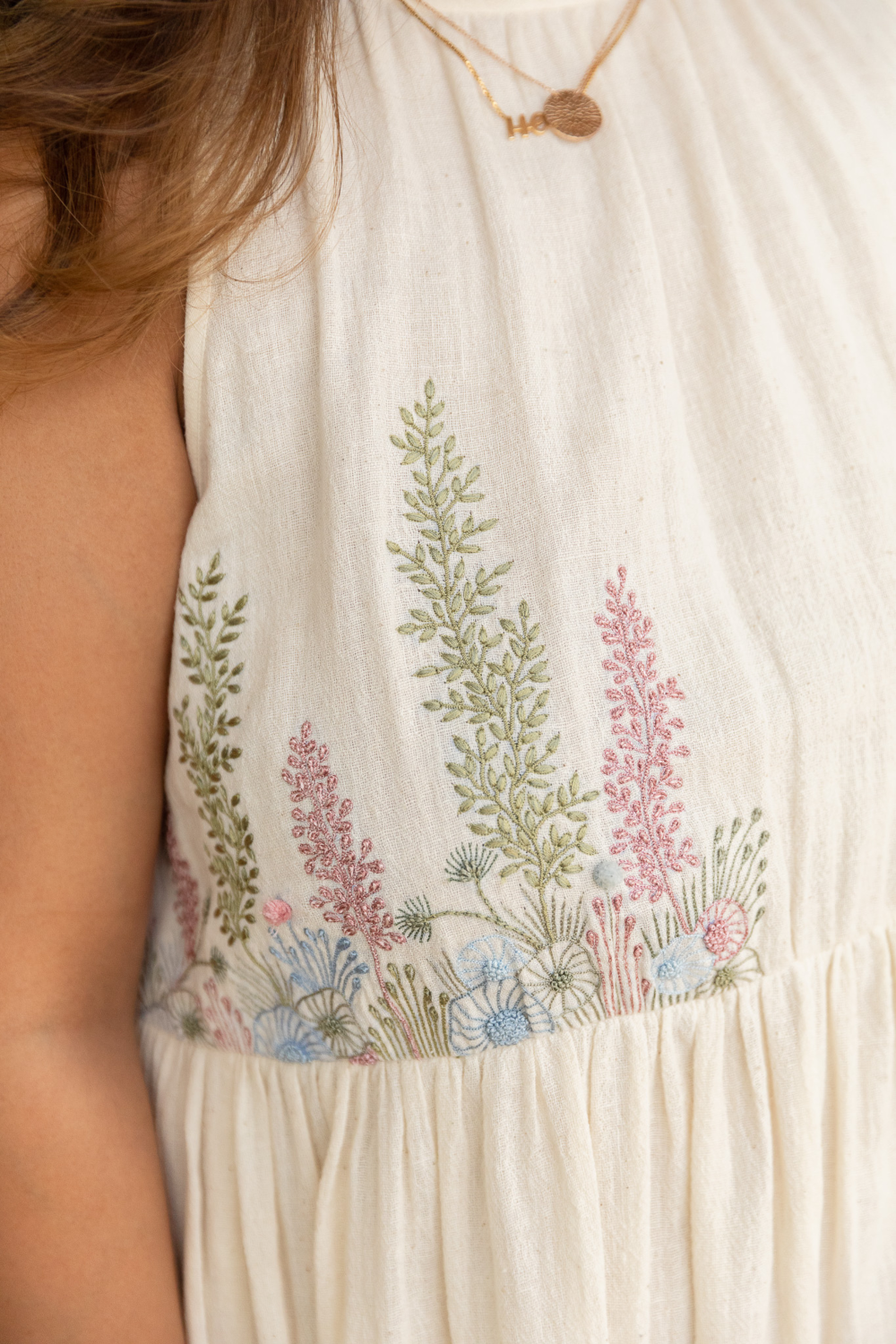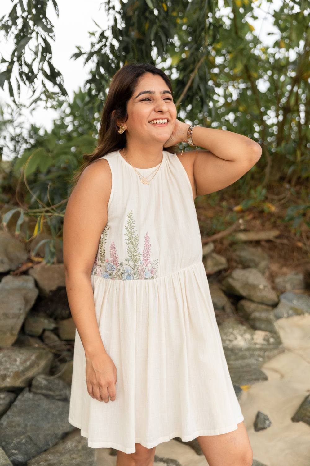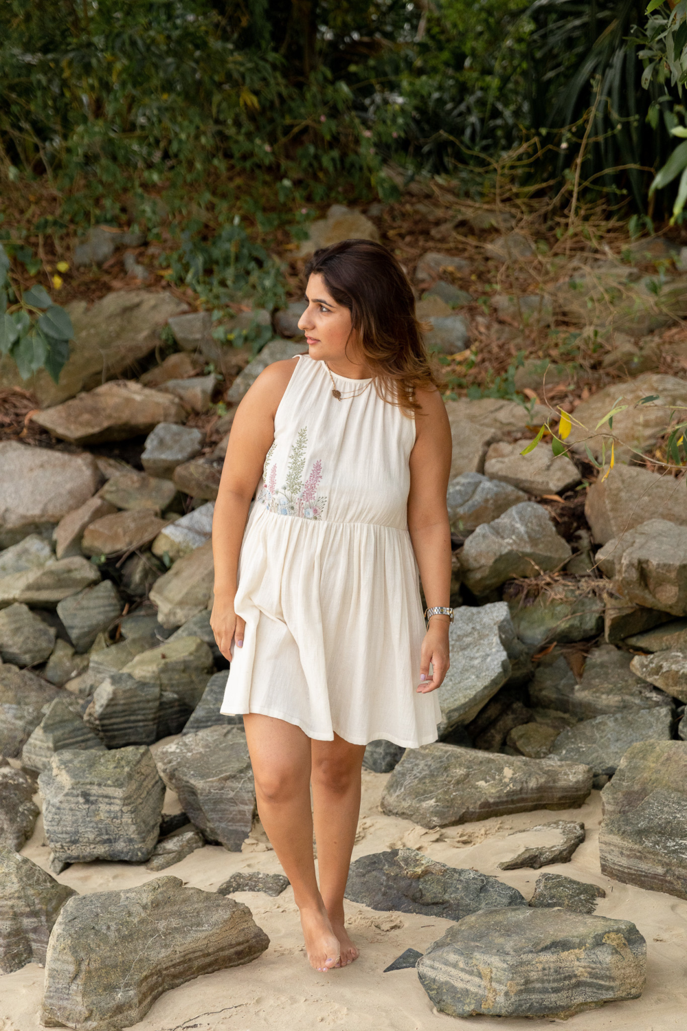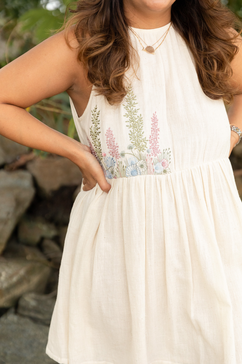 Regular fit, halter neck, sleeveless mini dress crafted in handspun and handwoven organic cotton fabric, embroidered with nature-inspired motifs. A staple comfortable dress is a must for any sustainable wardrobe. One of the key ways this piece is conscious is that it's fabric is completely handmade from spinning the yarns to weaving.