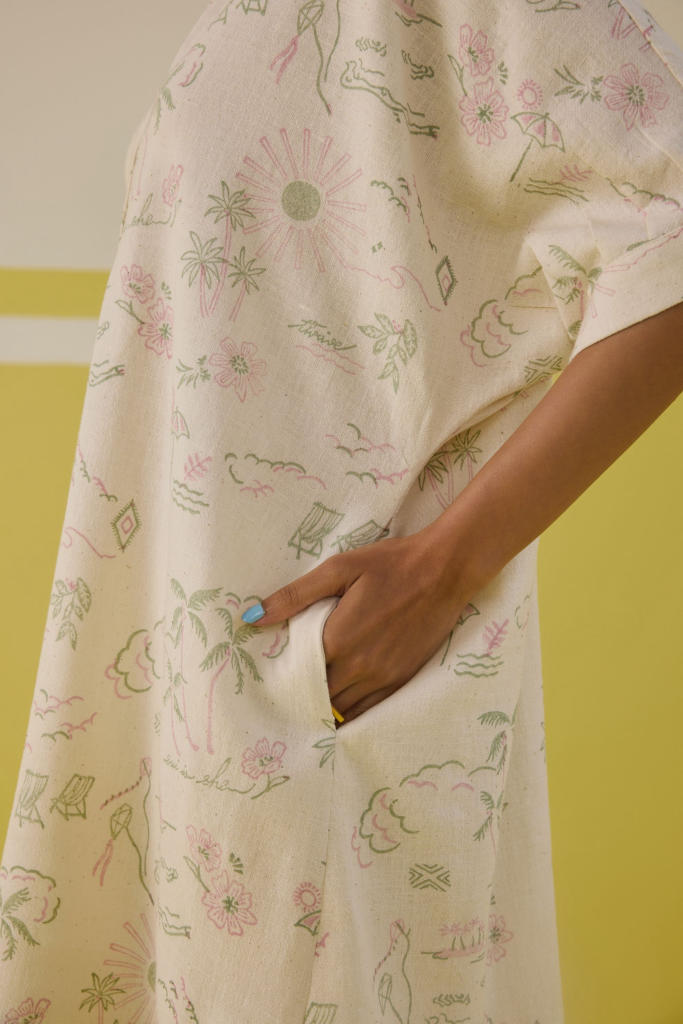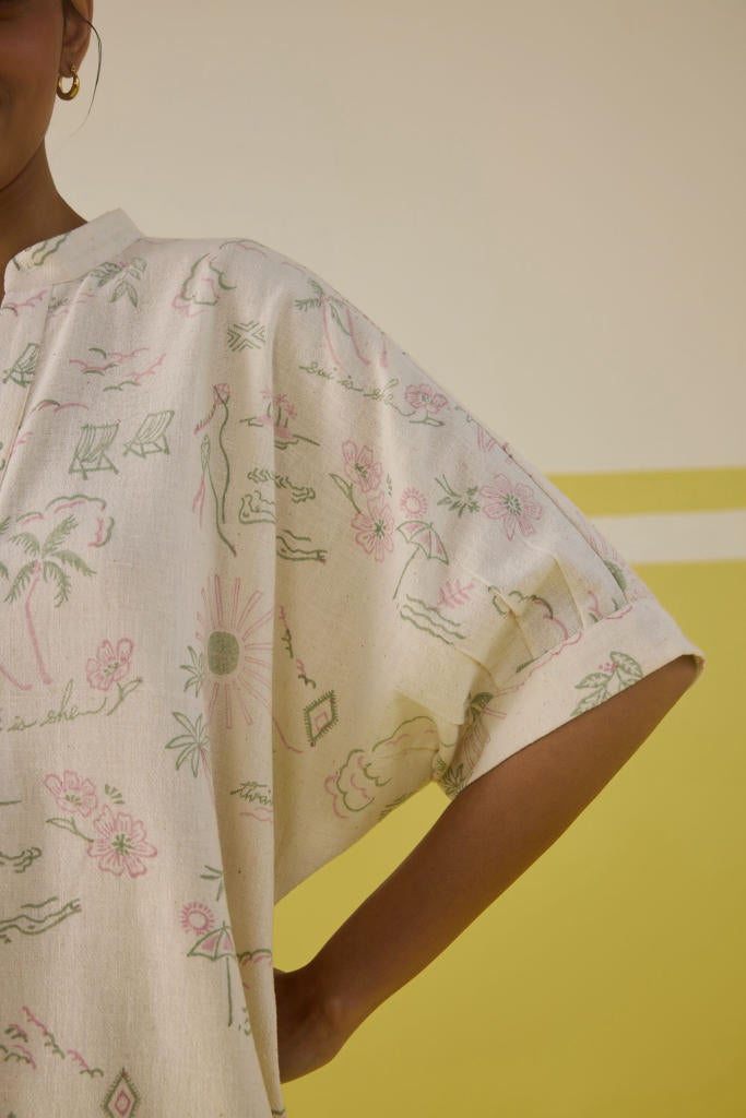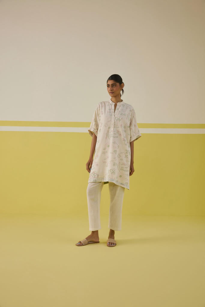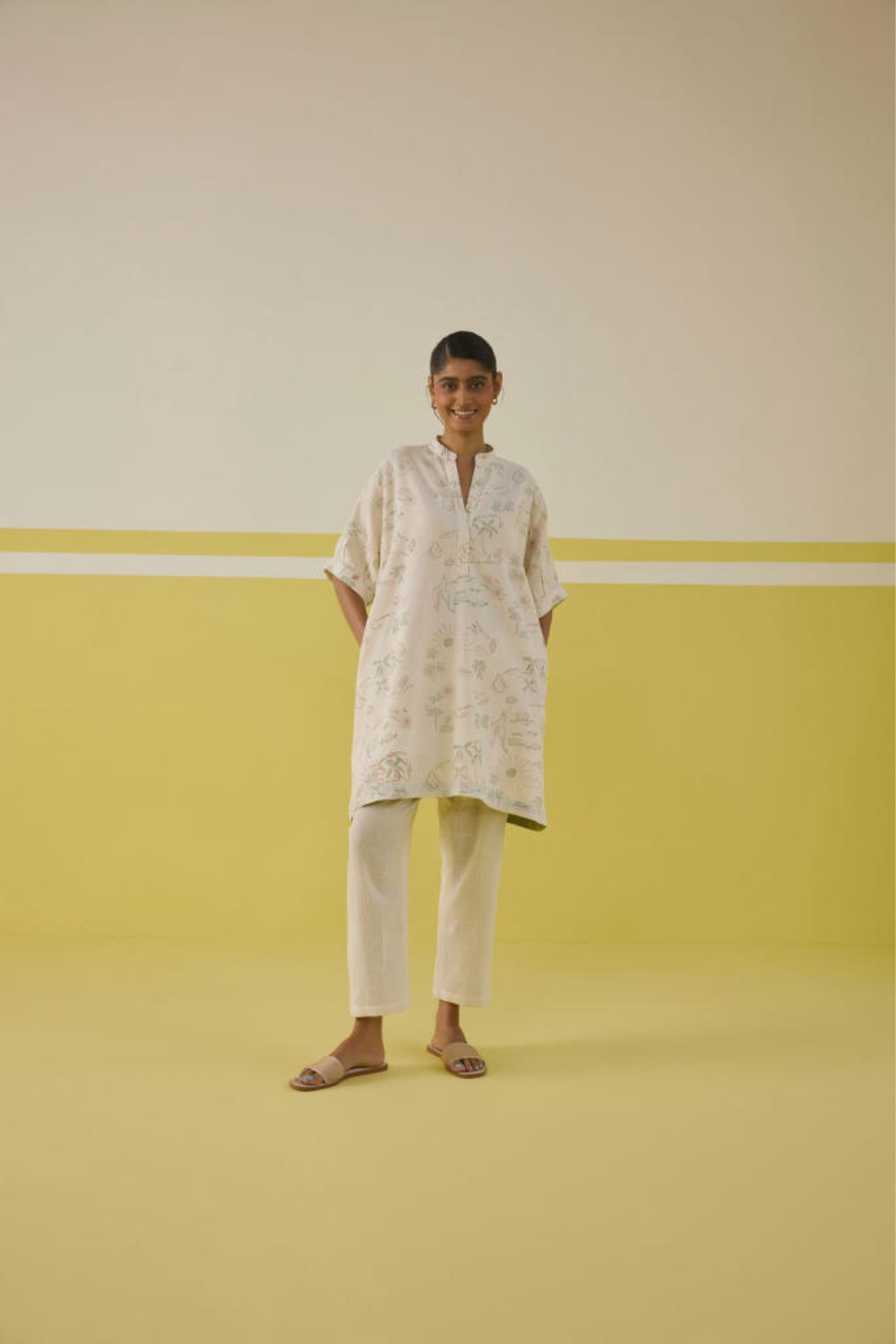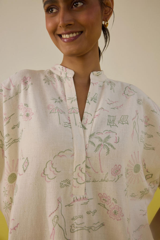 Relaxed fit, wide half sleeve, split crew neck kurta top crafted in handspun and handwoven organic cotton fabric, hand block printed with our signature summer-inspired motif using azo-free dyes.