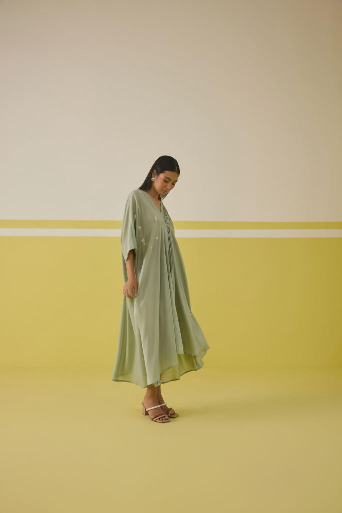 Size worn by model: XS-S, Height: 5'8, kaftaan length (center) : 45.5", kaftaan length ( Side): 51.5", bust: 60", sleeve opening:17", neck drop: 9.5", slit LENGTH: 11"