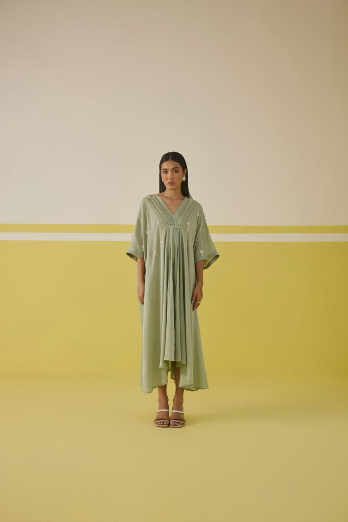 Relaxed fit, half-sleeve, v-neck, midi dress that gathers at the front crafted in azo-free dyed Lyocell fabric, machine embroidered with summer-inspired motifs.