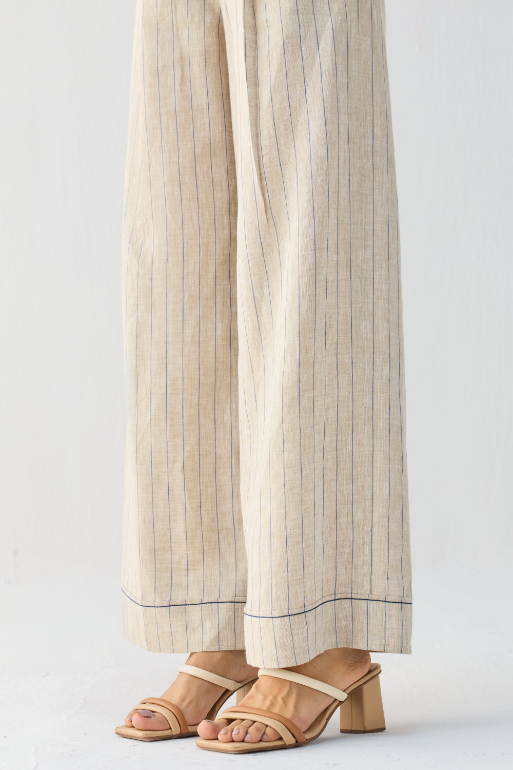 Regular fit, wide-leg trousers that buttons at the waist, crafted in striped 100% linen fabric.