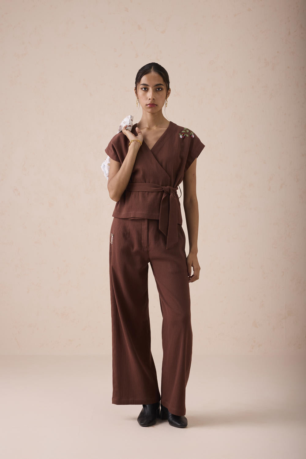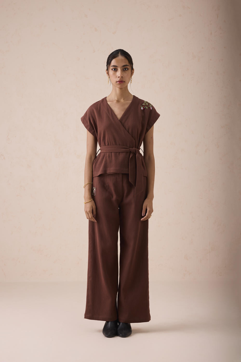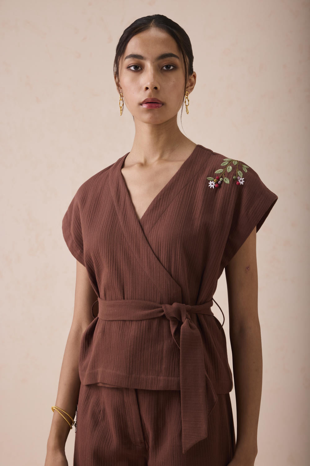 Regular fit, short-sleeve, v-neck, wrap top with tie at the waist, crafted in azo-free dyed, double gauze organic cotton fabric, hand embroidered with motifs inspired by flower fields.
