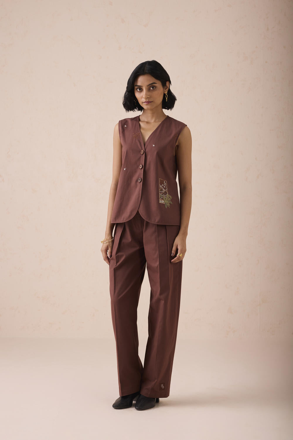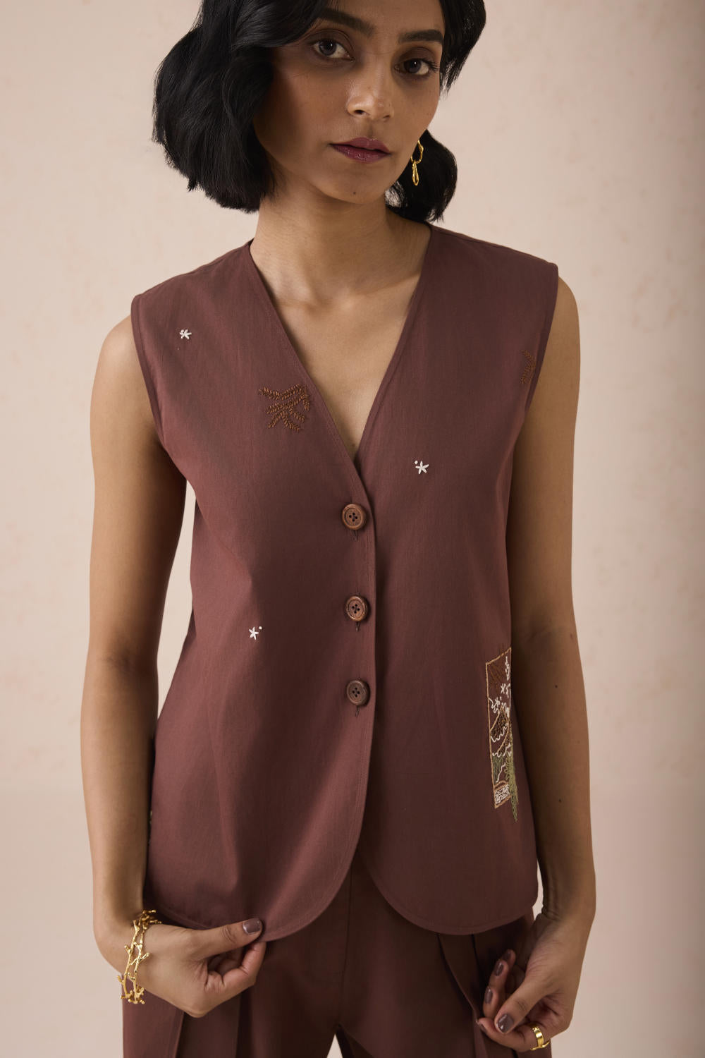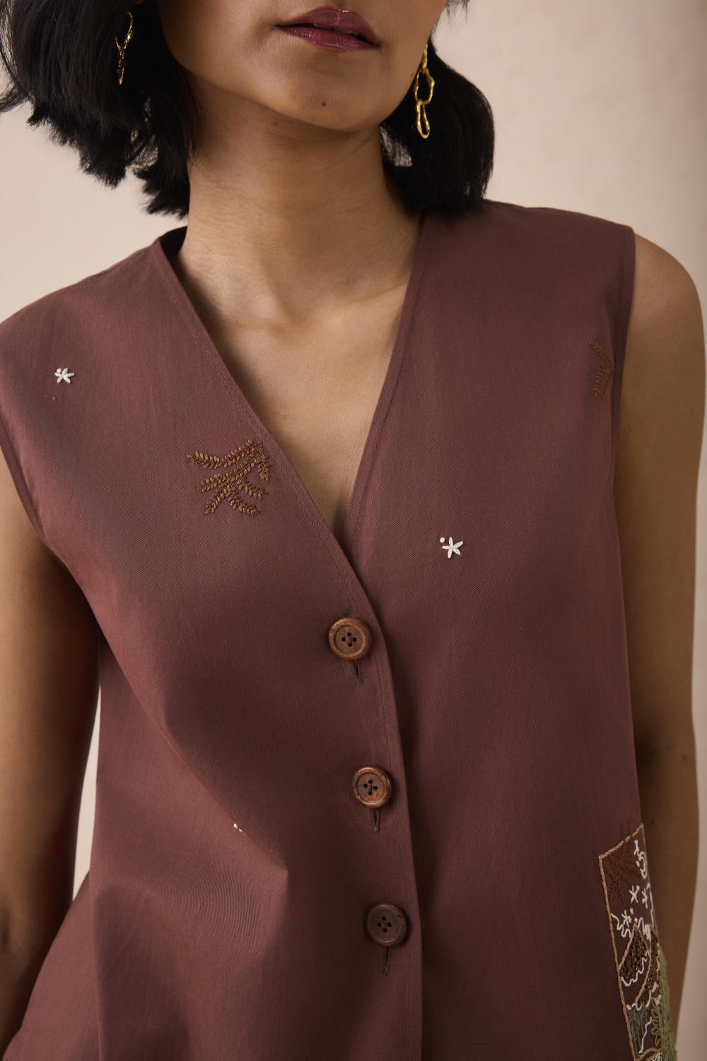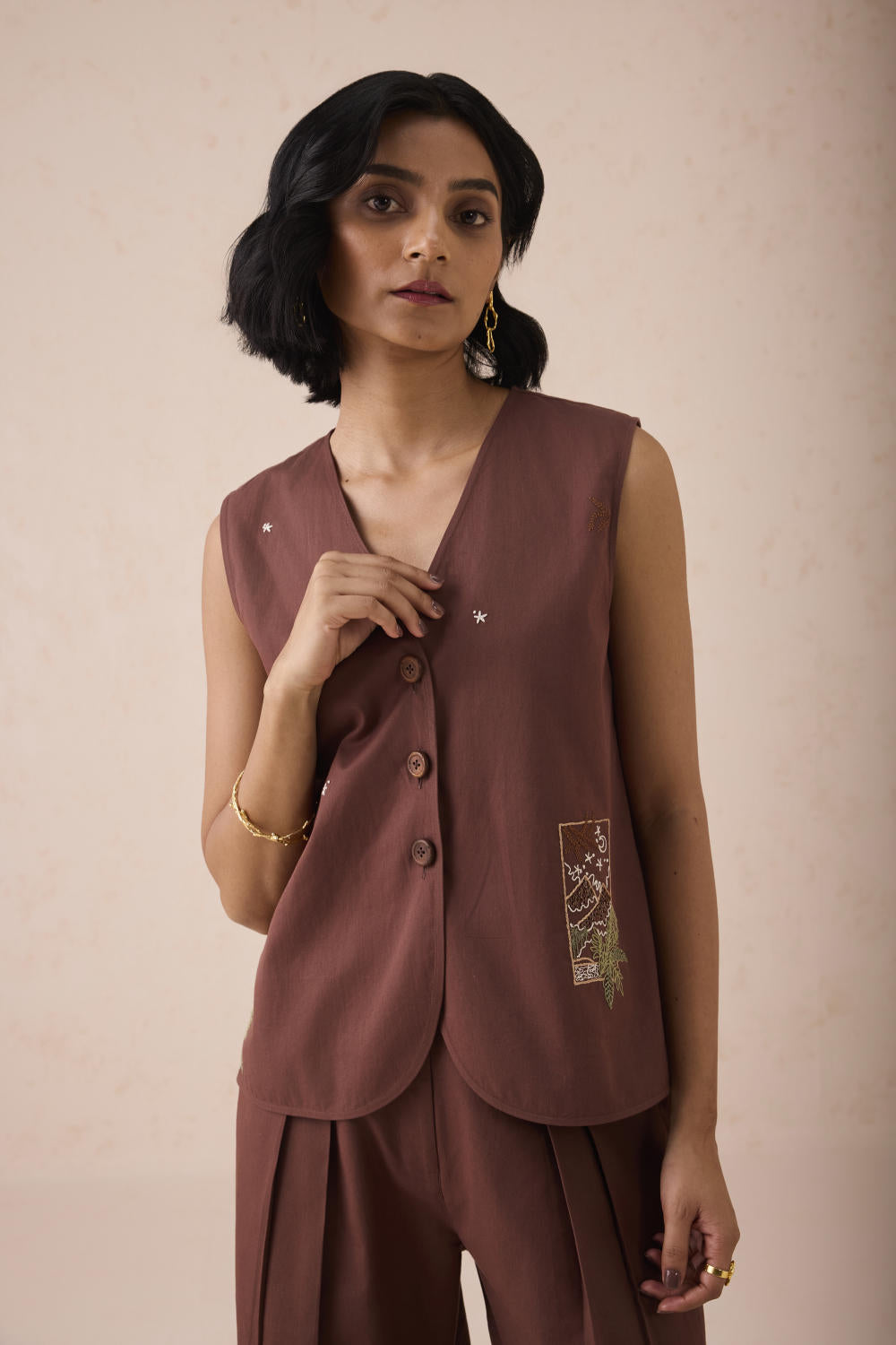 Regular fit, v-neck sleeveless, waistcoat top that buttons at the front, crafted in azo-free dyed organic cotton twill fabric, machine and hand embroidered with message and mountain motifs.