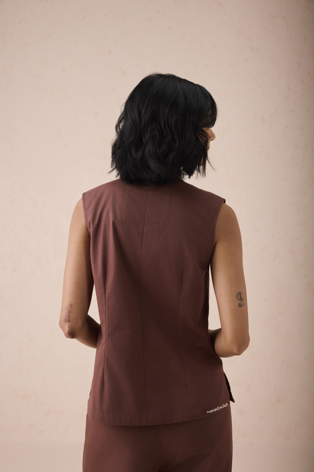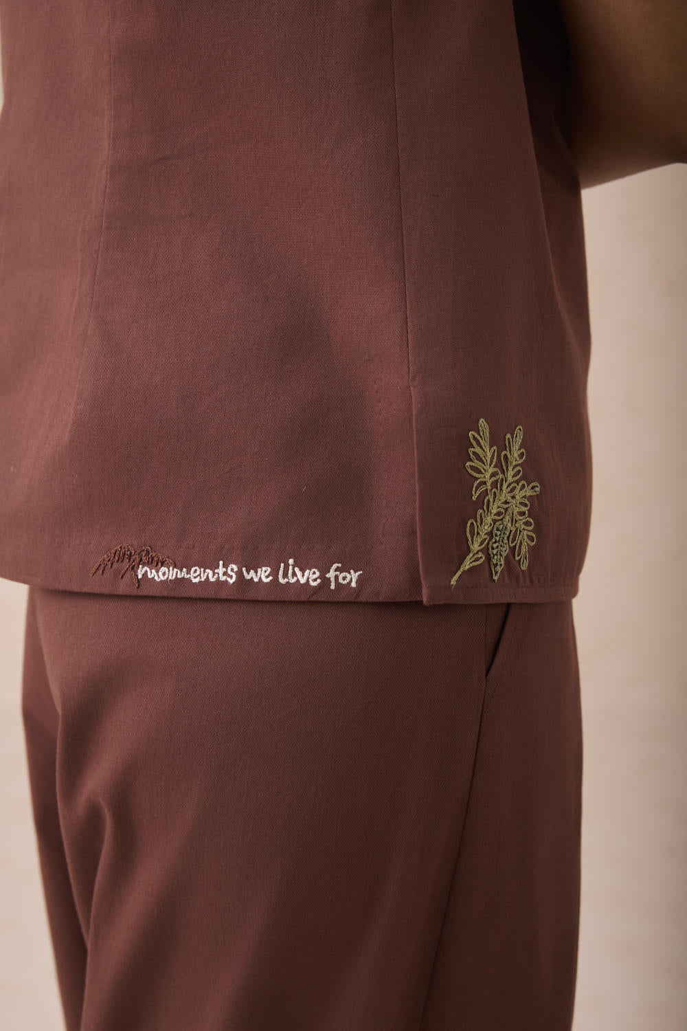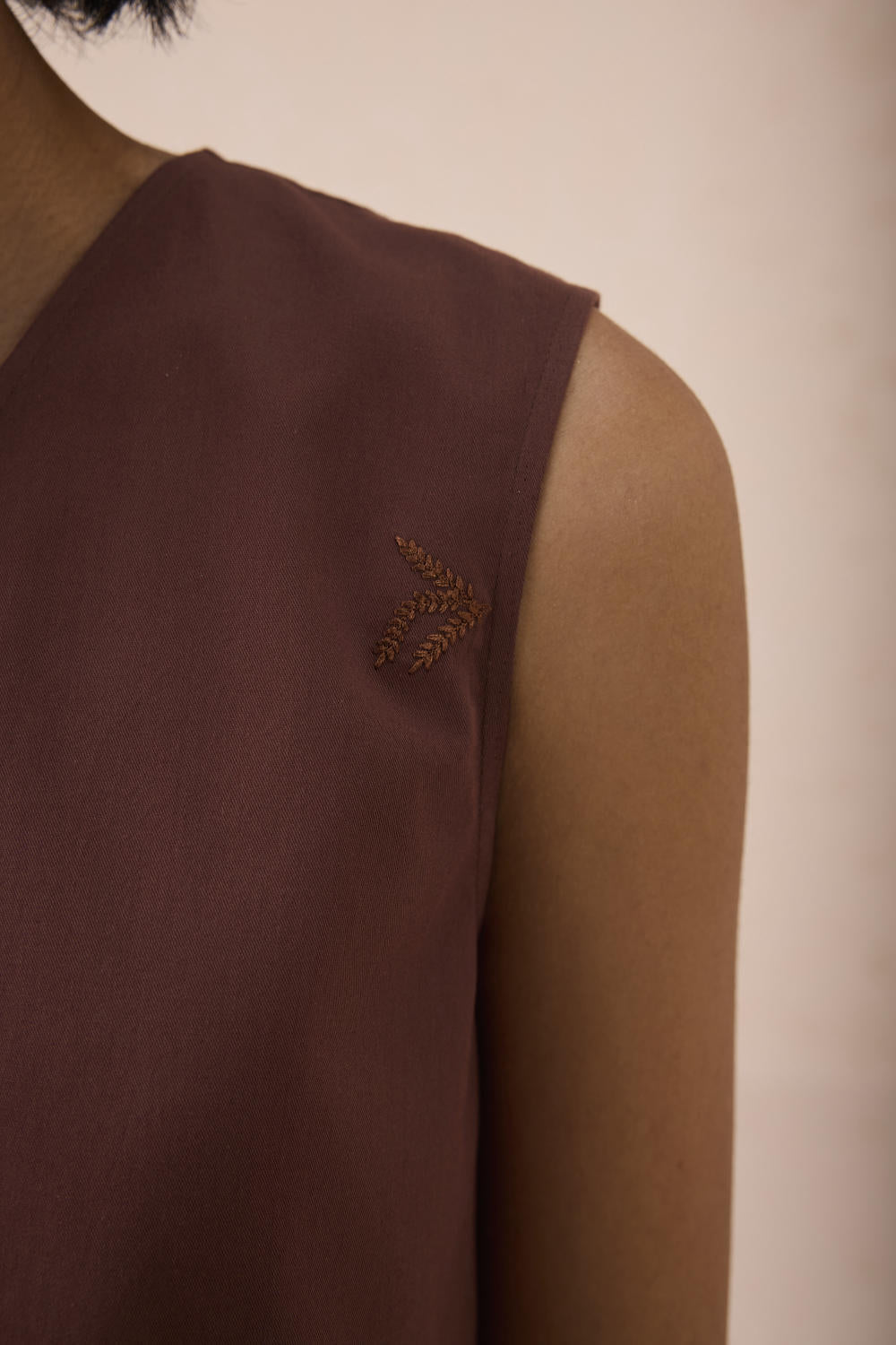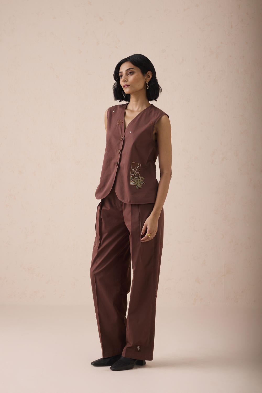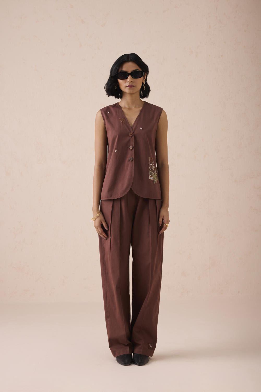 Regular fit, v-neck sleeveless, waistcoat top that buttons at the front, crafted in azo-free dyed organic cotton twill fabric, machine and hand embroidered with message and mountain motifs.