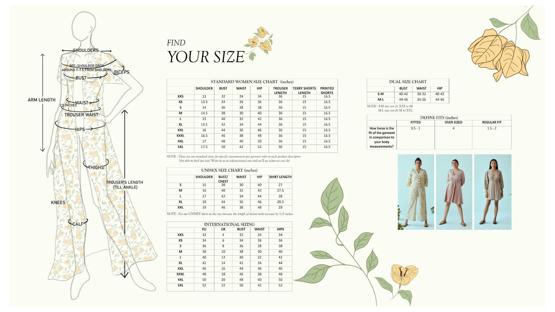 | UNISEX SIZE CHART (inches) | SHOULDER | BUST/CHEST | WAIST | HIP | SHIRTLENGTH |