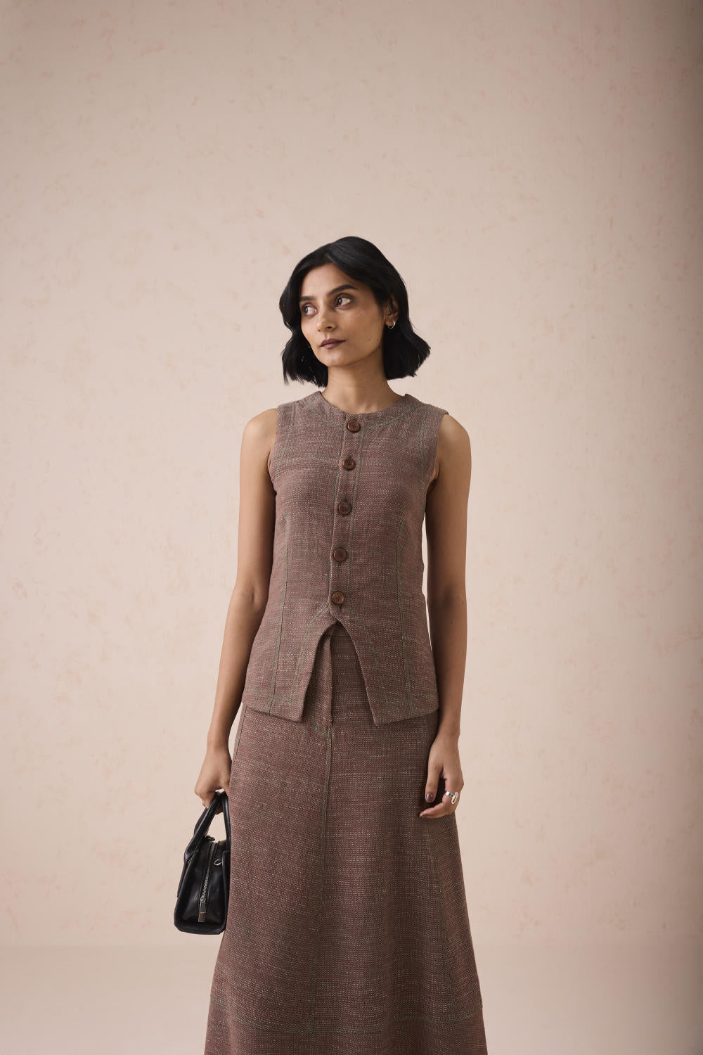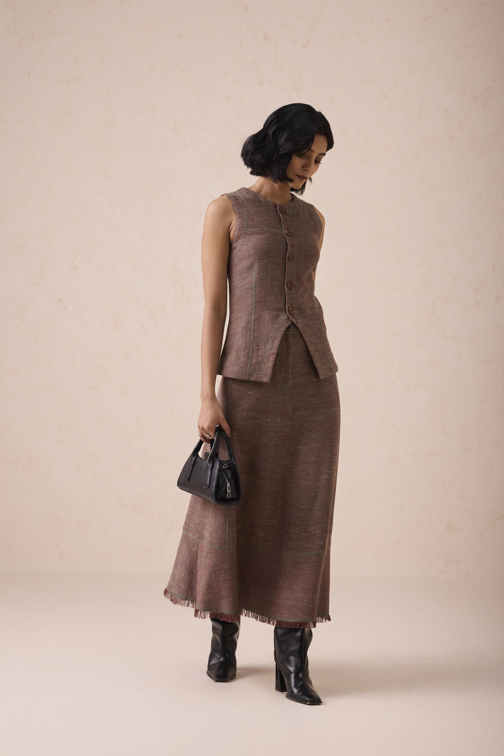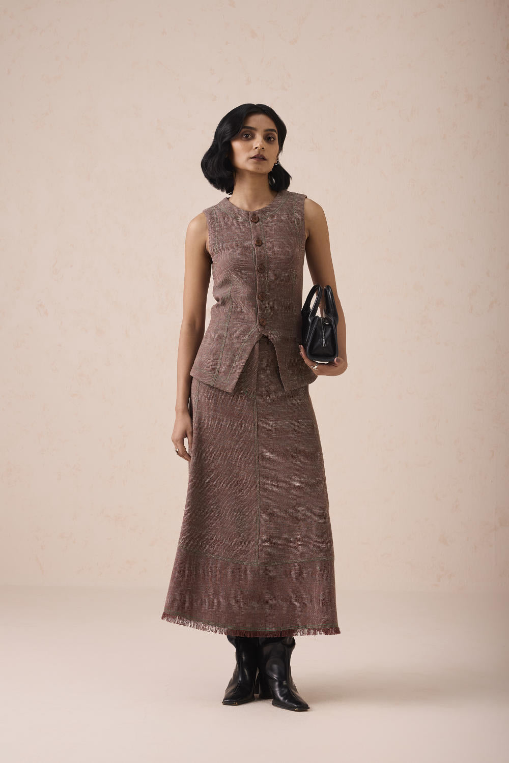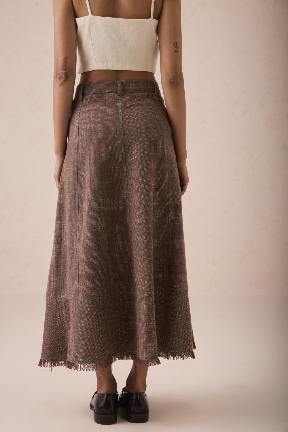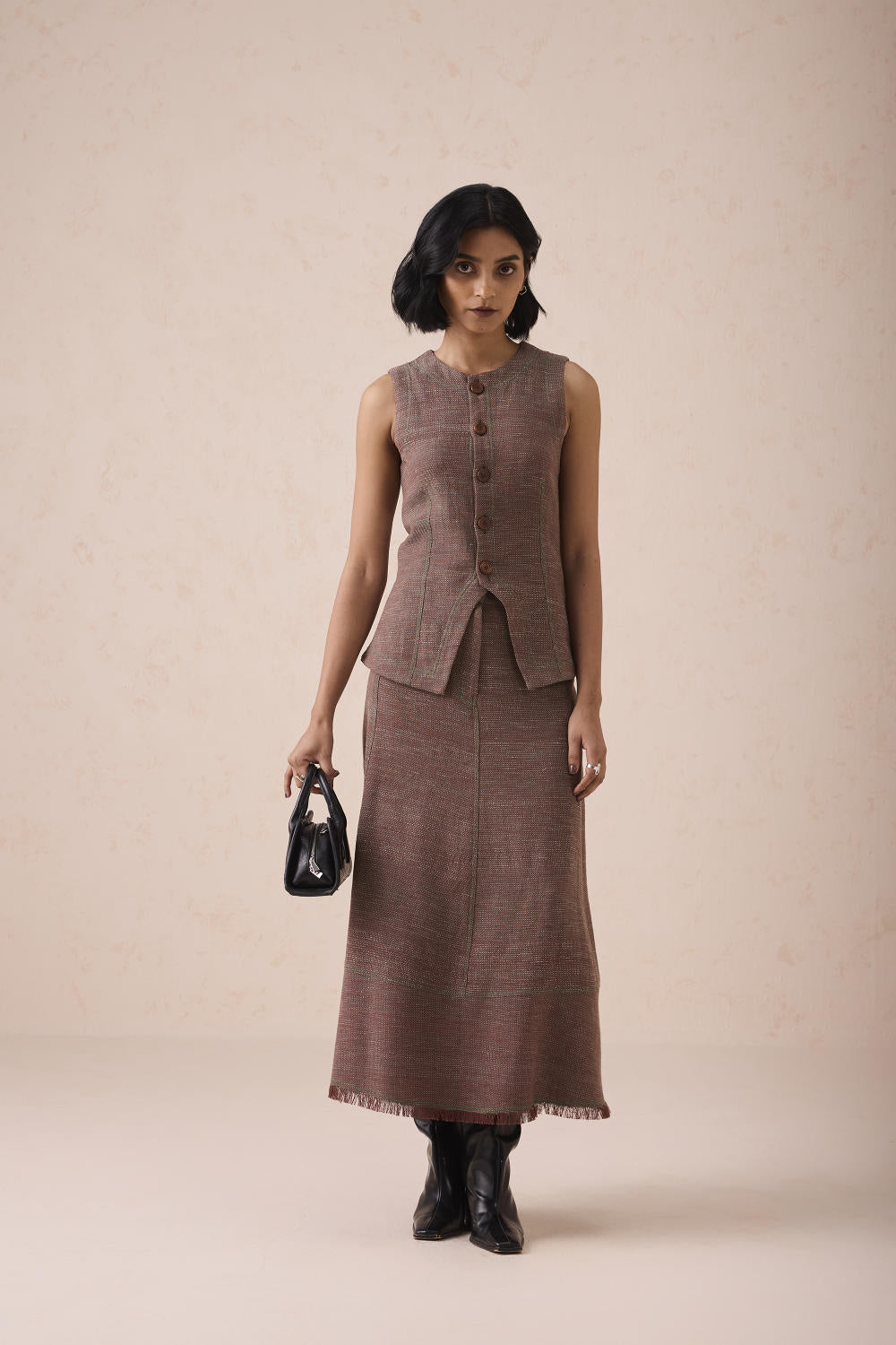 Fitted, a-line midi skirt that buttons at the waist, crafted in azo-free dyed, handspun and handwoven organic cotton fabric.