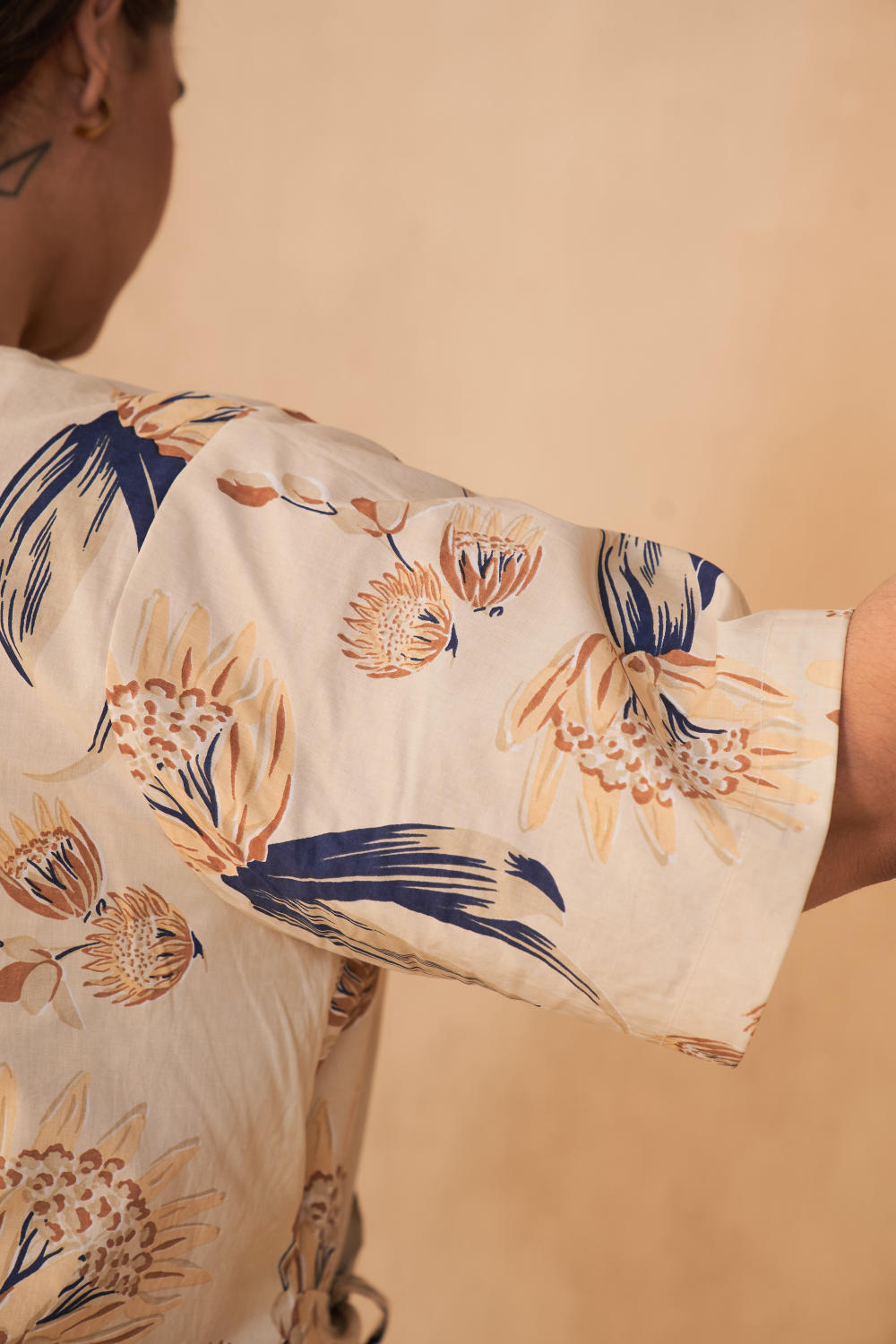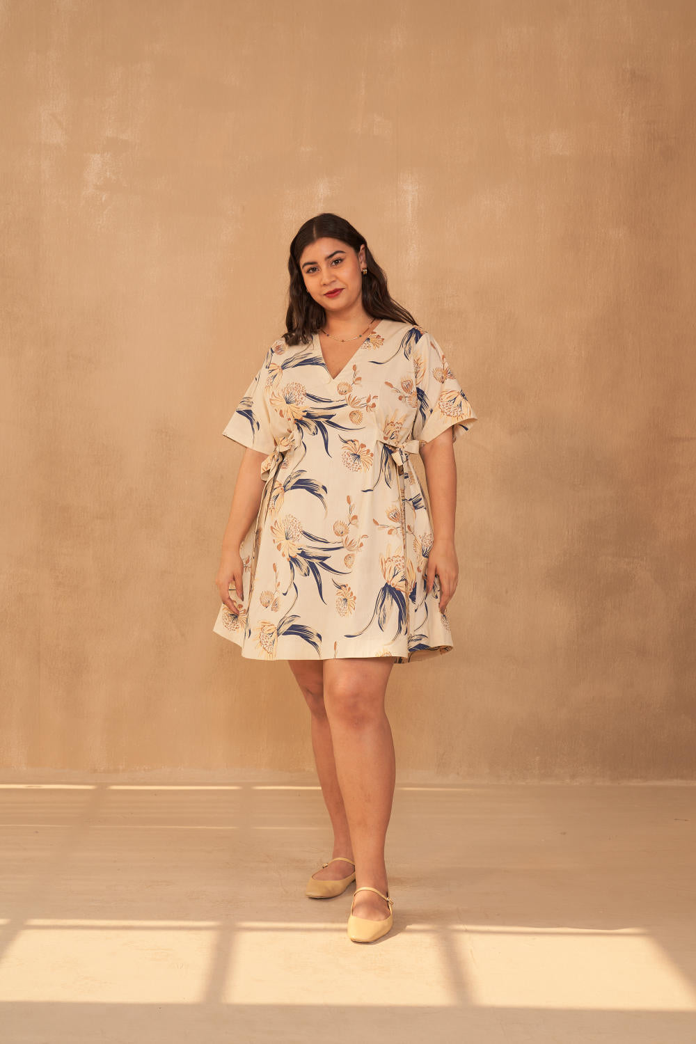Relaxed fit, short-sleeve, v-neck mini dress with ties at the sides crafted in organic cotton poplin fabric, screen printed with our signature Strength (Astrantia flower) motif using azo-free dyes. Timeless looks like this dress are a must for conscious closets. Dress it up with jewelry and heels for when you go out, or keep it super simple for casual occasions.