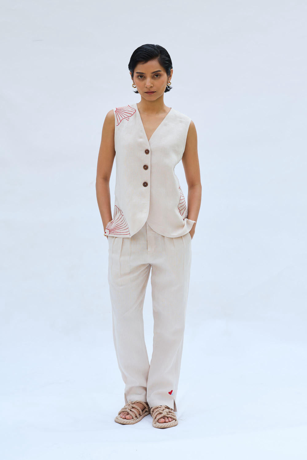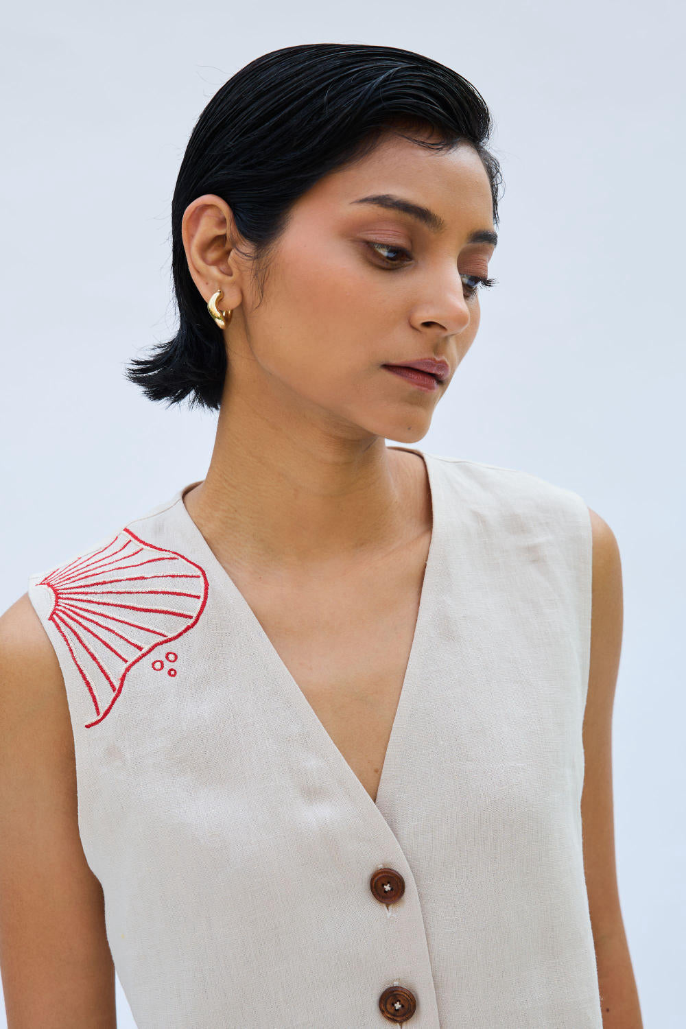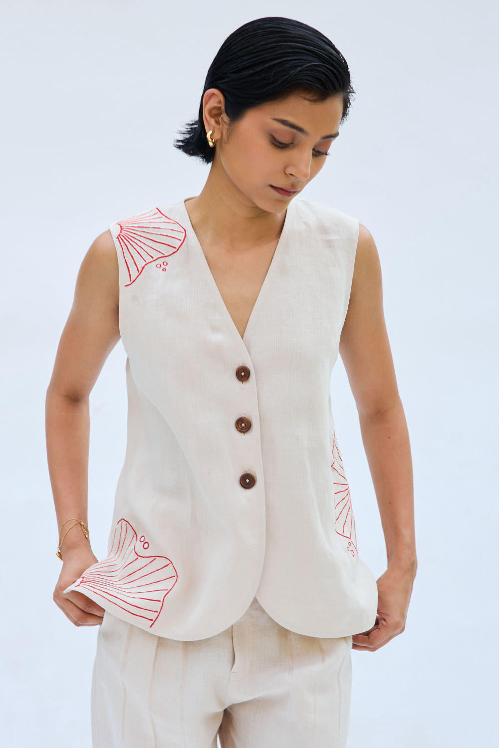 Regular fit, v-neck sleeveless, waistcoat top that buttons at the front, crafted in azo-free dyed linen fabric, machine embroidered with ocean-inspired motifs.