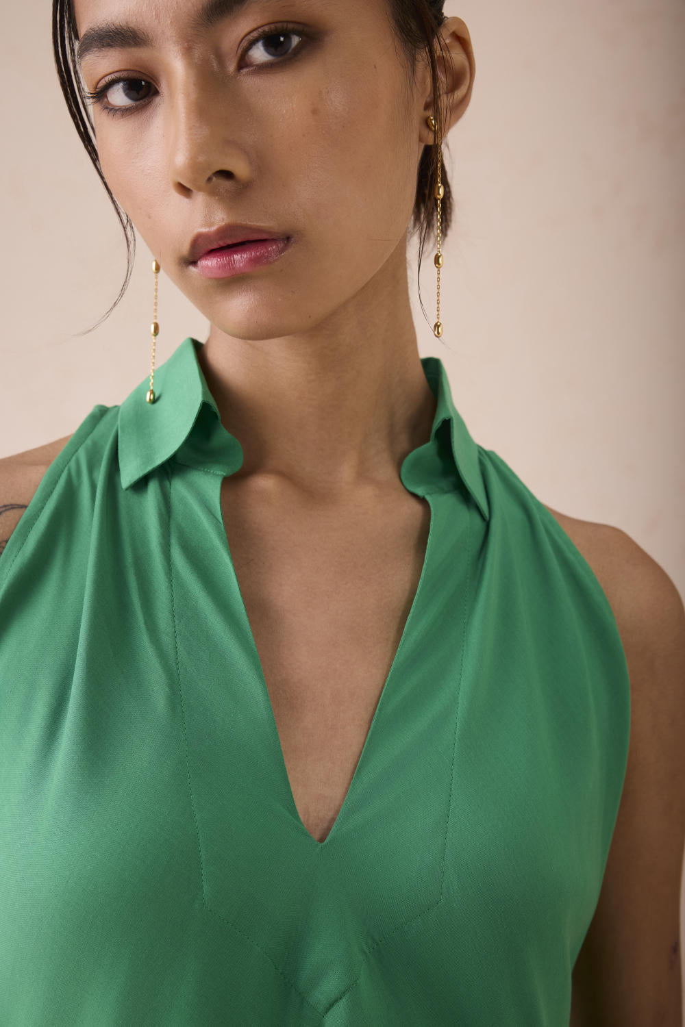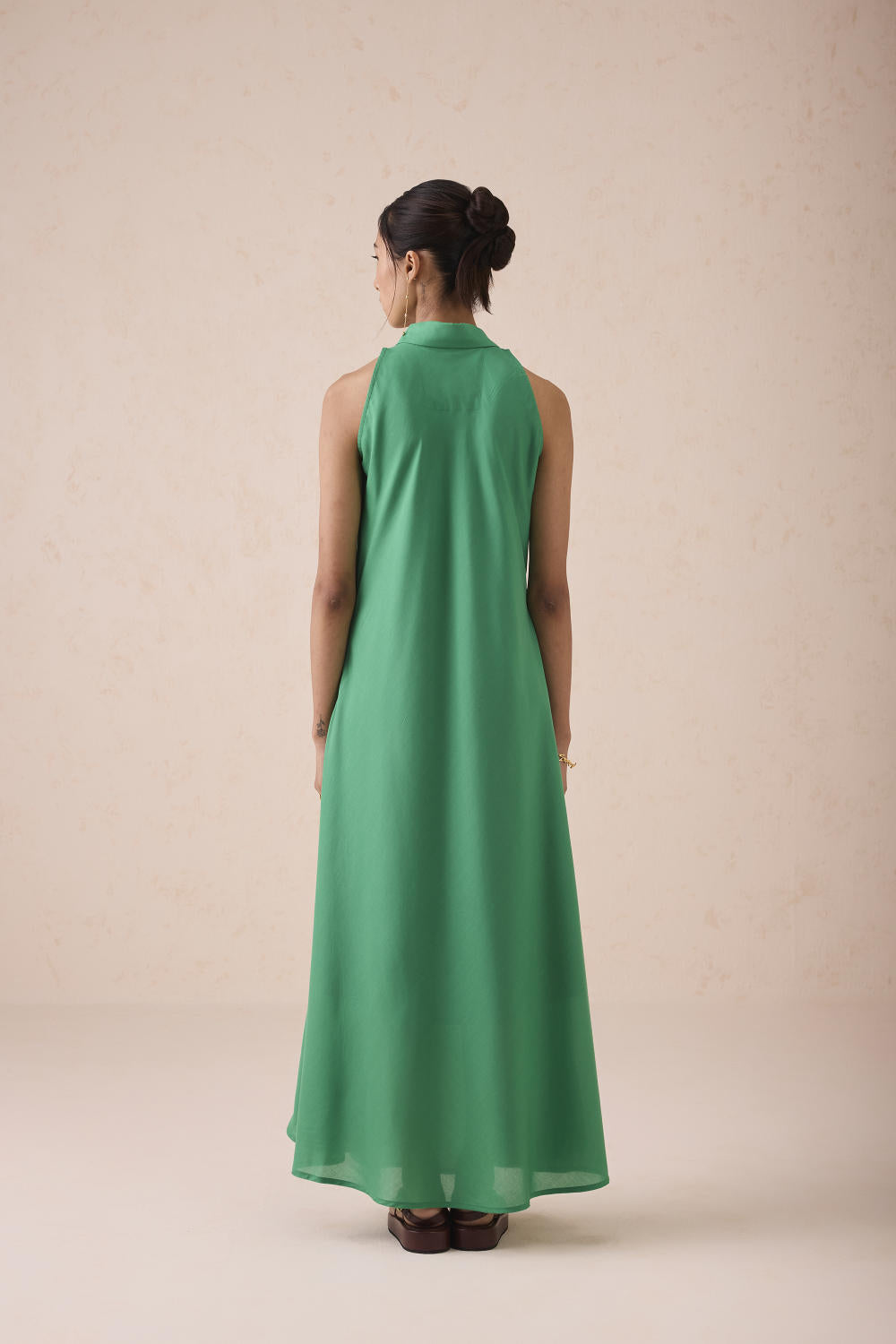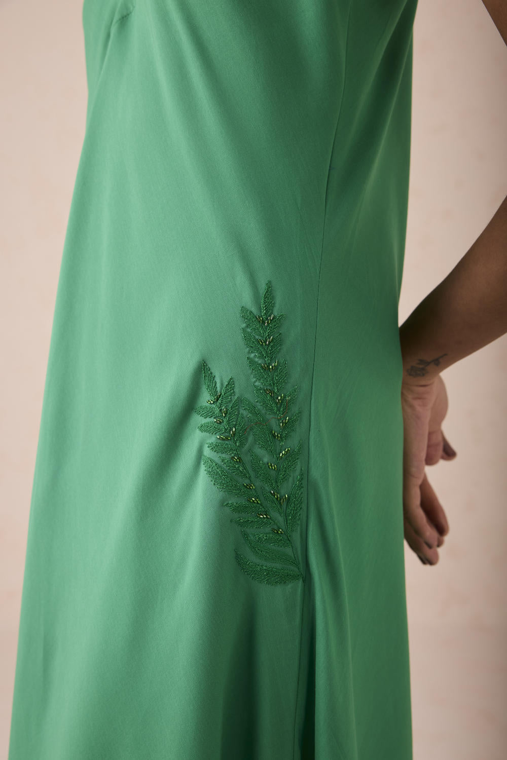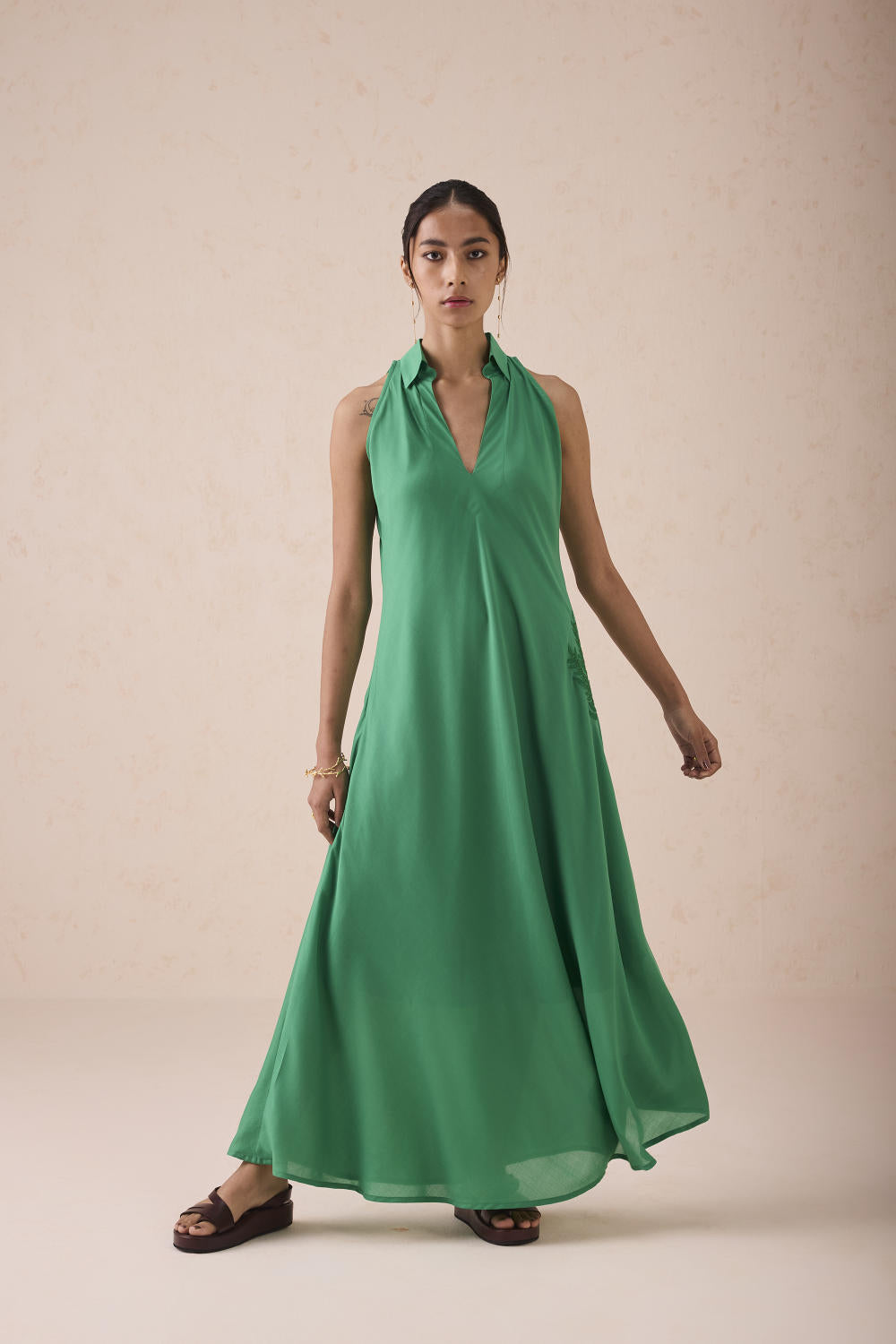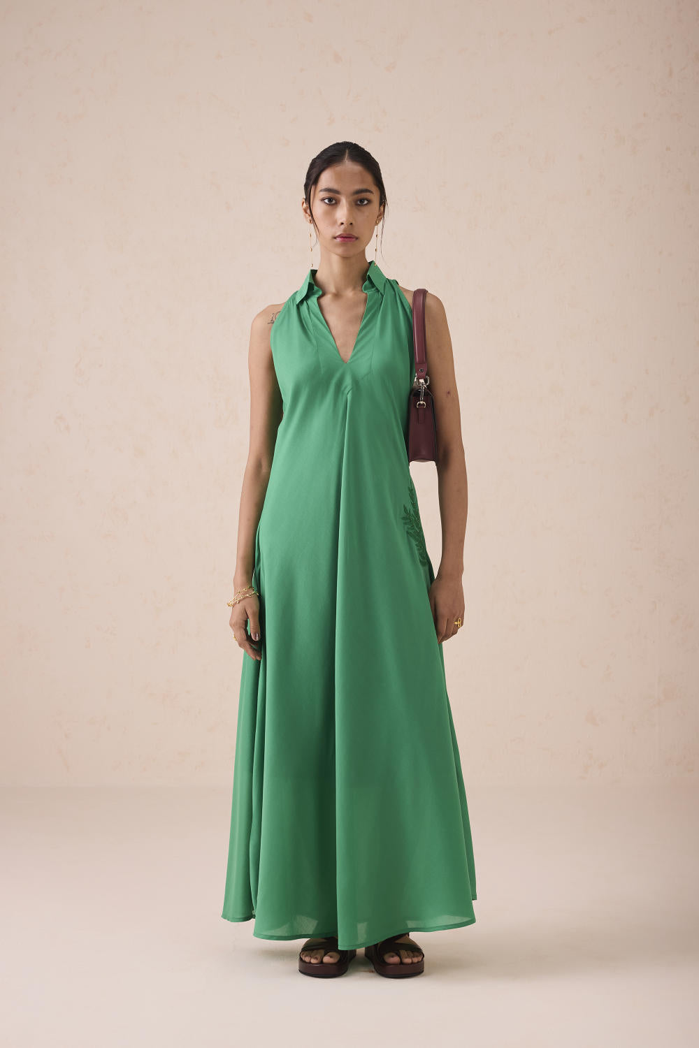 Relaxed fit, sleeveless, v-neck, collared maxi dress crafted in azo-free dyed lyocell fabric, machine and hand embroidered with leaf motifs.