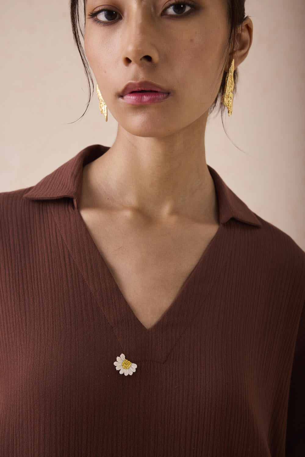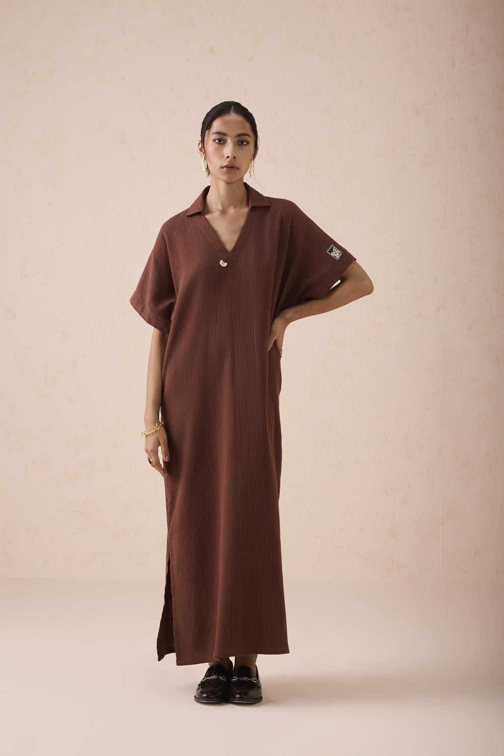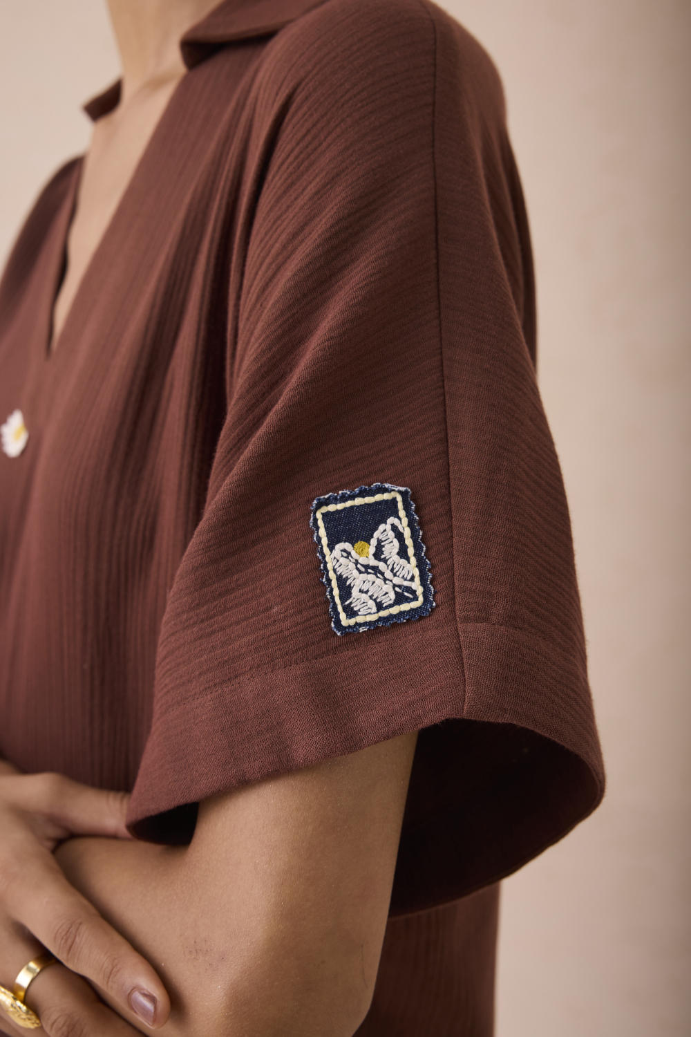 Relaxed fit, short sleeve, v-neck, collared maxi dress crafted in azo-free dyed double gauze organic cotton fabric, hand embroidered with mountain and daisy motifs.