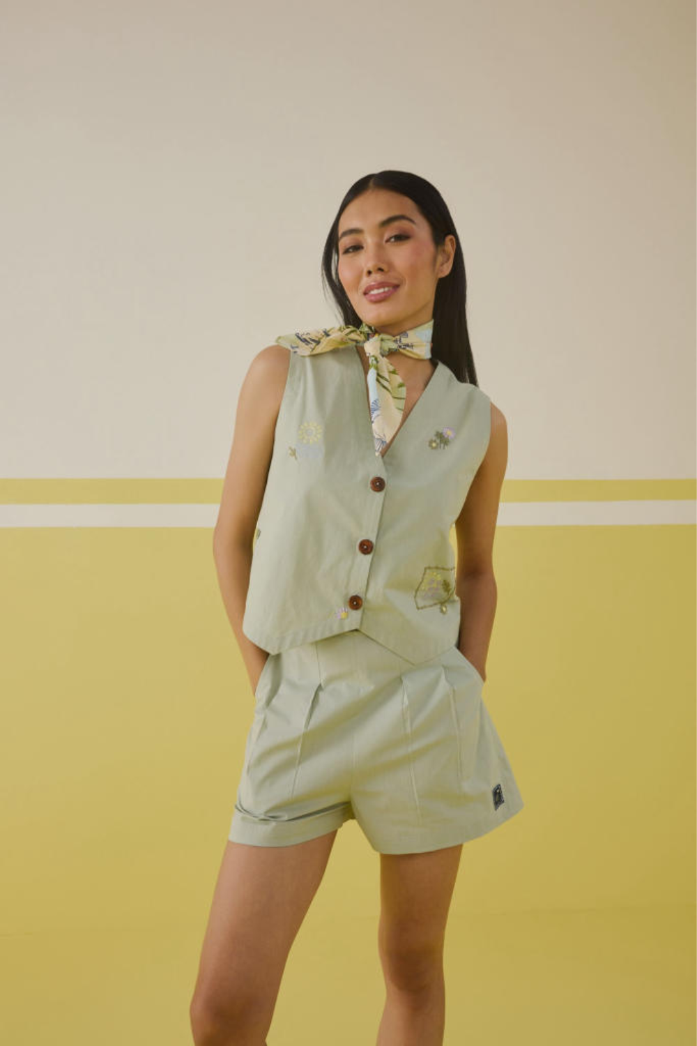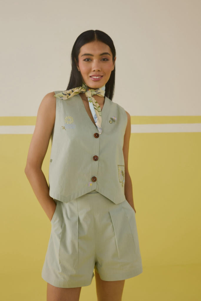 Regular fit, v-neck, sleeveless waistcoat top that buttons at the front crafted in azo-free dyed organic cotton poplin fabric, machine and hand embroidered with summer-inspired motifs.