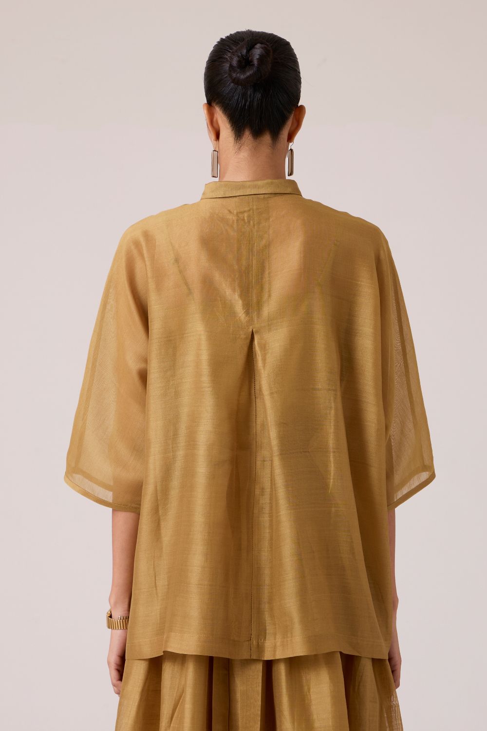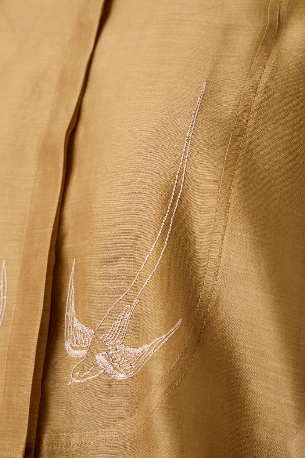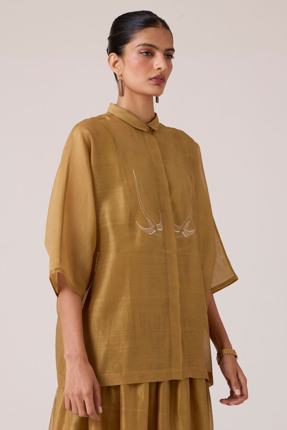 Embroidery punctuates clarity. With a slim collar and dolman sleeve, this top balances quiet detail with deliberate ease.