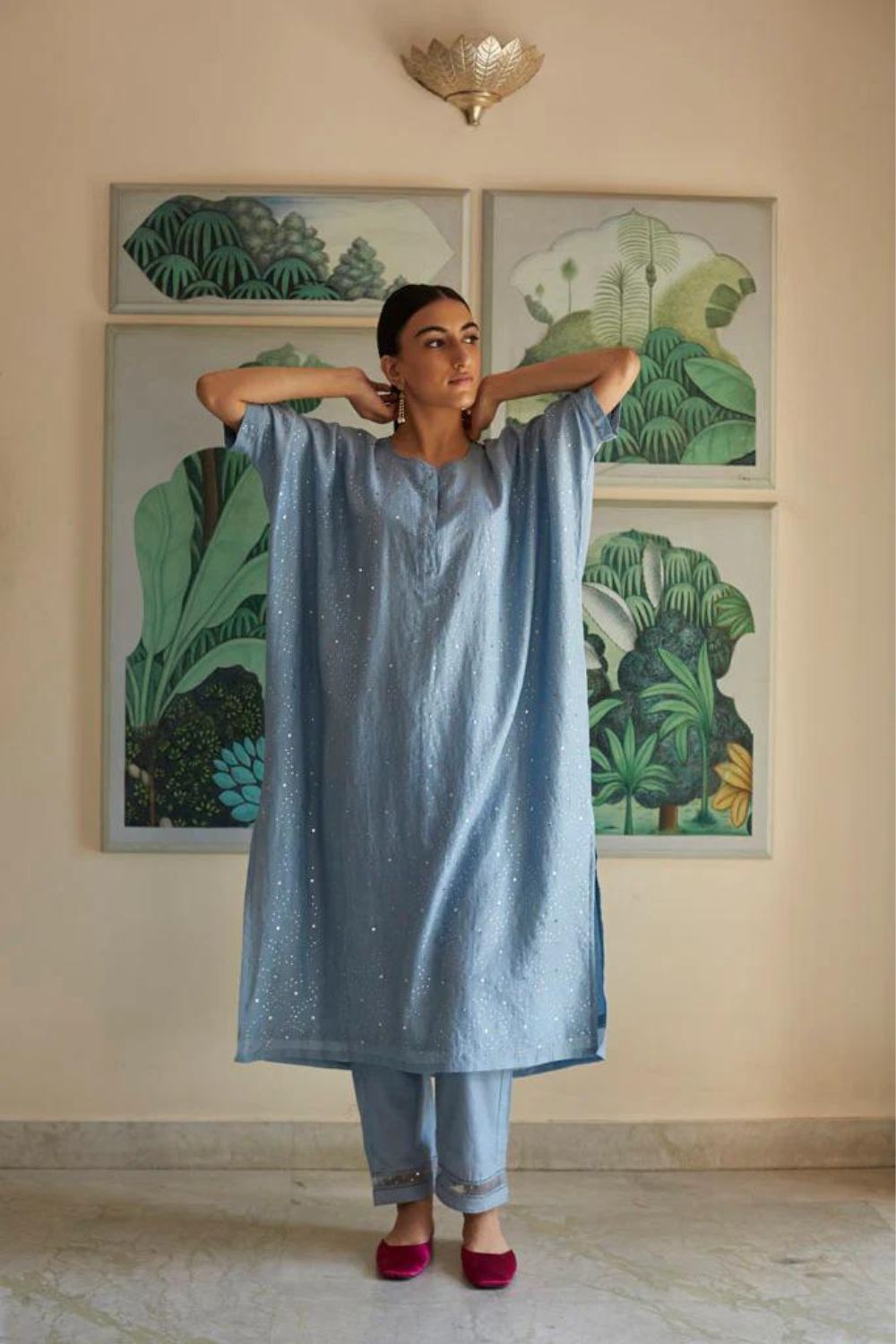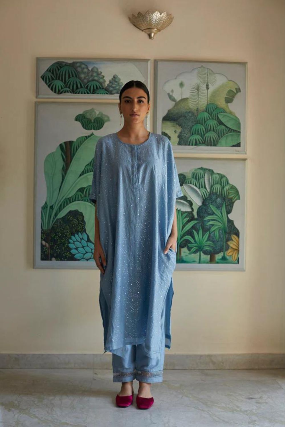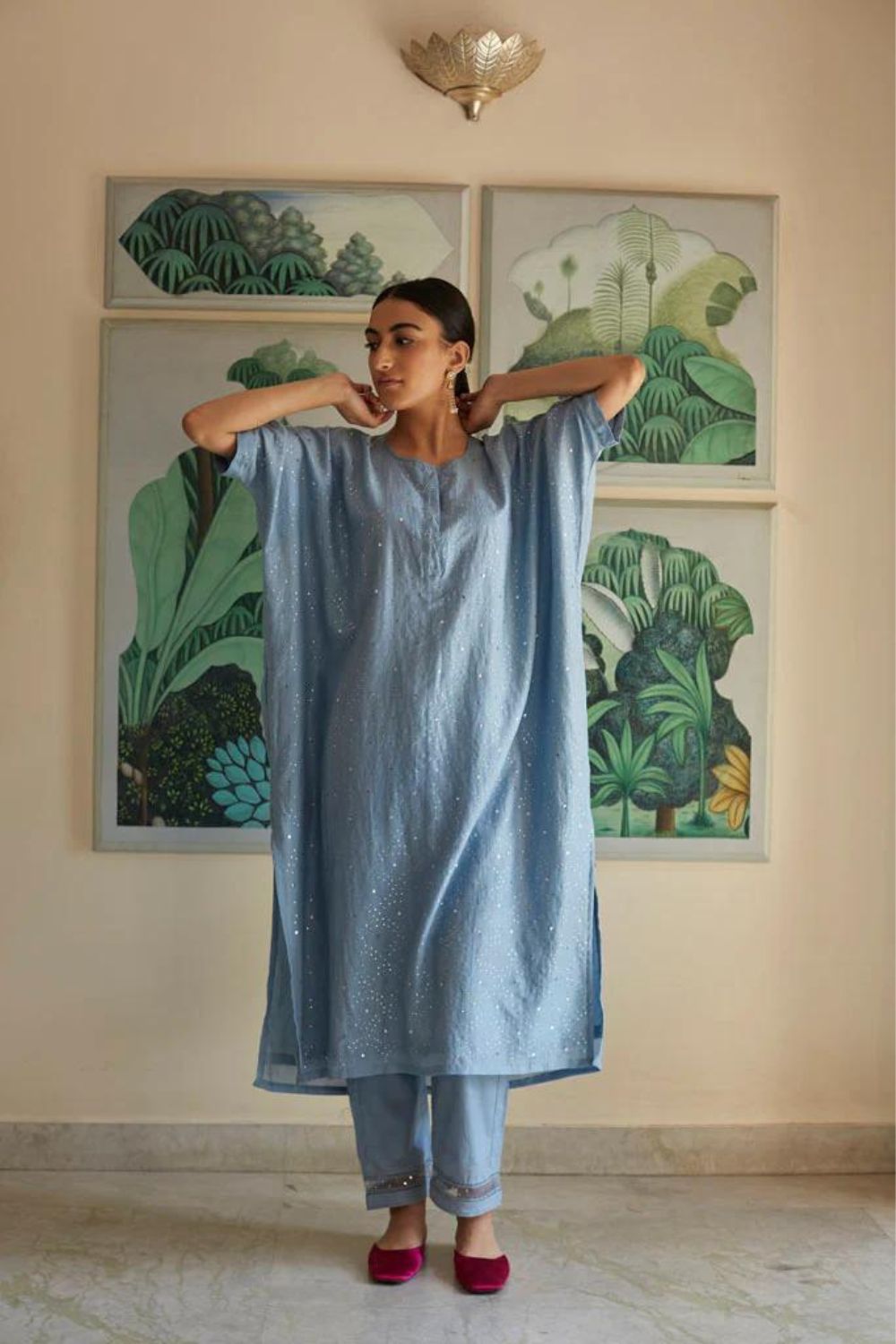 Cotton silk Kaftan style oversized kurta in jodhpur blue color ,with all over hand embroidered silver Mukaish work jaal. This is paired with straight pajama style pants , in cotton Mul fabric with jaali and organza with sitara embroidered detail on its bottom.