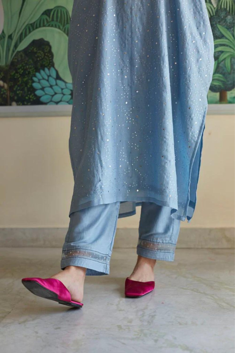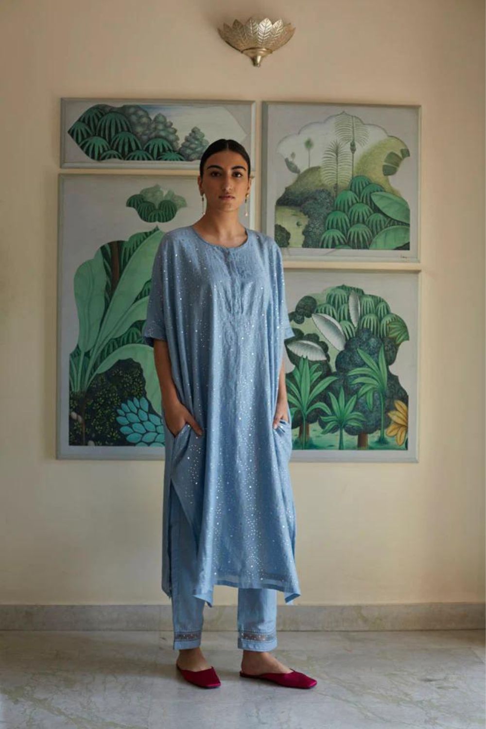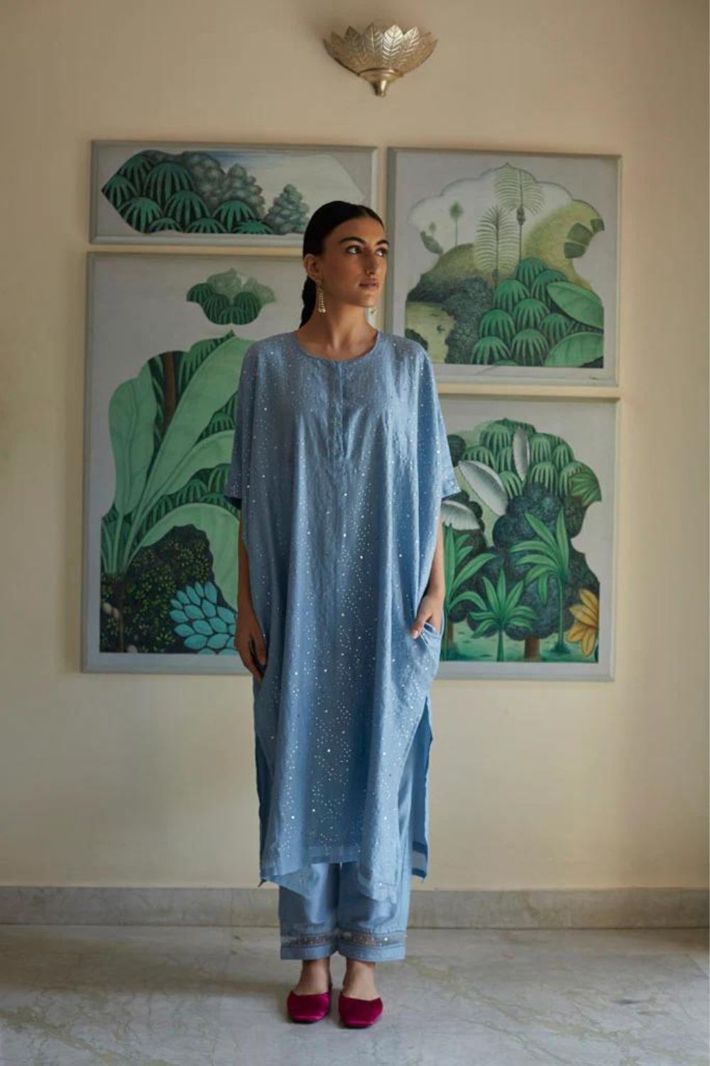 Cotton silk Kaftan style oversized kurta in jodhpur blue color ,with all over hand embroidered silver Mukaish work jaal. This is paired with straight pajama style pants , in cotton Mul fabric with jaali and organza with sitara embroidered detail on its bottom.