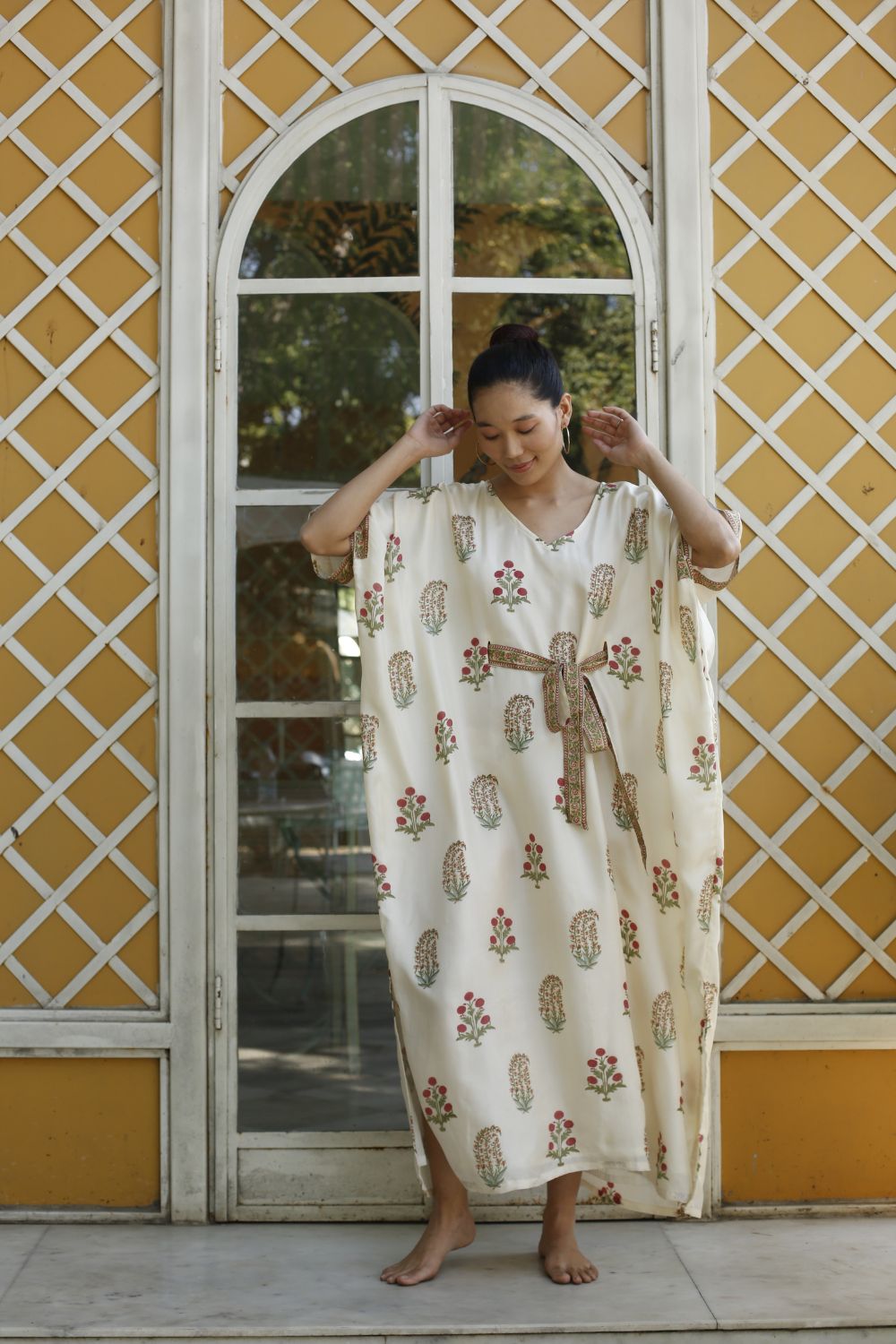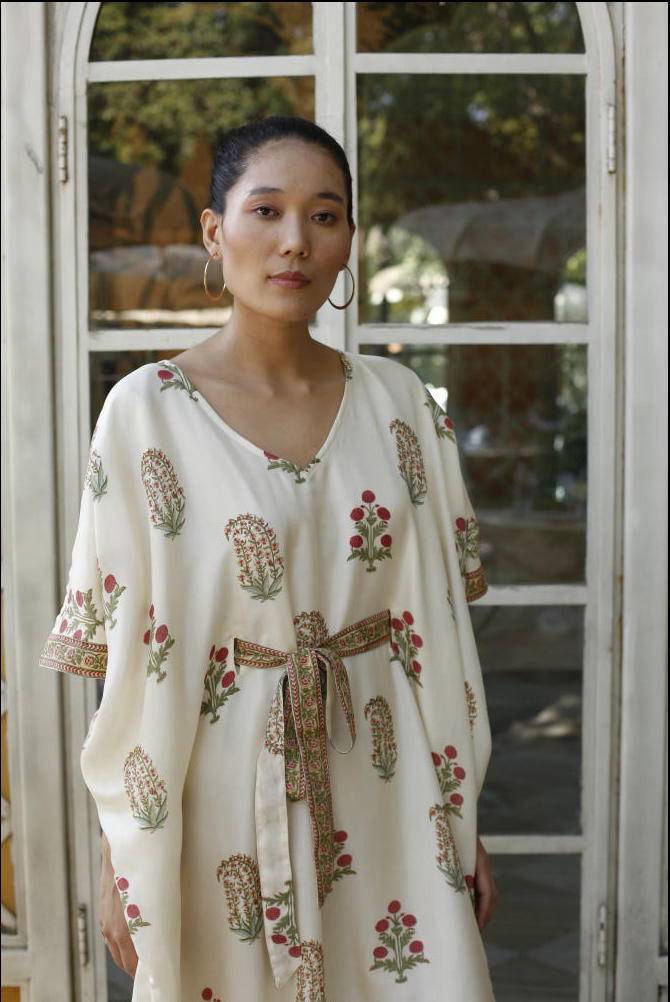Hand printed 100% pure cotton kaftaan with a belted waist and cotton mulmul lining.. All our printing is done by our partner artisans in the neighbouring printing