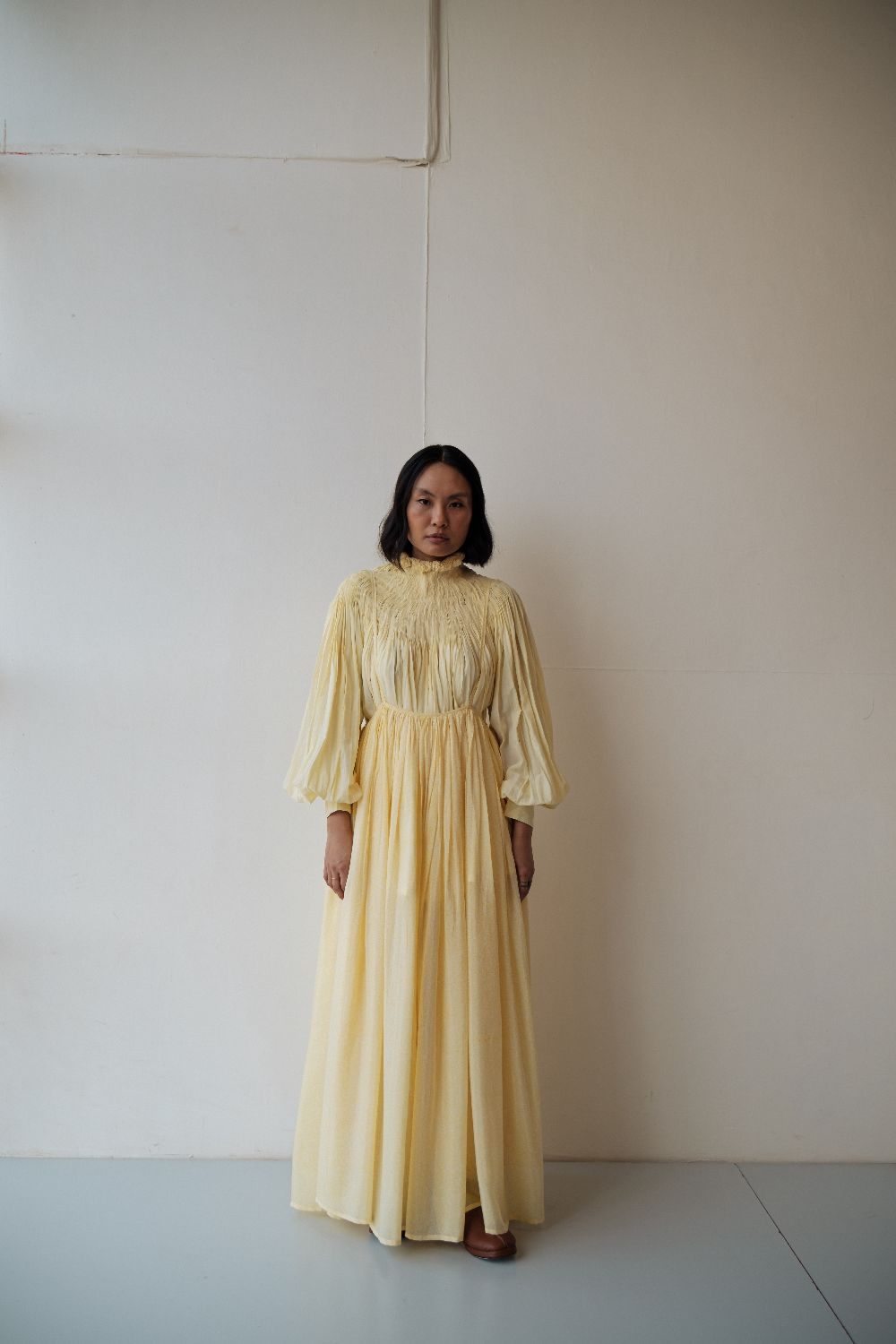 Butter yellow cotton pleated top paired here with an