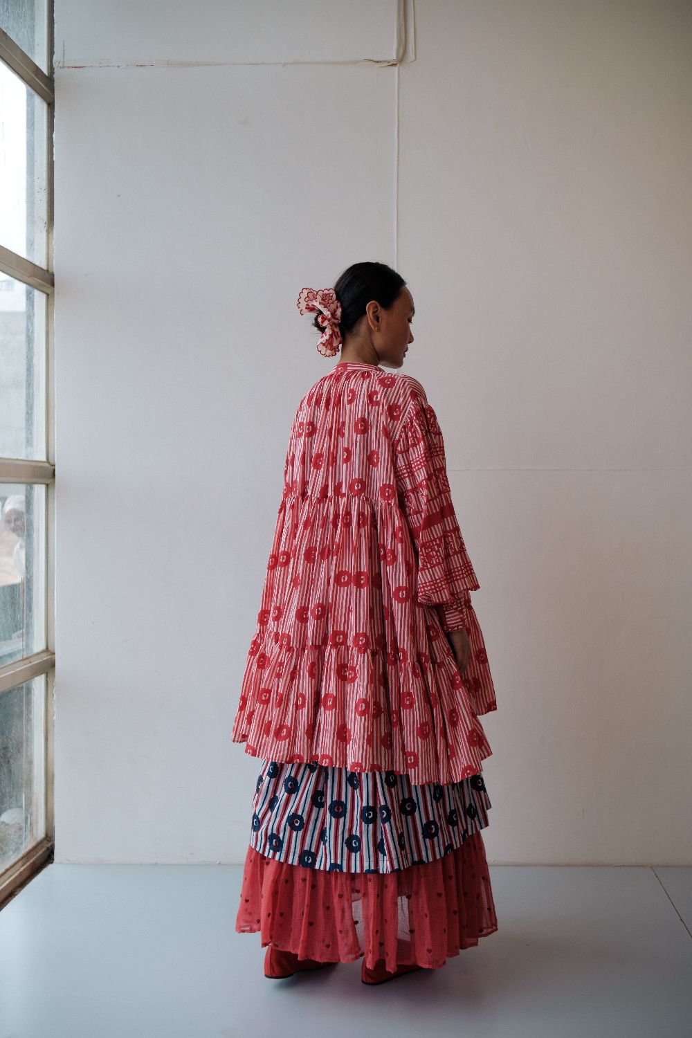 short hand-block printed dress, with hand block printing by our partner artisans in Jaipur. Thread Scalloped detailing on sleeves in colour. Dress is made in cotton.