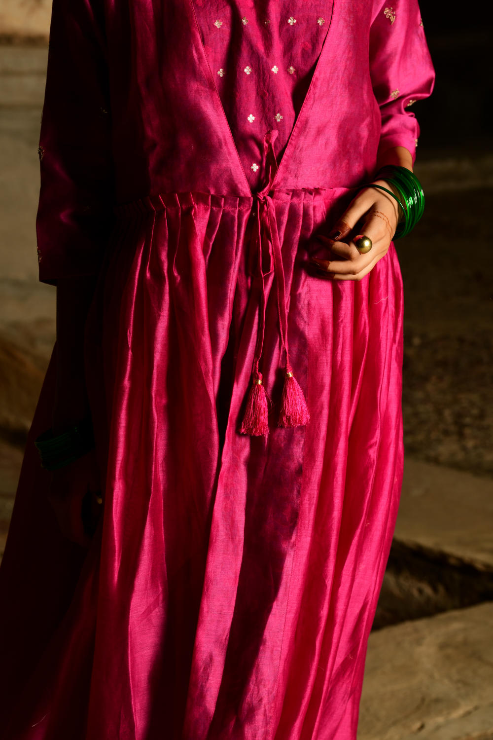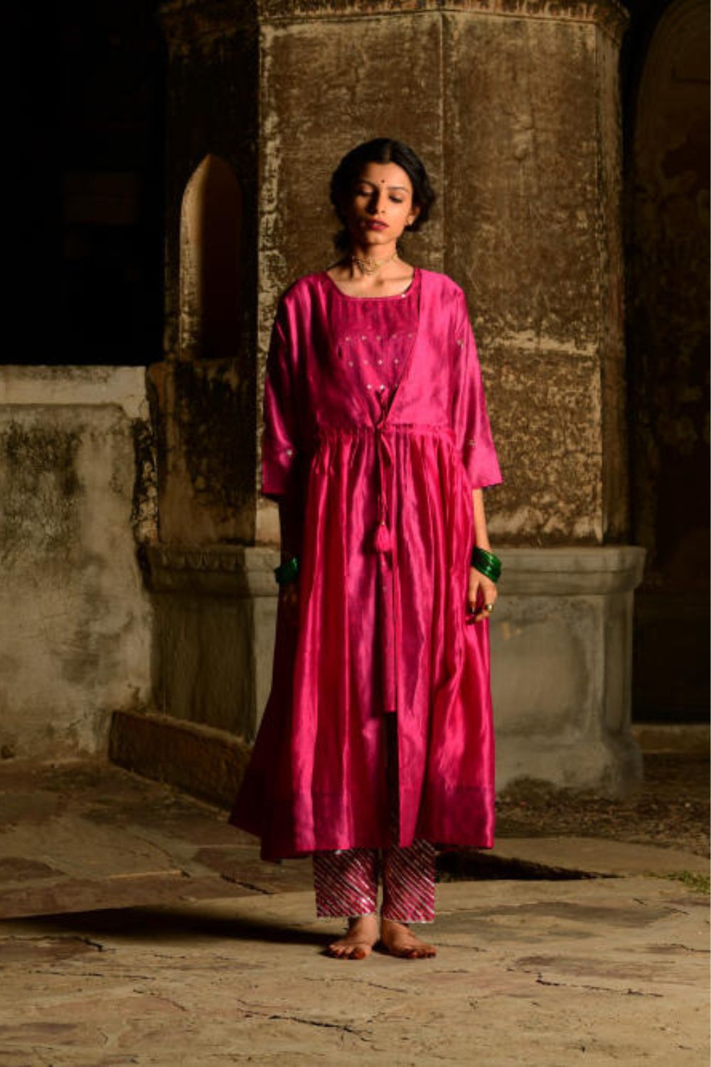 Handspun Rani pink chanderi kurta with knife pleats on the waist. Outfit is a 2 piece set at comes with a front tie with handmade resham tassels.Inner slip is a chanderi jaquard fabric woven with small silver mughal booties. Sleeves are embroidered with mukaish silver-gold flowers on them.Pants are also in chanderi embroidered with gota and sequins lines in a horizonatal fashion.Pants come with an elastic back and front tie for comfortable wear.Lining used is of cotton mumul handblock printed in a mughal buta inspired from Amer in Jaipur.