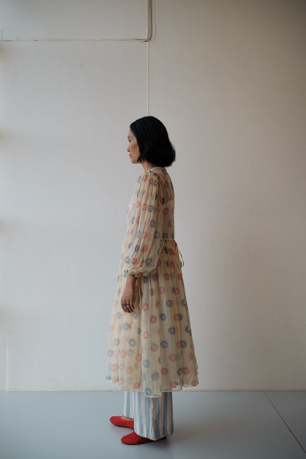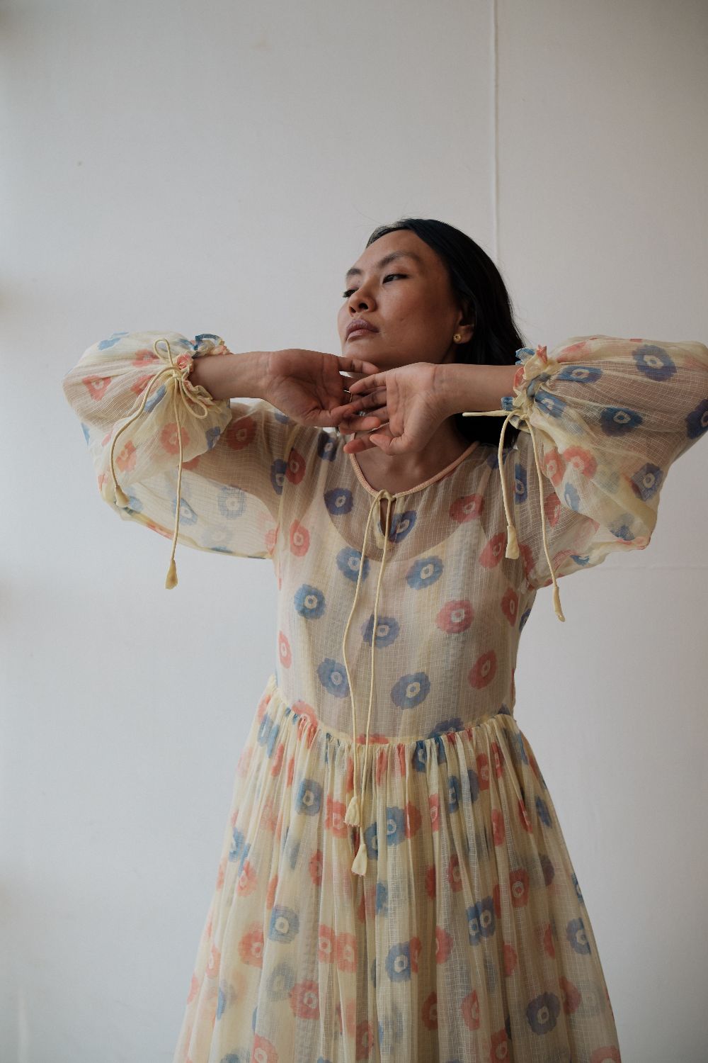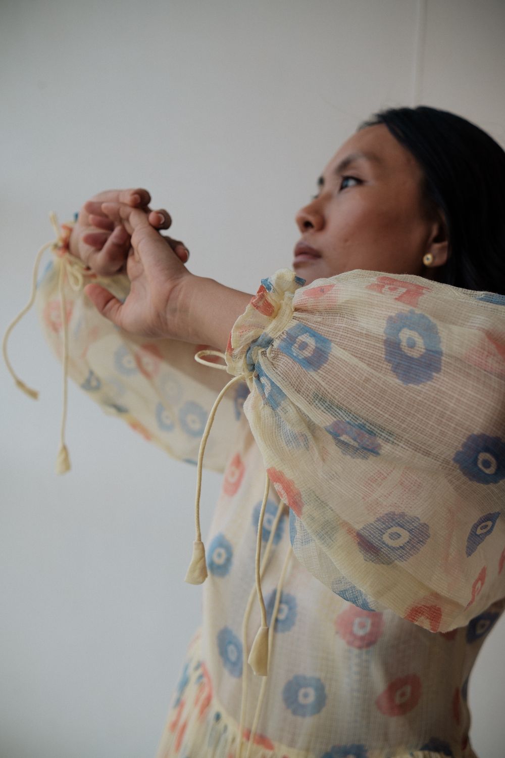 printing details. Paired with a adjustable strap slip dress in hand-block