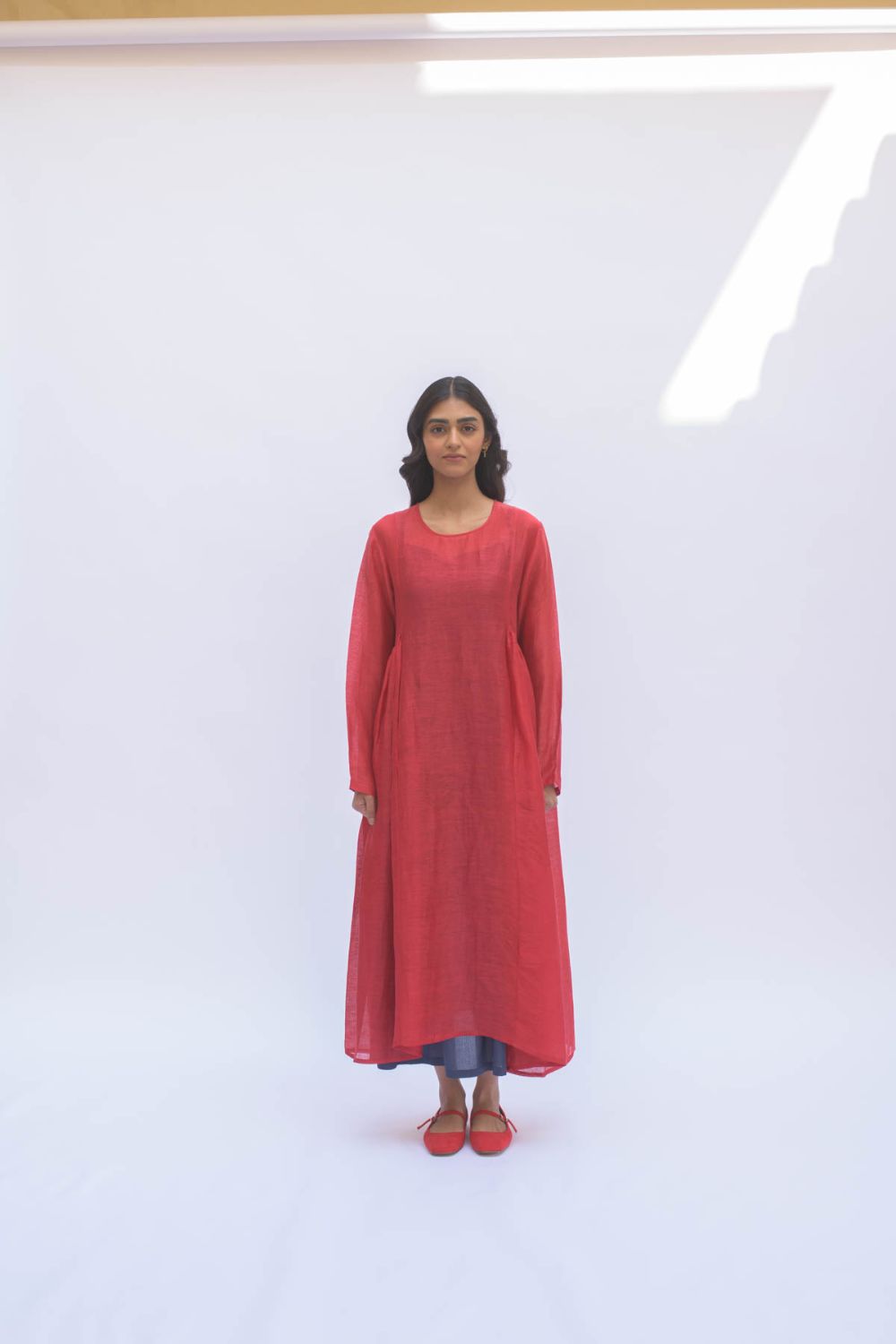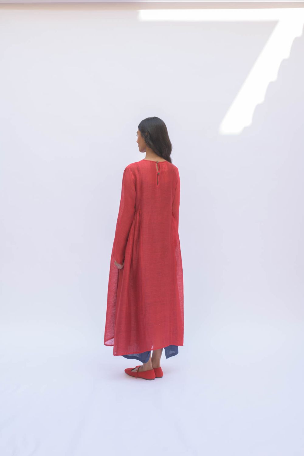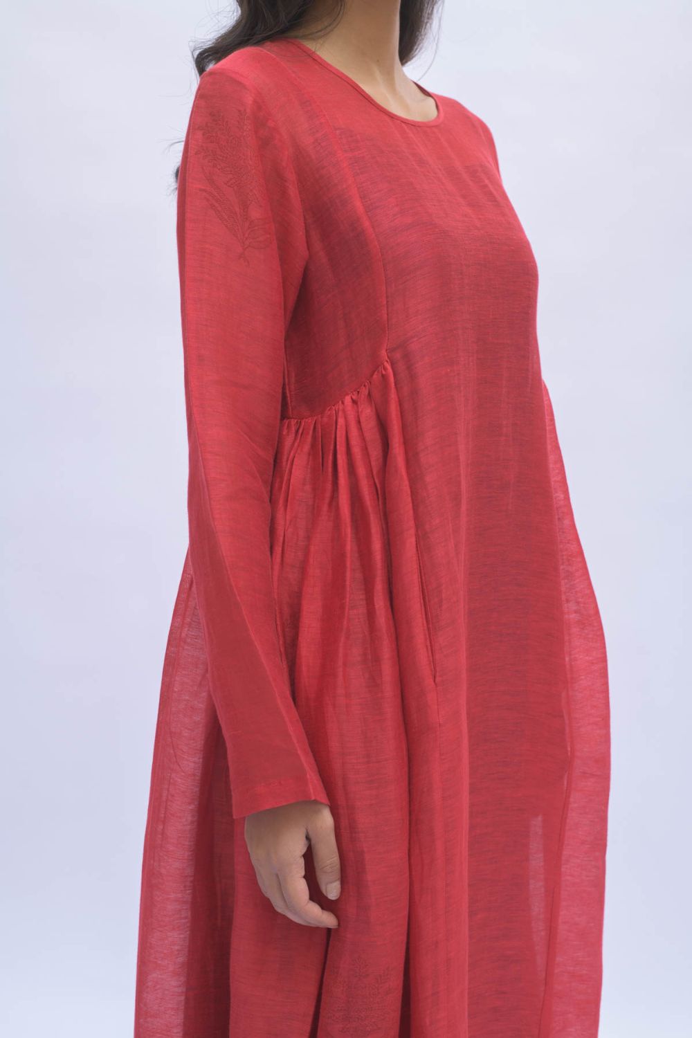 Resham linen (silk linen) hand block printed with a monotone floral motive with a hand moulded metal block .it comes with a red slip dress in cotton .(SET OF 2)