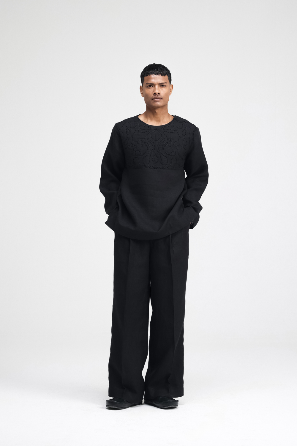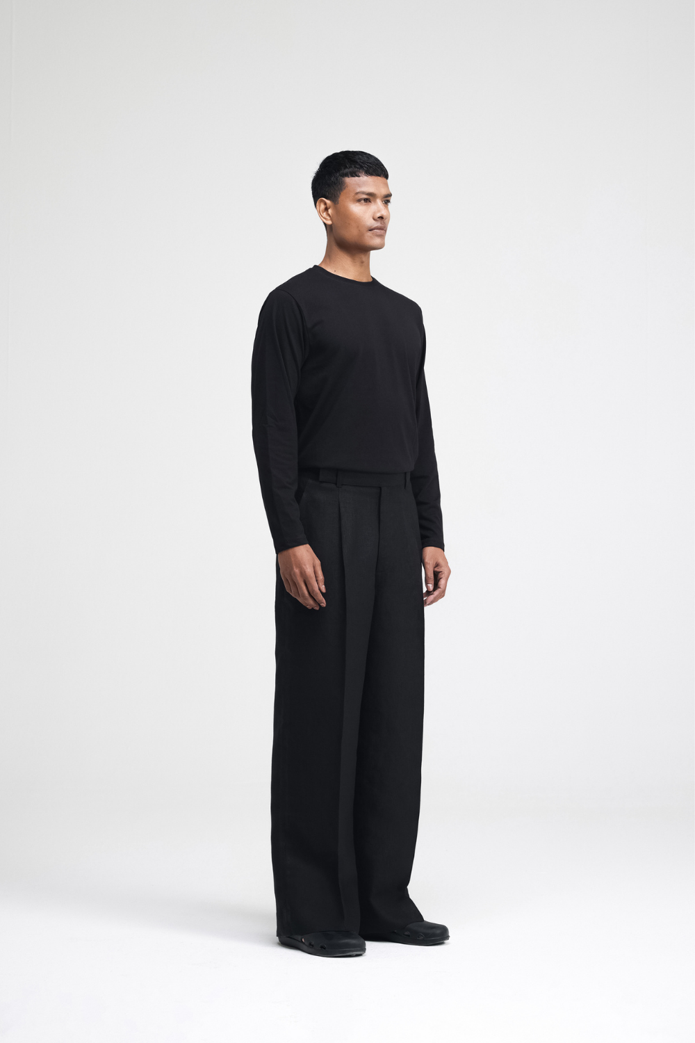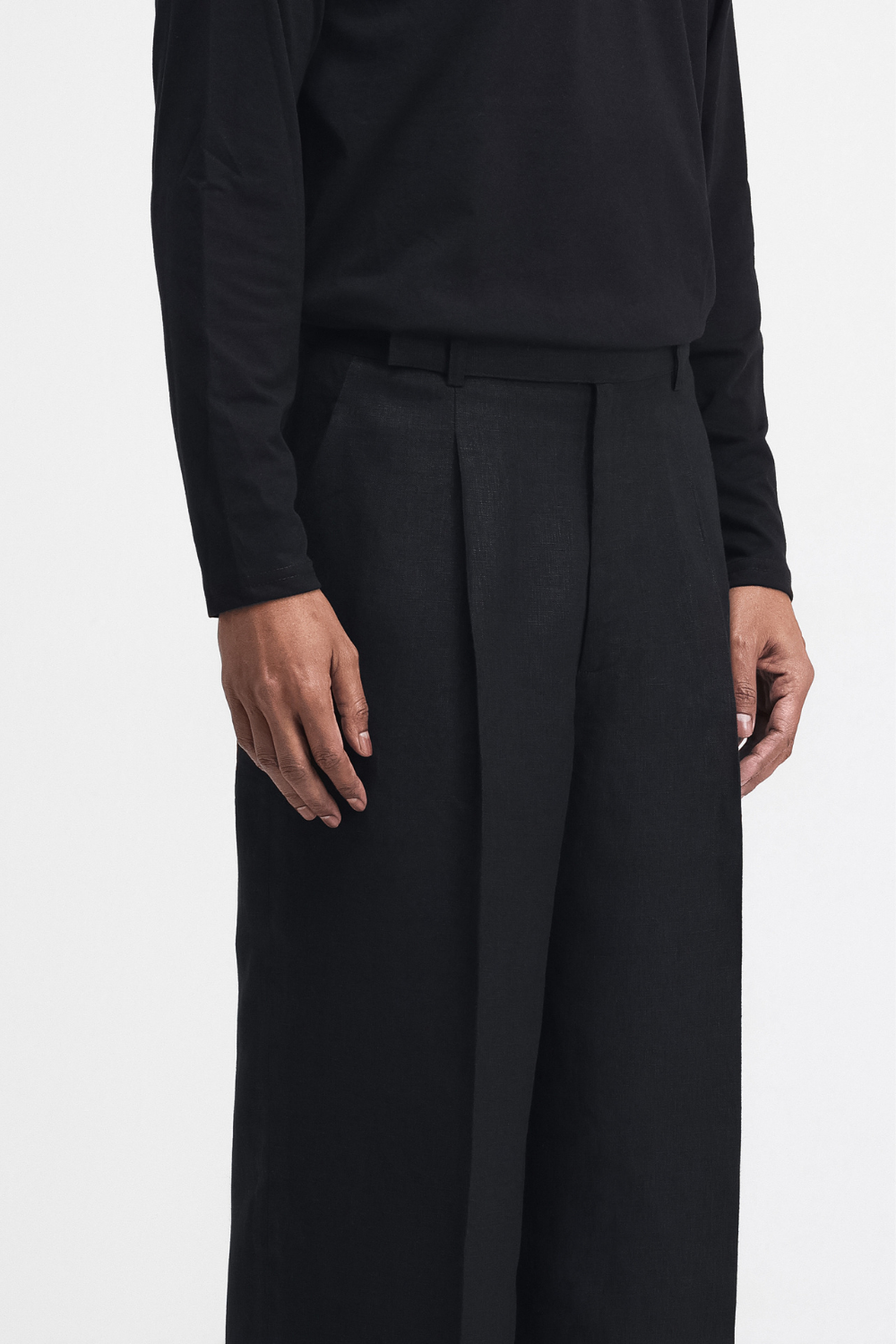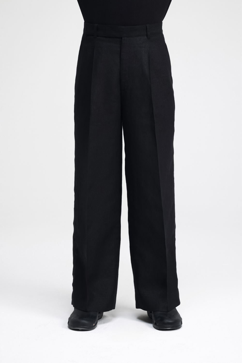 Tailored straight-leg linen pants featuring an extended waistband along with a fly zip and button closure. Designed with back darts and a front pleat for a structured yet comfortable fit, it’s perfect for elevated everyday wear.