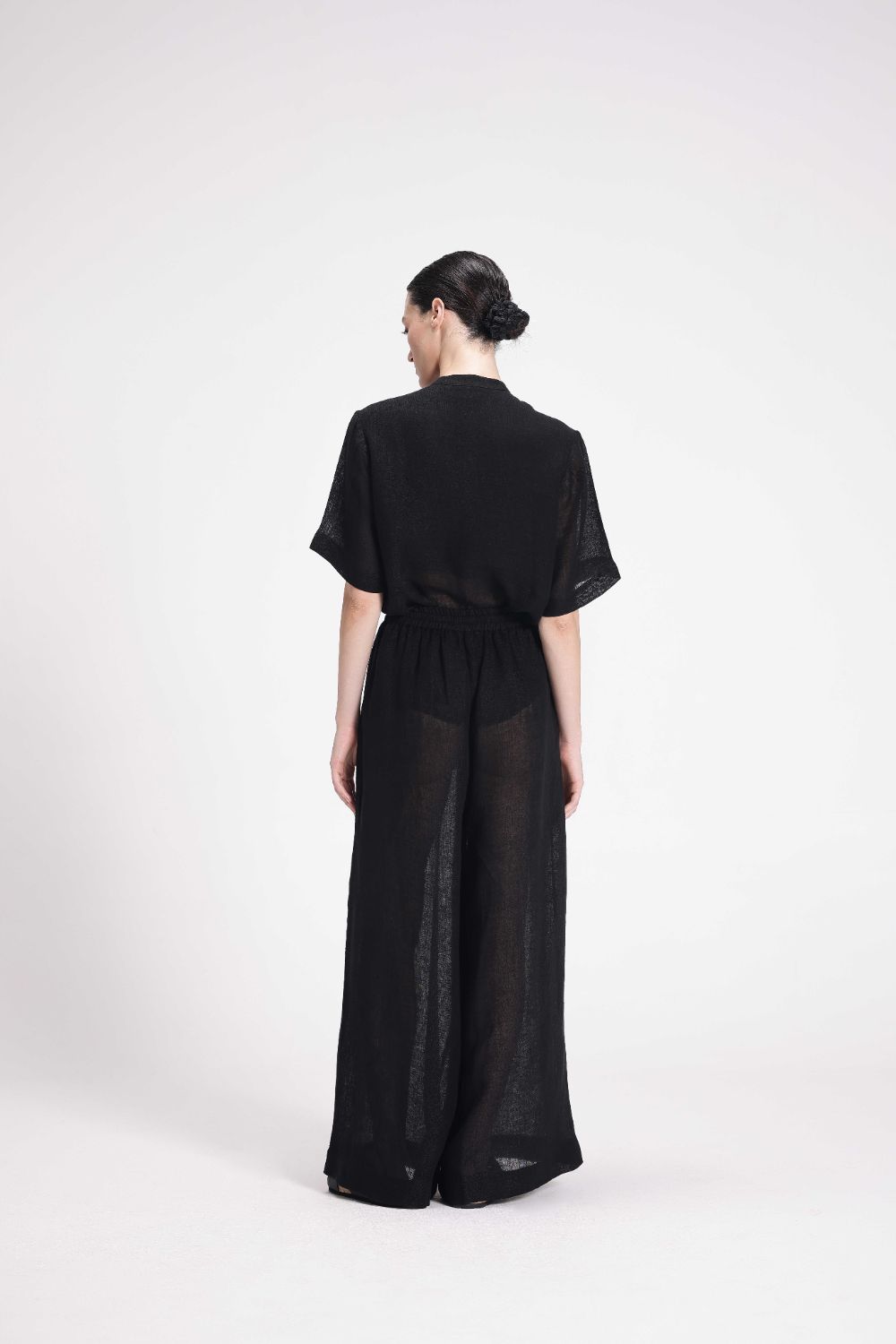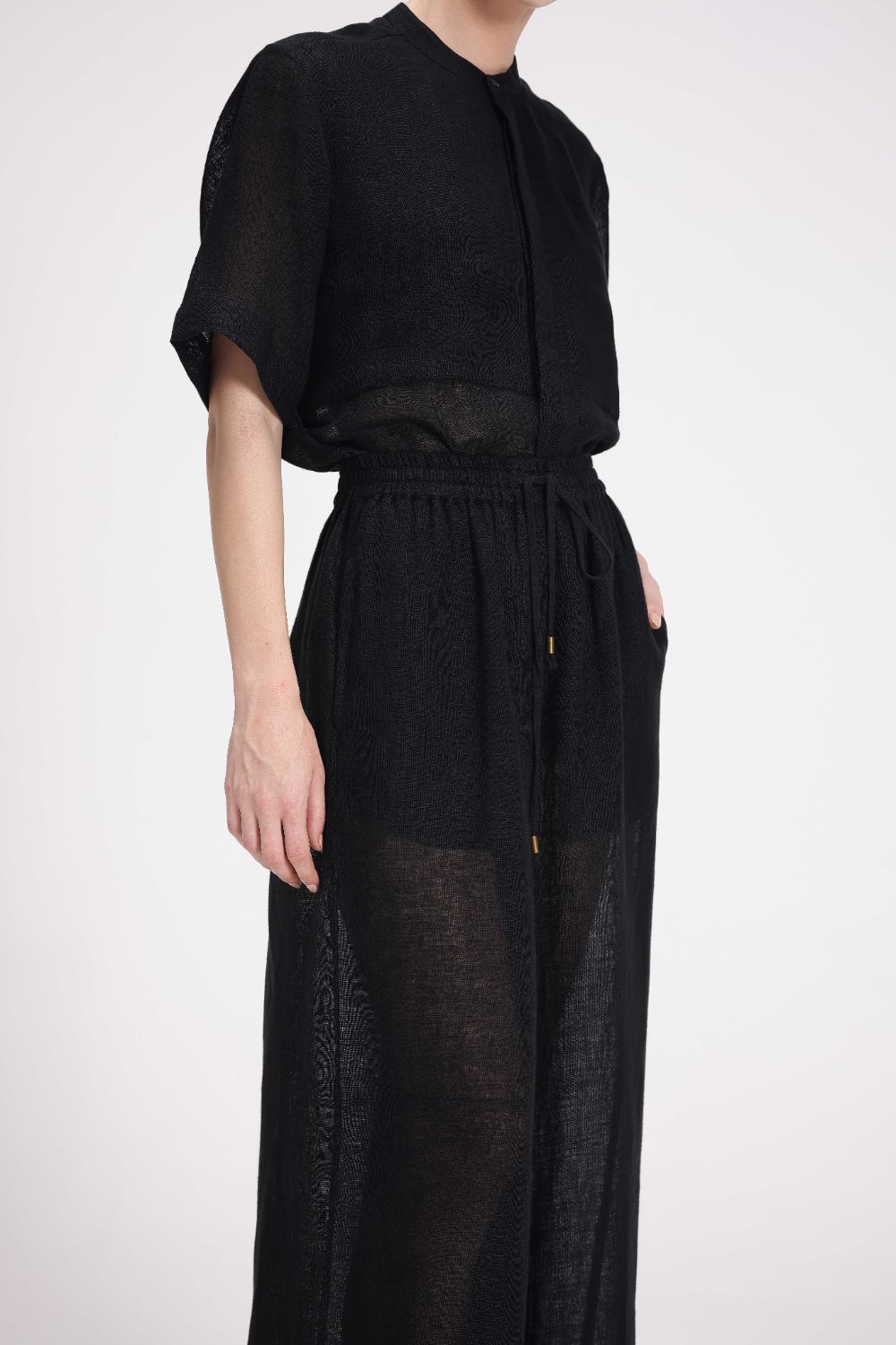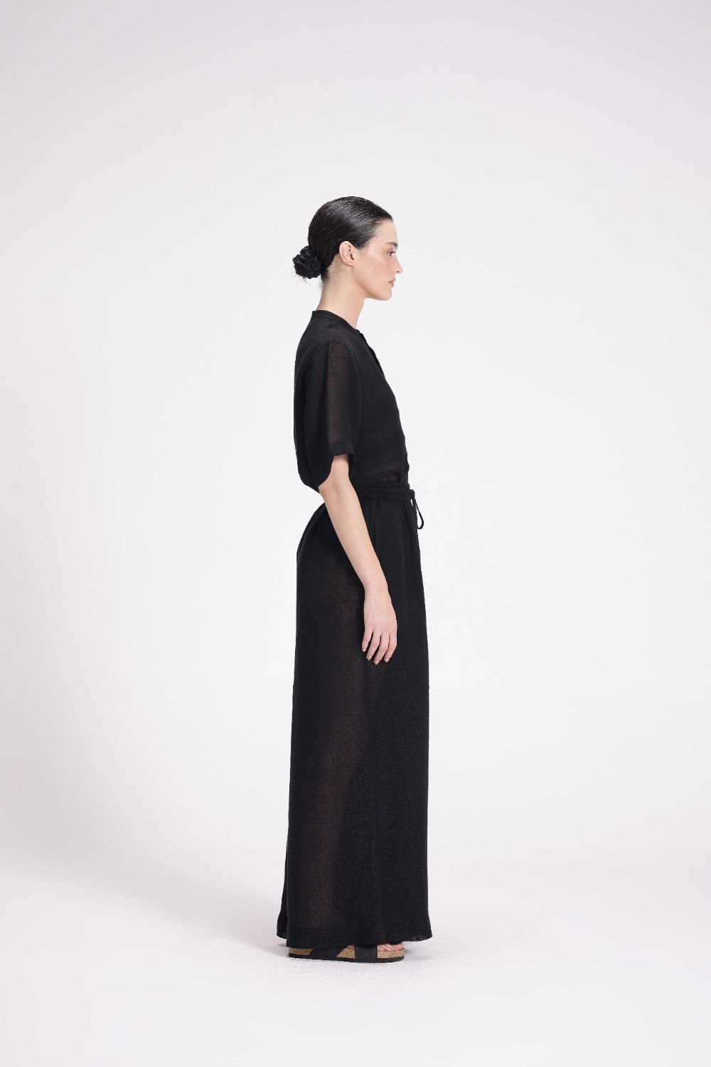 These high-waist, straight pants come with an elasticated waistband and drawstring closure for a customizable fit. Crafted from breathable linen gauze, they also include convenient side seam pockets for added utility.