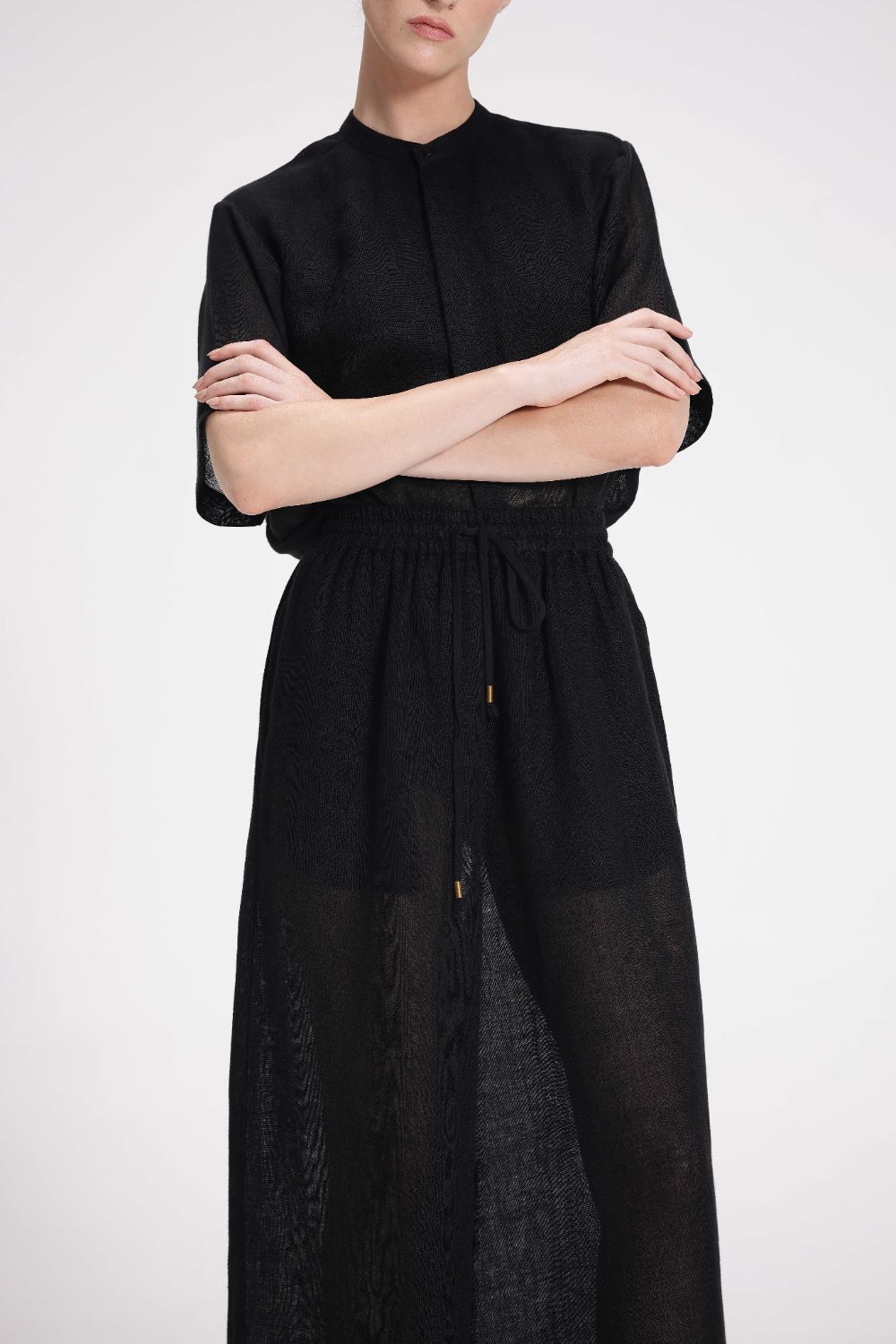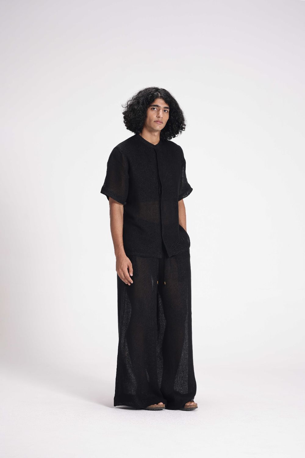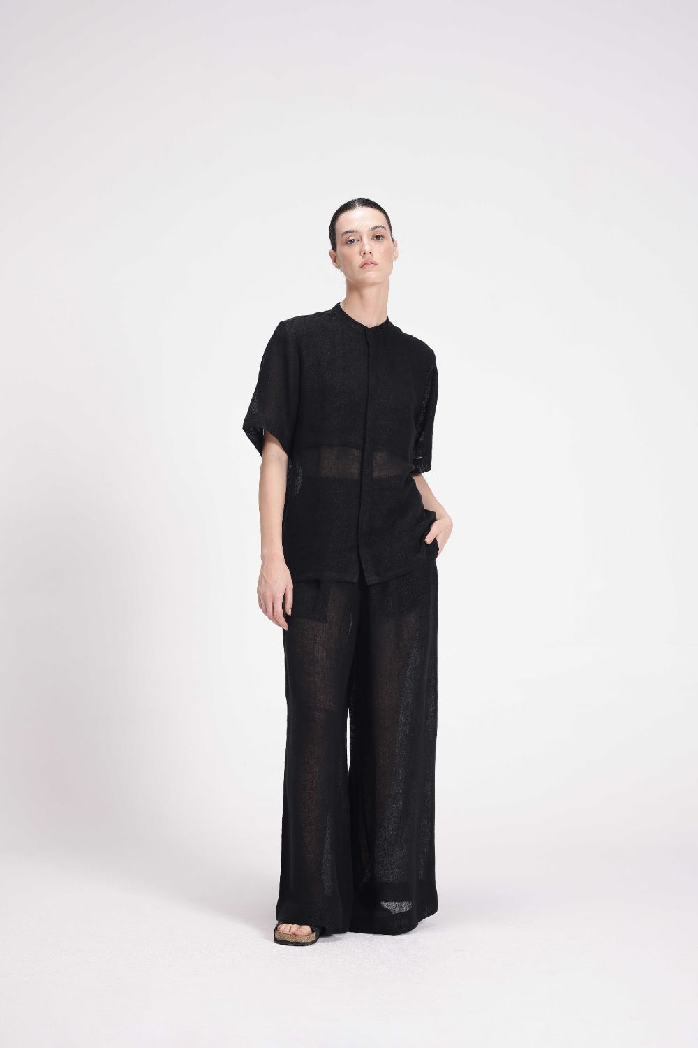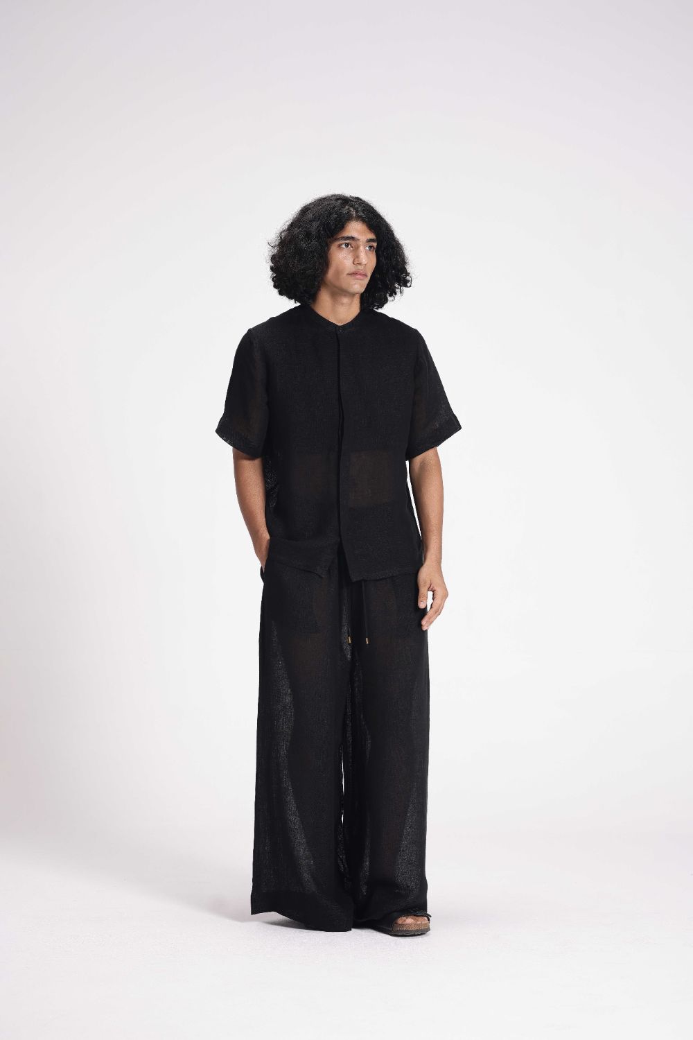 These high-waist, straight pants come with an elasticated waistband and drawstring closure for a customizable fit. Crafted from breathable linen gauze, they also include convenient side seam pockets for added utility.