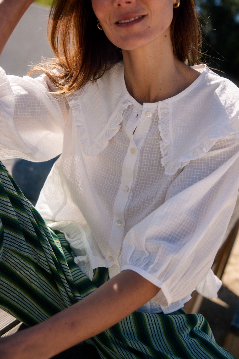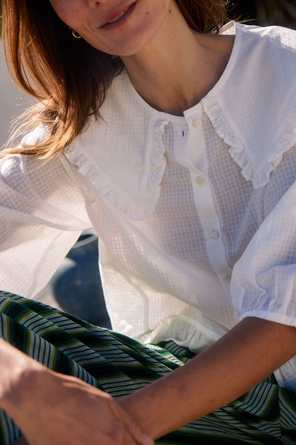 Featuring a statement ruffled collar and gently flared hem, this piece feels refined yet romantic. The airy handwoven cotton gives it a quiet texture, while the clean button placket keeps it grounded.