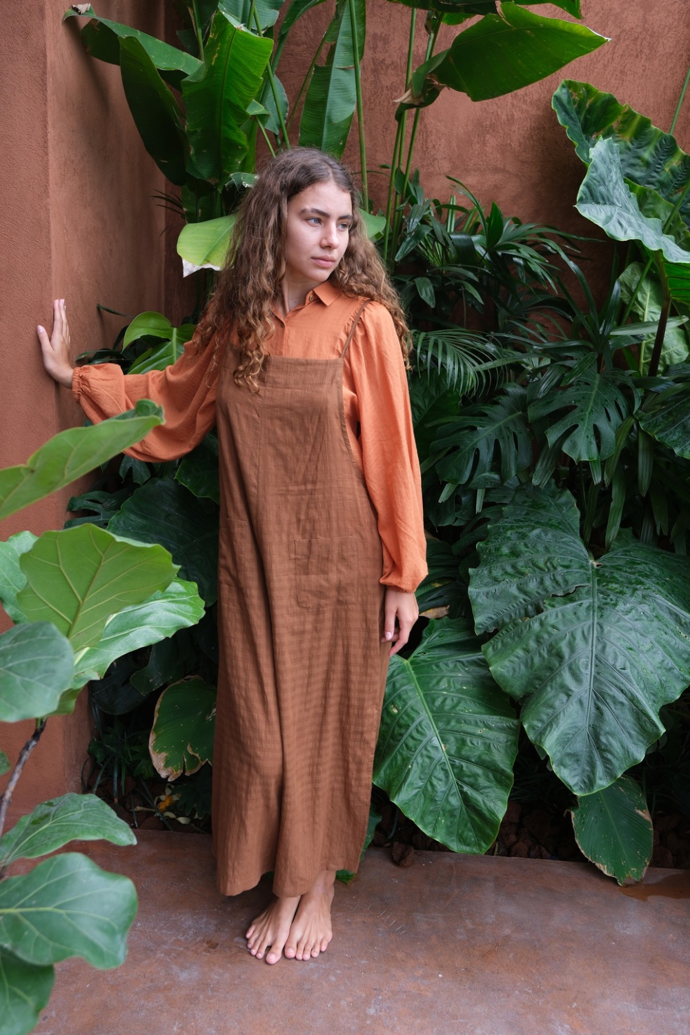 This work-boy’s dungarees are made in collaboration between Audrey E Leary and World of Crow. The brown color and the self chefs give the dungarees a retro look, making it perfect for a day out or a day in for your everyday life.