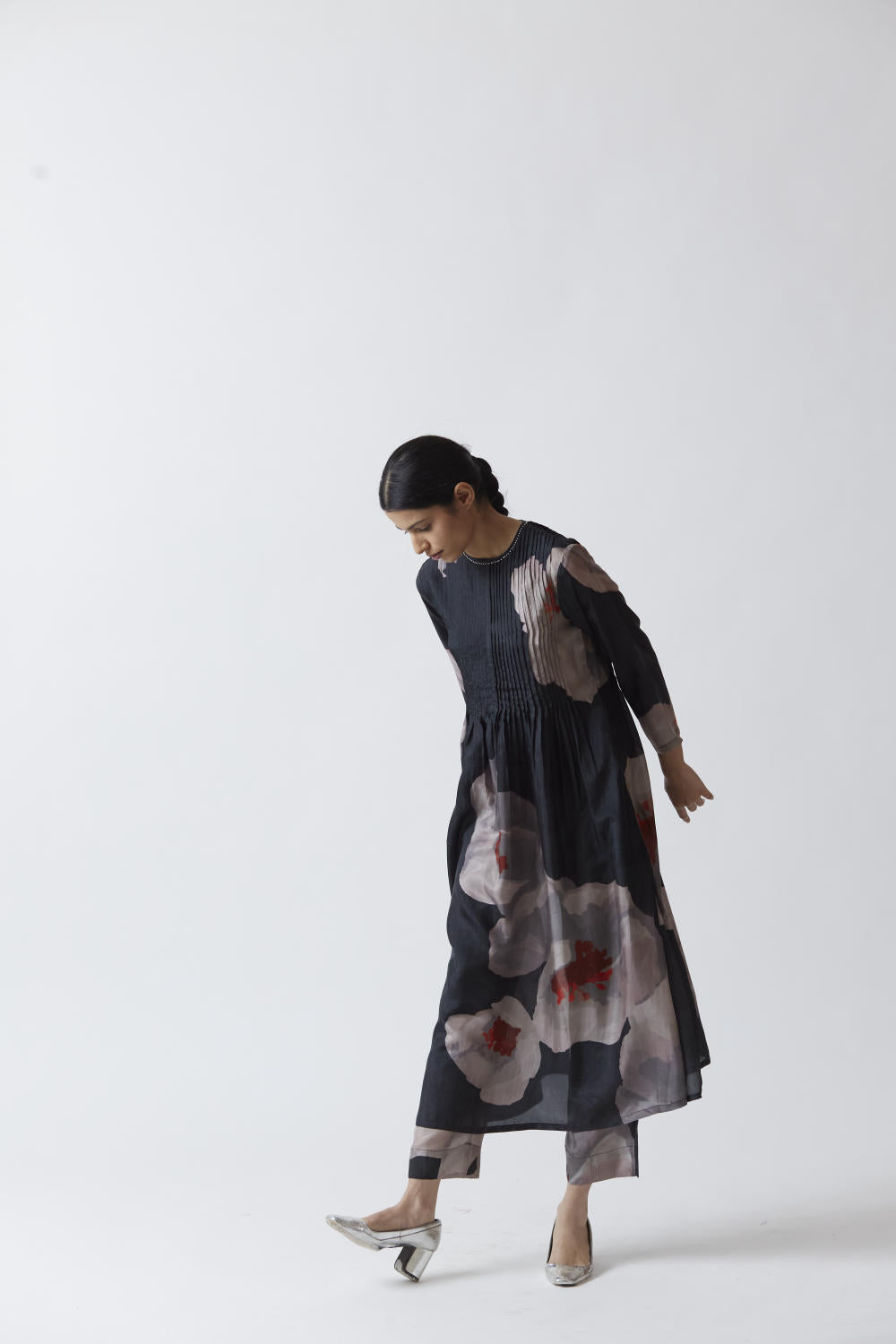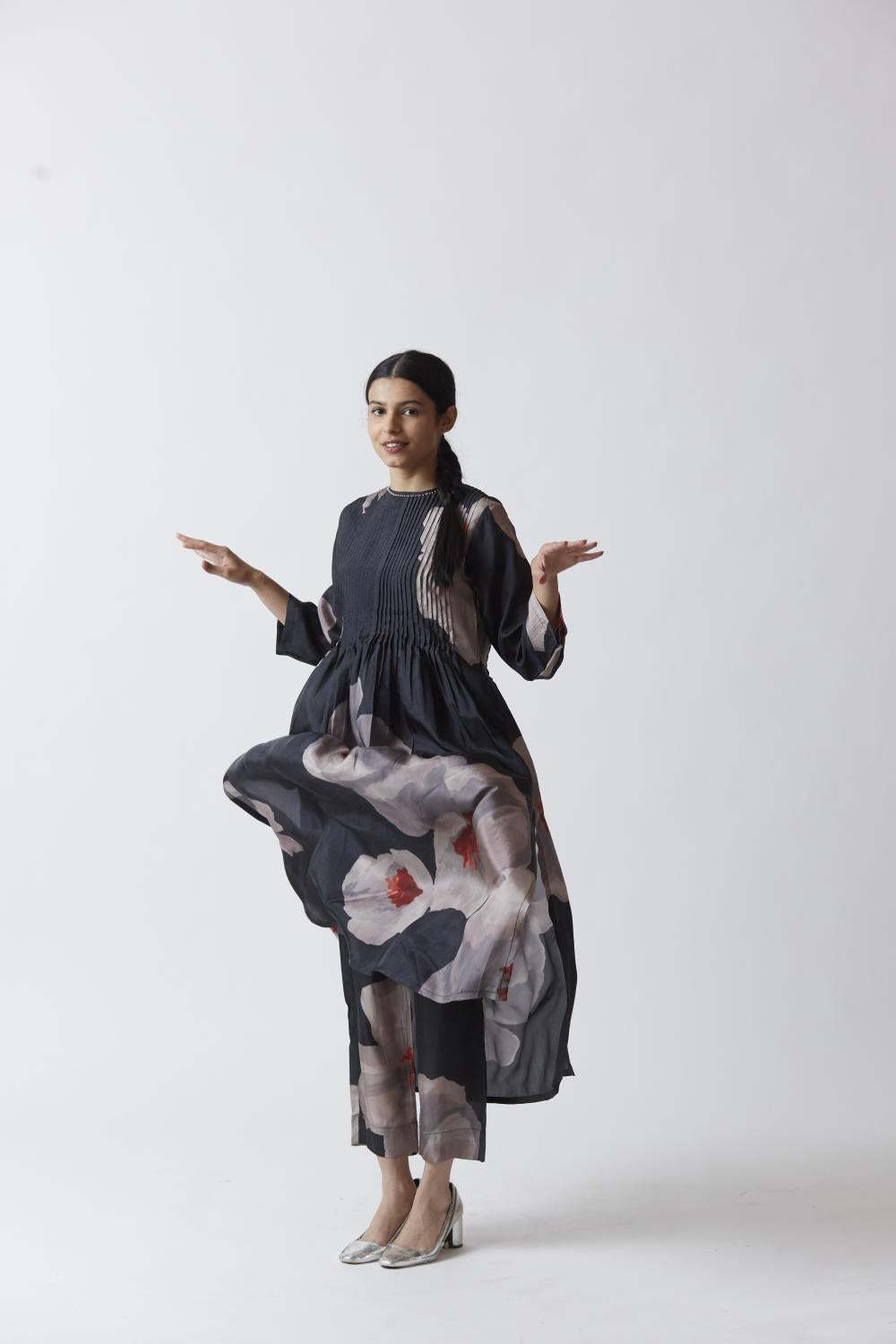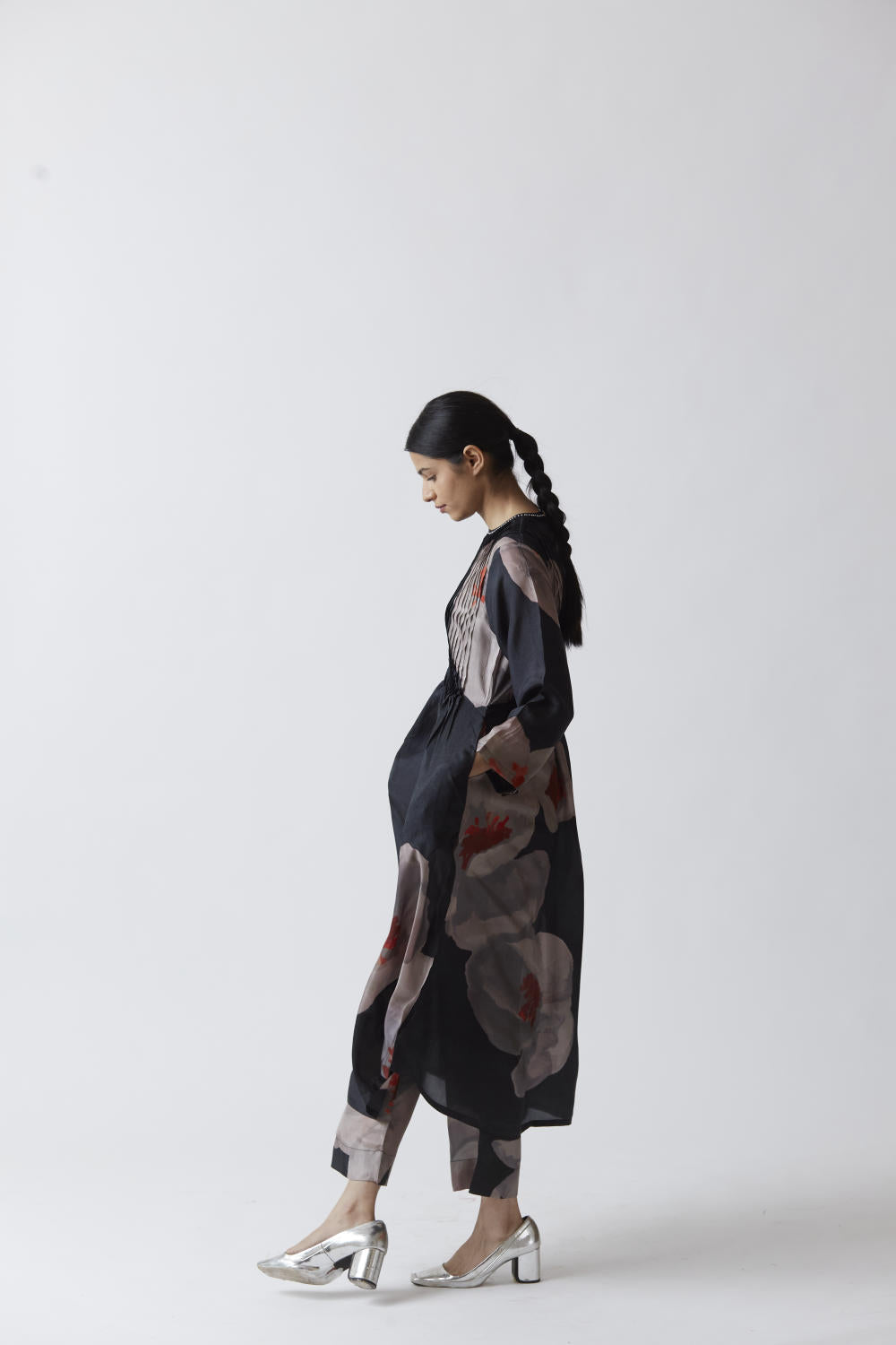 Pure silk printed kurta in black with straight full sleeves. It is