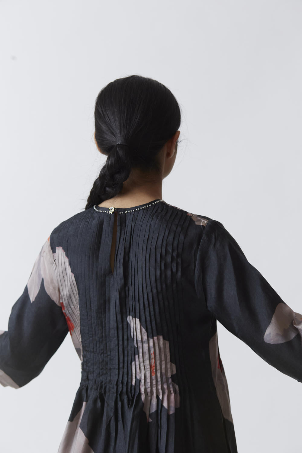 finished with pintucks in front and back with pearls on the neck.
